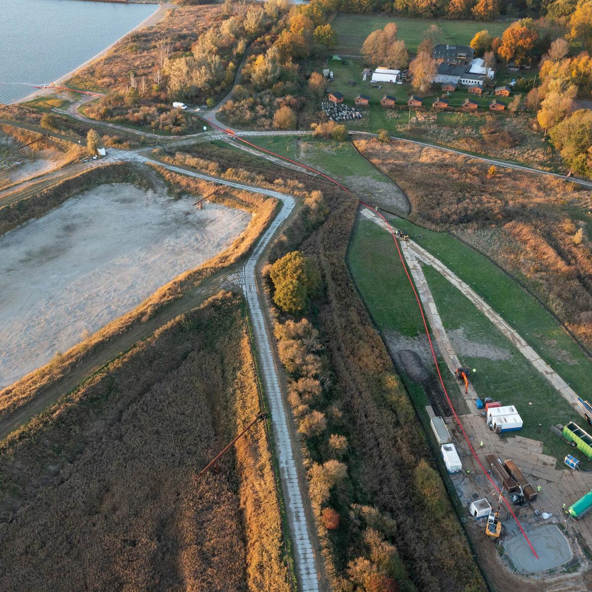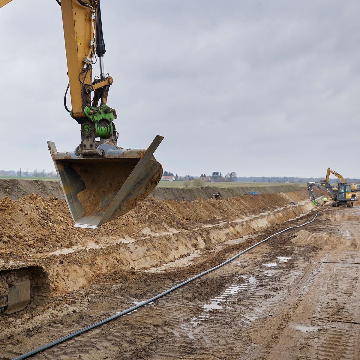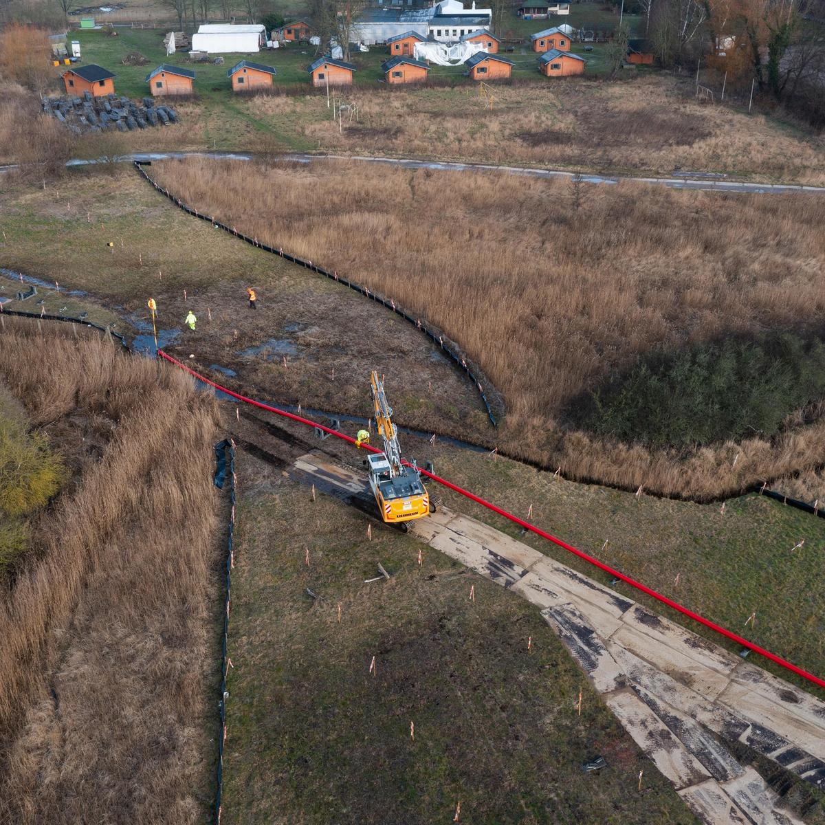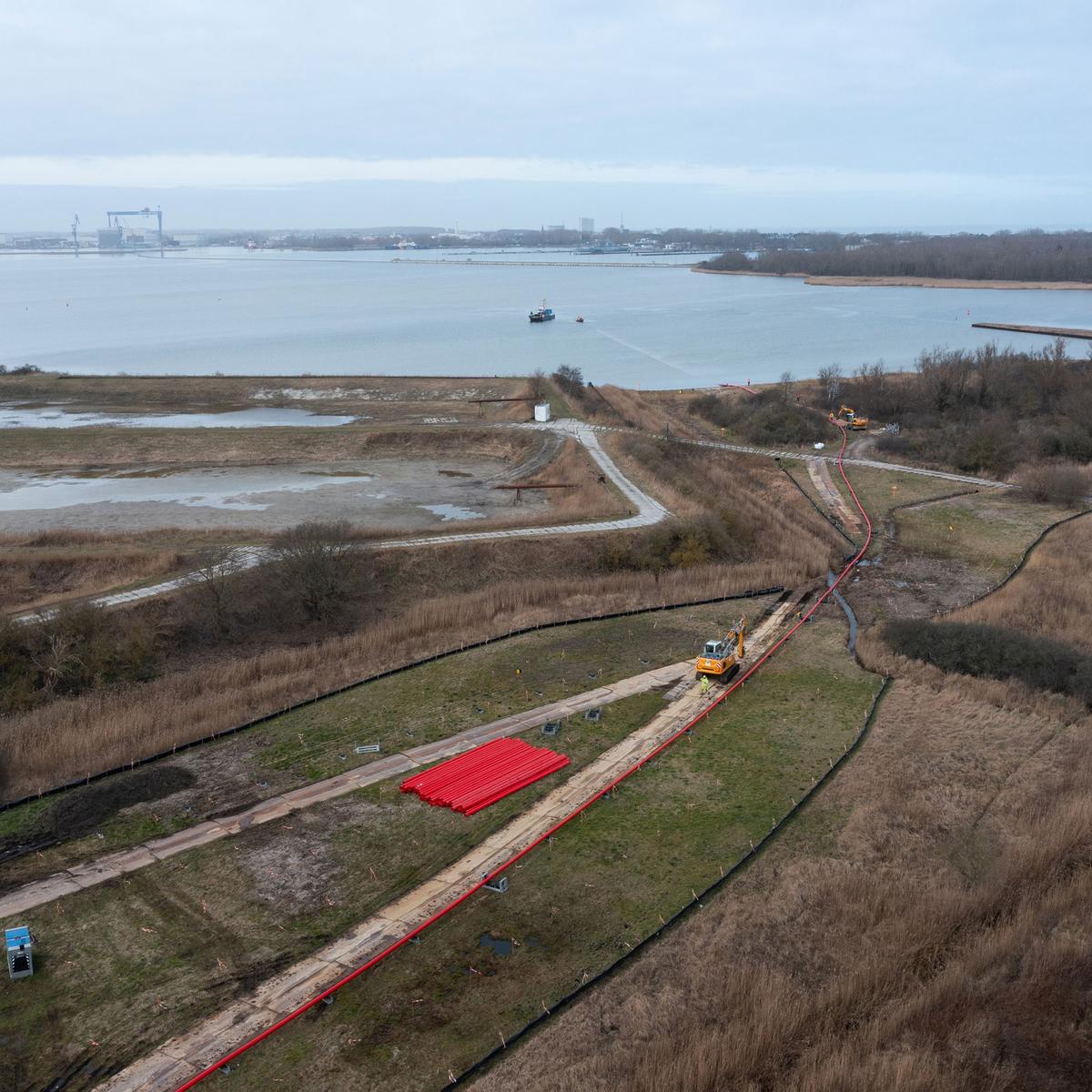 Bei laufendem Betrieb der vorhandenen 400 kV Kabeltrasse KONTEK haben die Energieinfrastruktur-Spezialisten im Raum Rostock auf einer Länge von 14 km – teilweise in einem Abstand von nur wenigen Metern – parallel die neue KONTEK-Kabeltrasse errichtet. 9 km davon wurden in 22 HDD-Bohrungen in geschlossener Bauweise gebaut. Zwei der HDD-Bohrungen mit einer Länge von 750 bzw. 950 m, eine davon in ca. 26 m Tiefe unter dem Breitling hinweg.