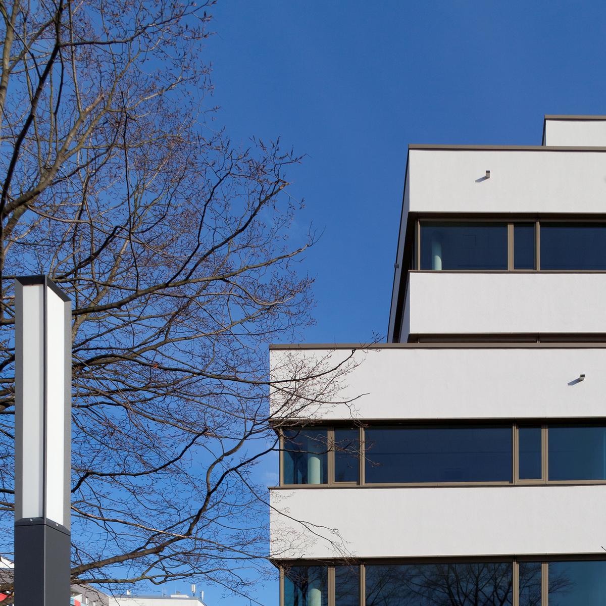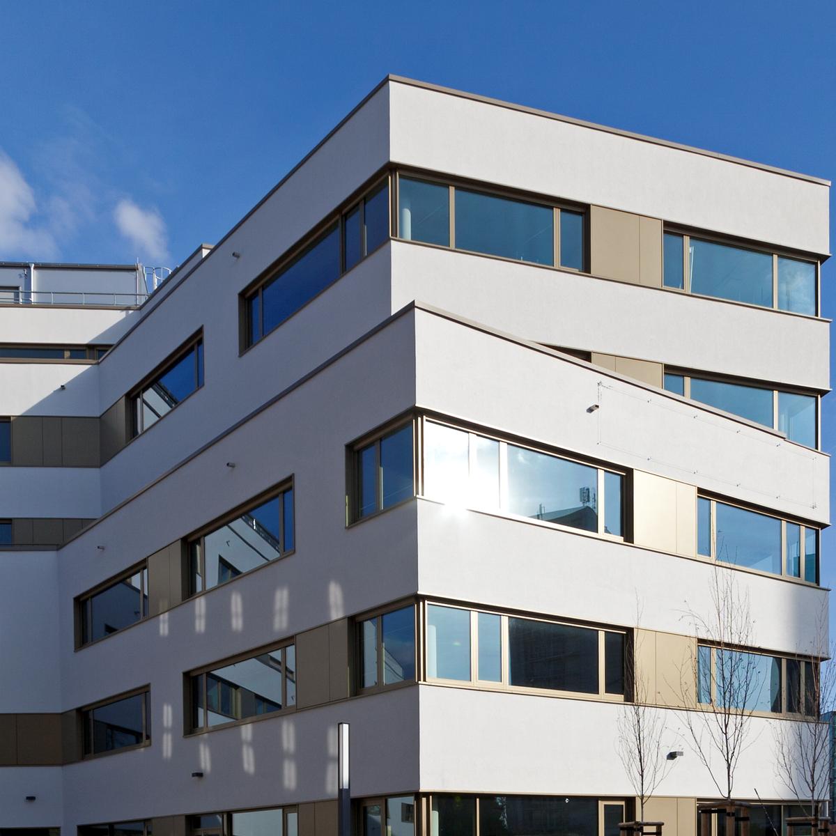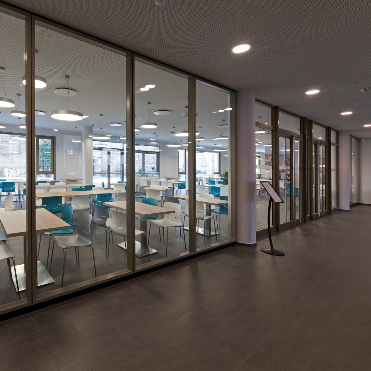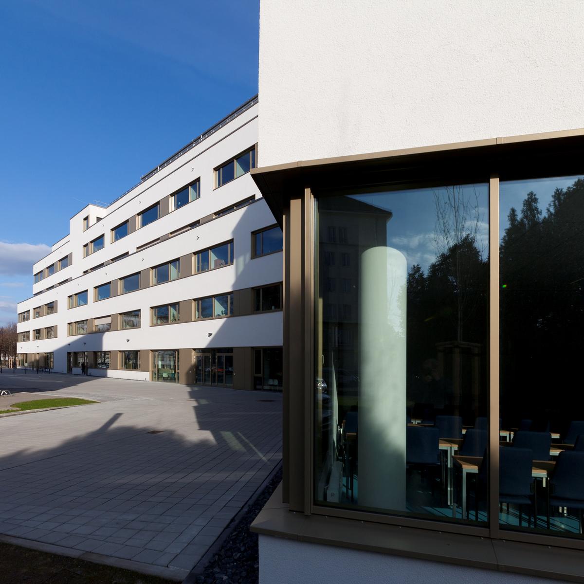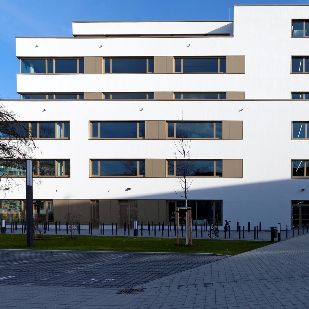 Schlüsselfertiger Neubau des 6-geschossigen Schul- und Verwaltungszentrums mit einer hochwertigen Alu-Glas-Fassade. Neben Seminarräumen und Hörsälen ist dort auch eine Mensa untergebracht. Der Kunde profitierte hier von den Lösungen, die der Köster Geschäftsbereich Bautechnik und Innovation (BTI) bereits bei der Angebotserstellung entwickelt hat. Zudem wurde zur Optimierung des Bewehrungsstahlverbrauches ein statisches 3D-Modell erzeugt.