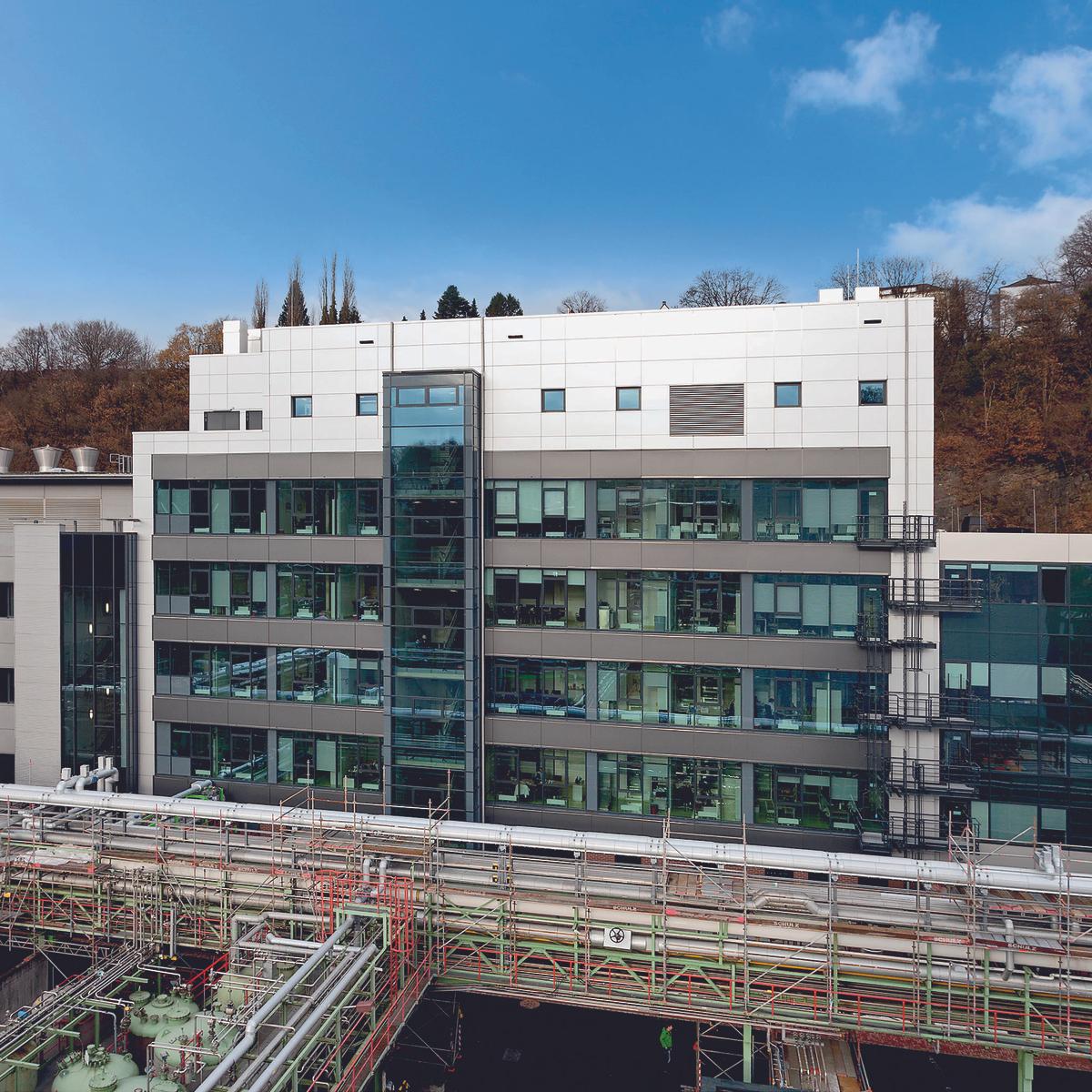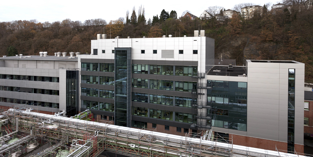Für das Werk Elberfeld der Bayer Pharma AG in Wuppertal realisierte Köster den Neubau eines achtgeschossigen Laborgebäudes. Der 32 m hohe Neubau schließt eine Baulücke, die nach dem Rückbau zweier Gebäude entstanden war. Der Auftrag umfasste neben Tief- und Rohbauarbeiten auch die Erstellung von Dach und Fassade sowie die Hauptgewerke des nichttechnischen Ausbaus. Die notwendige Bohrpfahlgründung erfolgte dabei von der ehemaligen Kellersohle aus und integrierte die Außenwände der Bestandsgebäude. Die Gestaltung der Fassade verbindet mit Verblendmauerwerk, Glas- und Metallbauteilen den Charme der Industriekultur mit Elementen moderner Architektur.