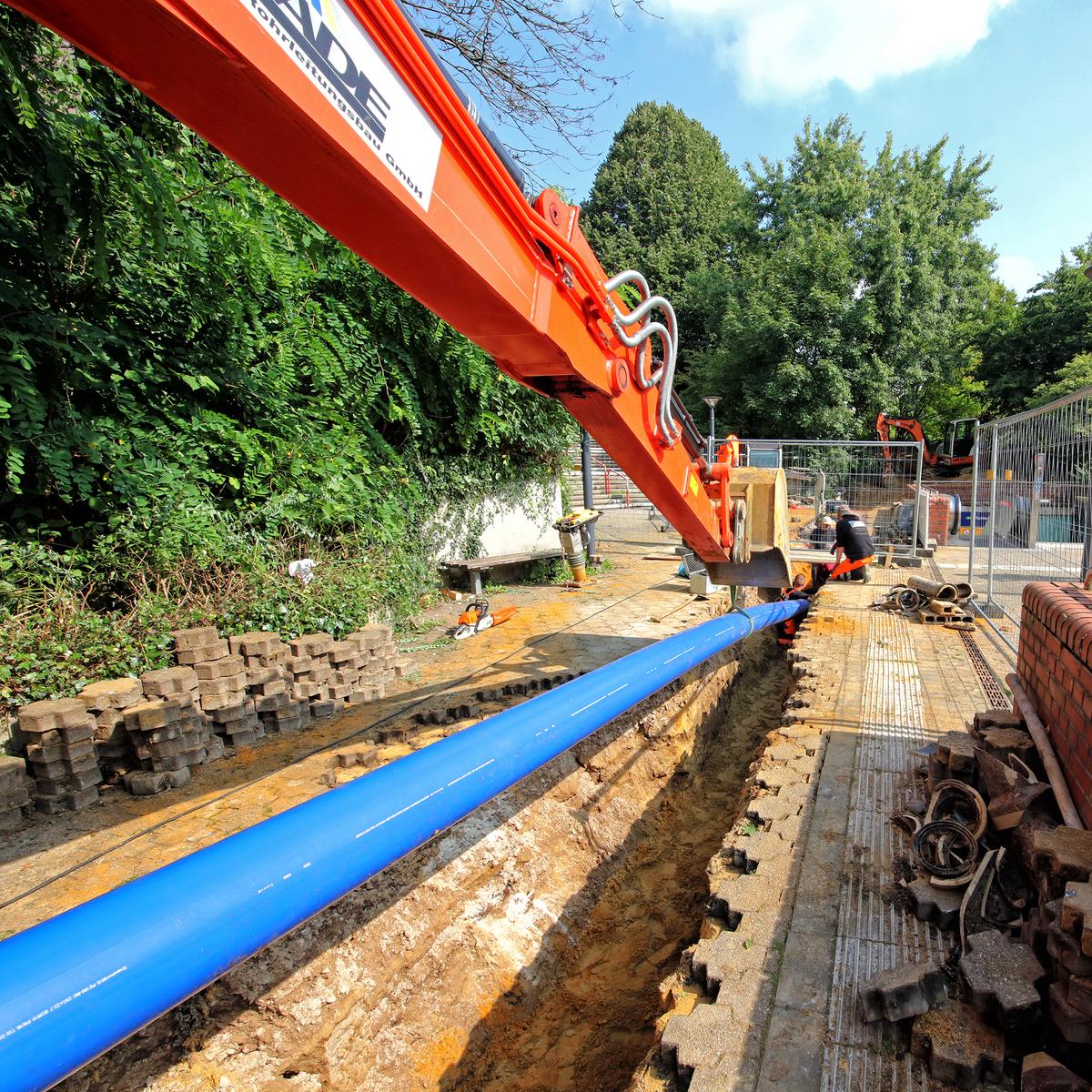 Für die Löschwasserversorgung der TU Dortmund wurden zusammengefasst ca. 1.000 m lange Wasserrohrleitungen PE 100 SDR 11 (PN16) in DN 125, DN 150 und DN 200 verlegt. Weiterhin wurden die dafür notwendigen Tiefbauarbeiten durchgeführt sowie sieben Überflurhydranten in DN 100 nach DIN EN14384 inkl. Vorschieber gesetzt.