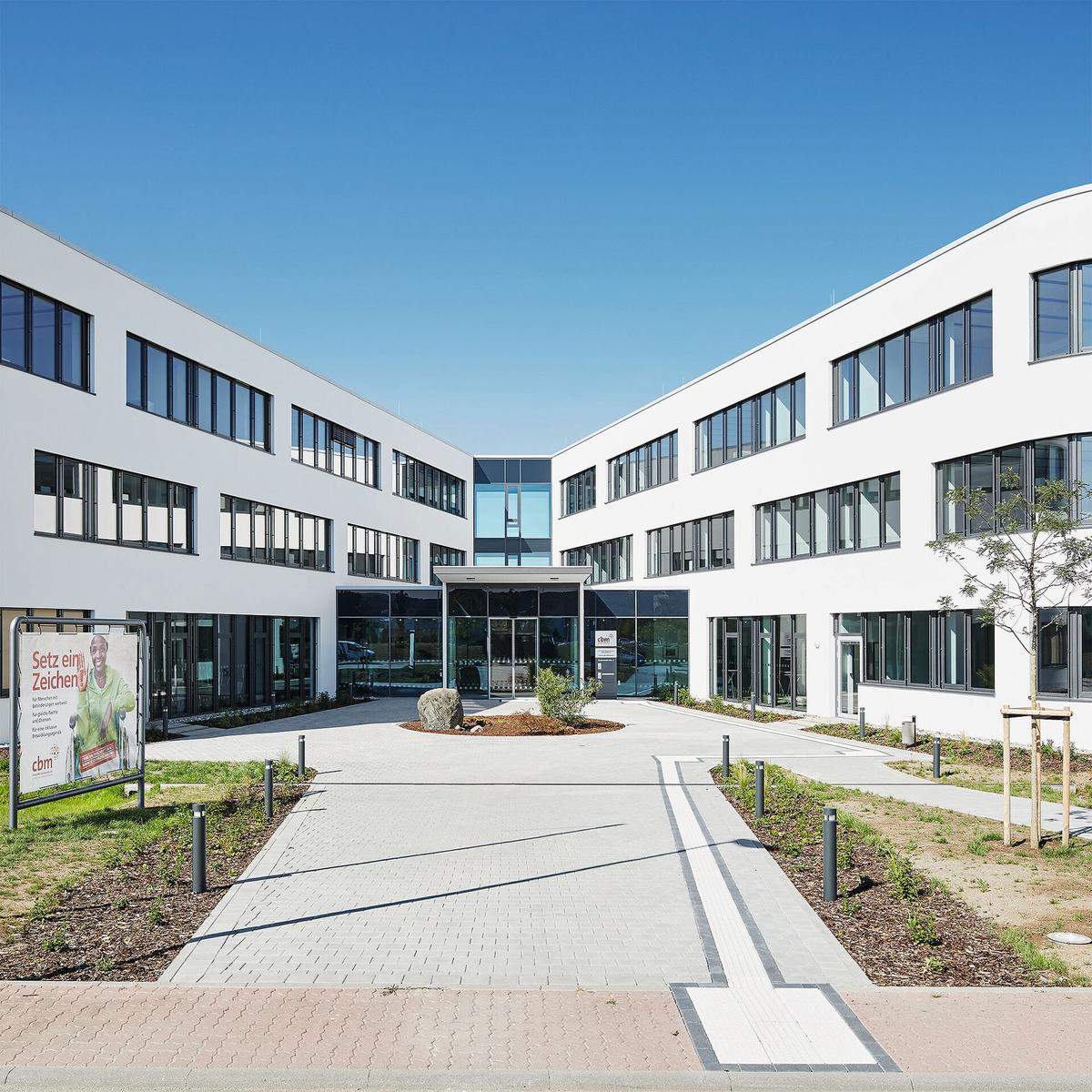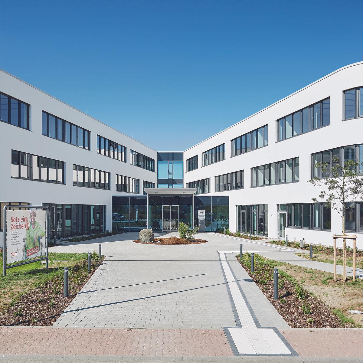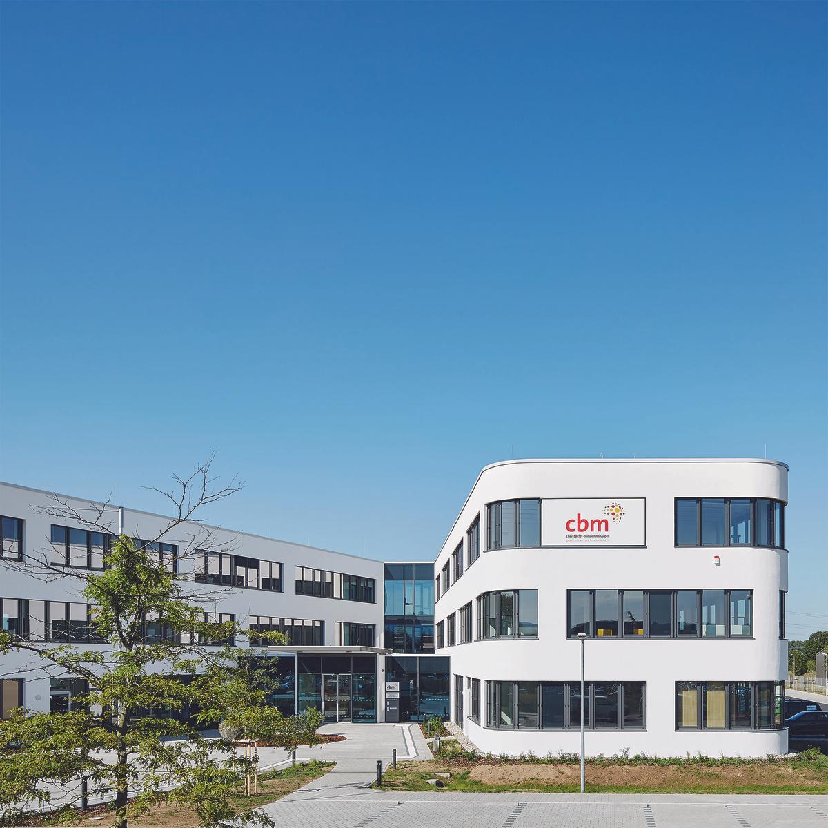 Schlüsselfertiger Neubau eines barrierefreien Verwaltungsgebäudes mit Büros, Konferenzräumen, Cafeteriabereich und Andachtsraum nach dem Planen-Bauen-Prinzip. Die Architektur der neuen Verwaltung der Christoffel-Blindenmission Deutschland e.V. (CBM) in Bensheim (südlich von Darmstadt) vereint höchste Anforderungen an die Barrierefreiheit mit einer lebendigen und offenen Arbeitsatmosphäre. Auf der einen Seite erleichtern Induktionsschleifen, taktile Bodenindikatoren und stufenlose Zugänge Mitarbeitern und Besuchern den Alltag, auf der anderen Seite verbessern offene Arbeitsplätze, Gemeinschaftsbereiche und großzügige Verglasungen Kommunikation und Transparenz. Das Kompetenz-Center Sozialimmobilien Süd erstellte den schlüsselfertigen Neubau für das barrierefreie Gebäude inkl. sämtlicher Planungsleistungen in 15 Monaten.