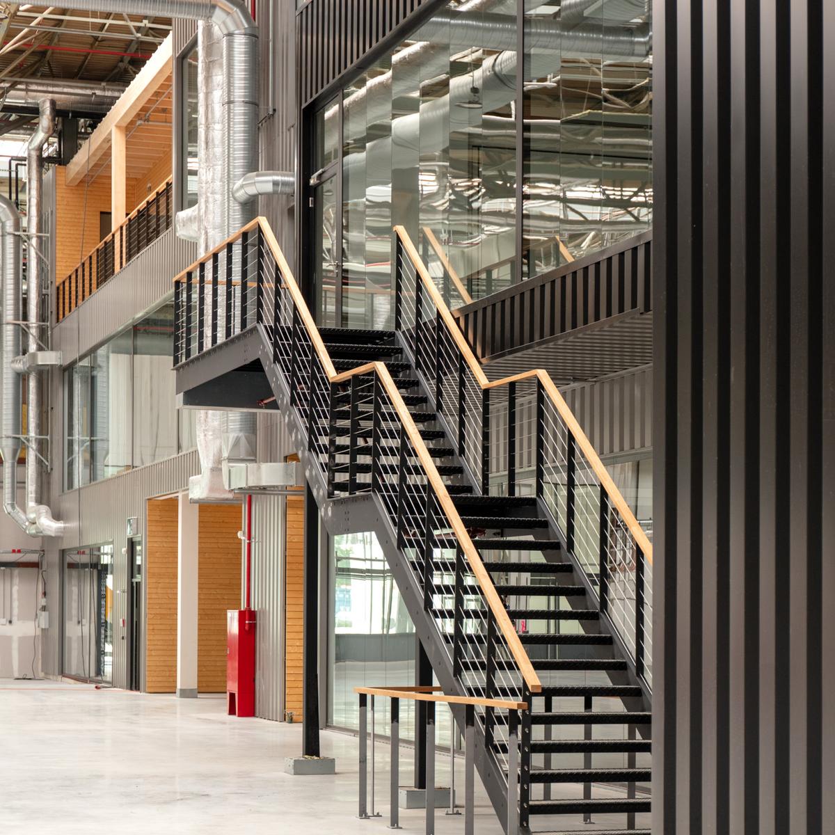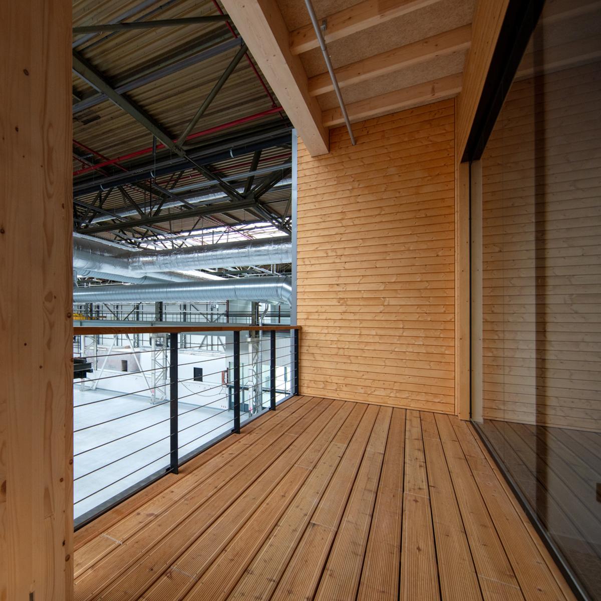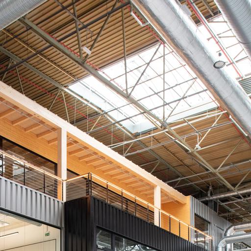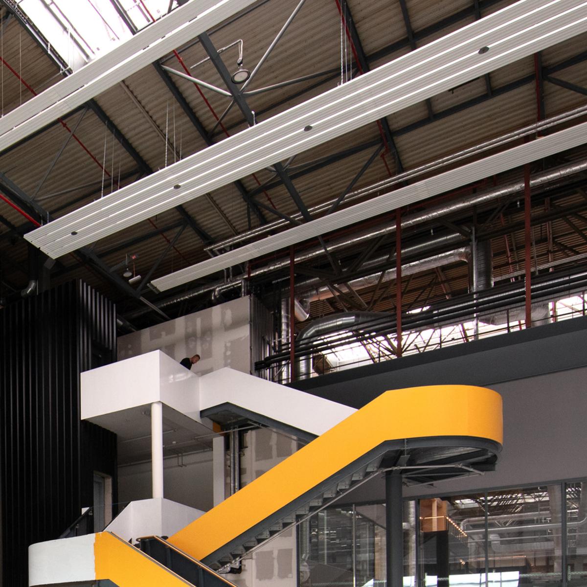 Die in der Vergangenheit für die Produktion von Schleifmaschinen genutzte Bestandshalle mit drei Hallenschiffen erhielt unter anderem zwei neue Bürogeschossebenen, teilweise in Holzhybridbauweise. Kösters Leistungsumfang des erweiterten Rohbaus wurde später um das Los Innenausbau ergänzt, wobei eine enge Verzahnung mittels Last-Planner mit den bauseitigen Gewerken für sämtliche technische Anlagen die termingerechte Übergabe für den mieterseitigen Ausbau sicherstellte.
