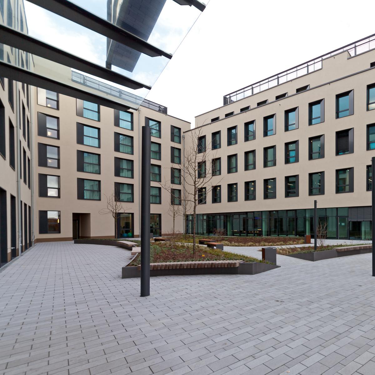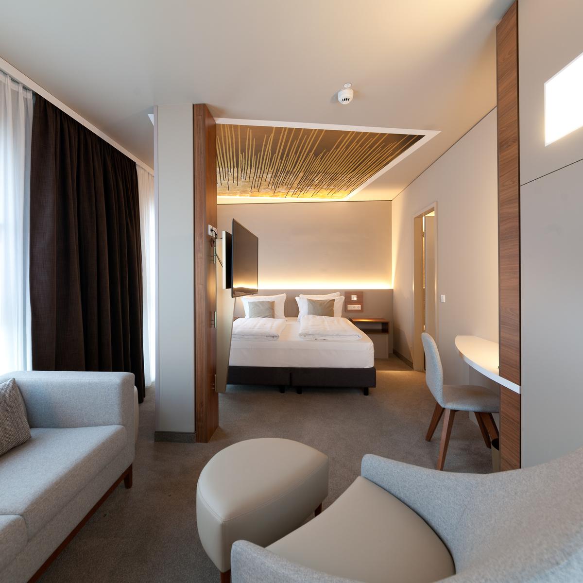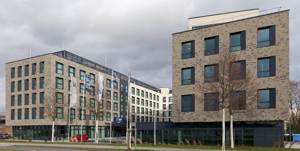 In weniger als 19 Monaten realisierte Köster den schlüsselfertigen Neubau eines Business-Hotels inkl. Tiefbauarbeiten mit 178 modern ausgestatteten Zimmern, einem Fitness- und Wellnessbereich, Büroräumen und Restaurant. Vor allem durch den effizienten Einsatz von maßgenauen Betonfertigteilen für die Außenwände und die Nutzung von Fertignasszellen in den Zimmern, konnten die Kosten gering gehalten und der Baufortschritt gleichzeitig gesteigert werden. Ein Hingucker sind die kunstvoll anmutenden Hotelzimmerdecken, die stilistisch an Freskenmalerei erinnern. Köster konnte während der gesamten Bauphase jegliche Änderungswünsche seitens Mieter und Kunden termingerecht umsetzen.