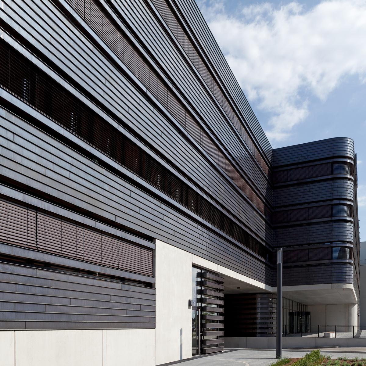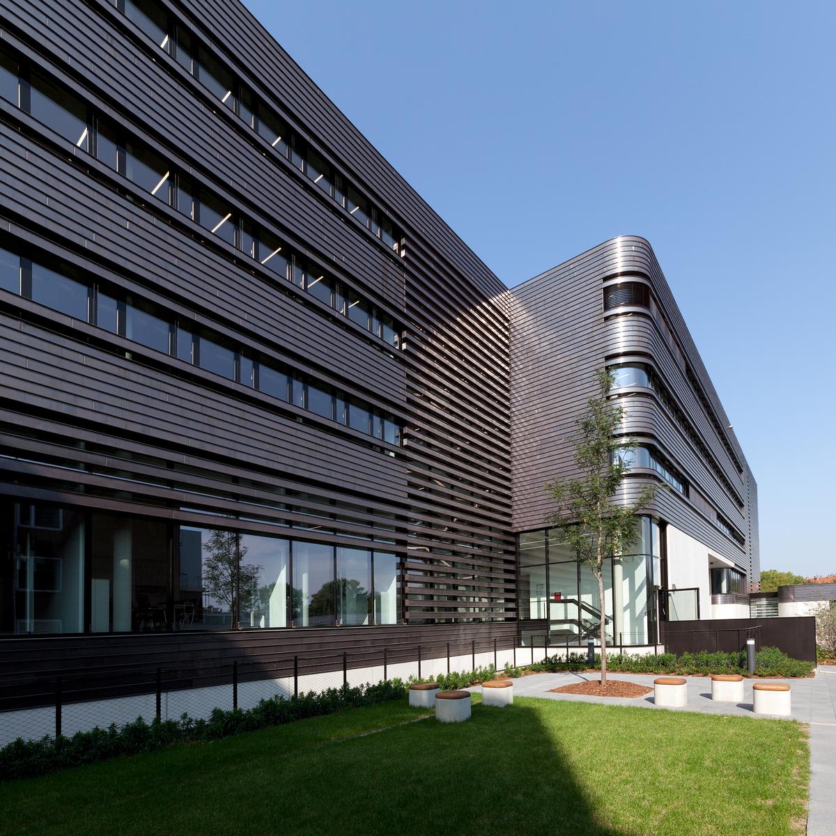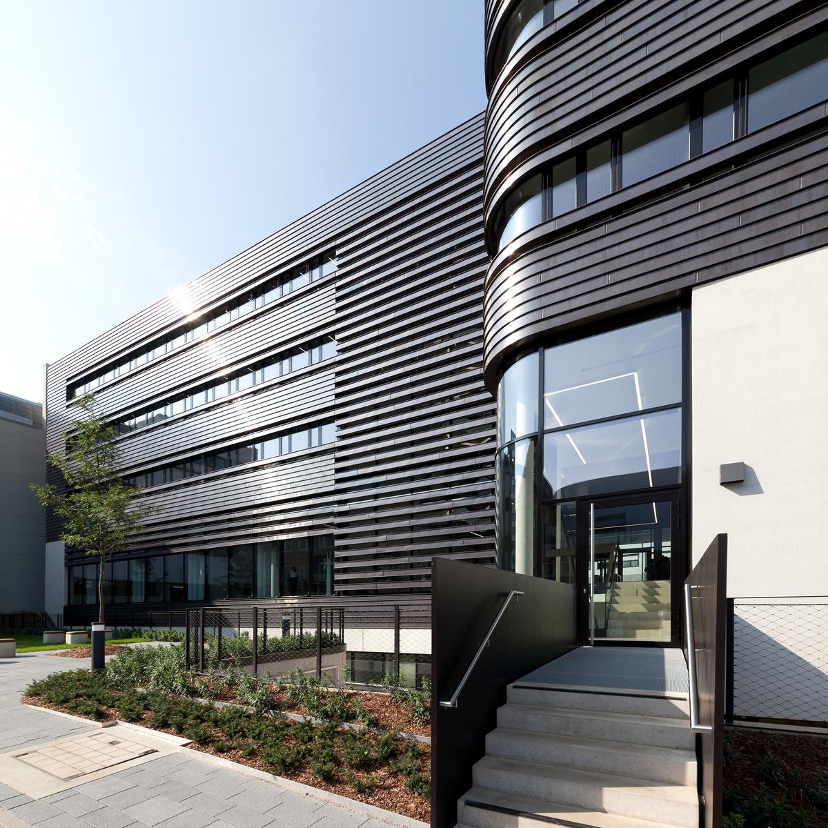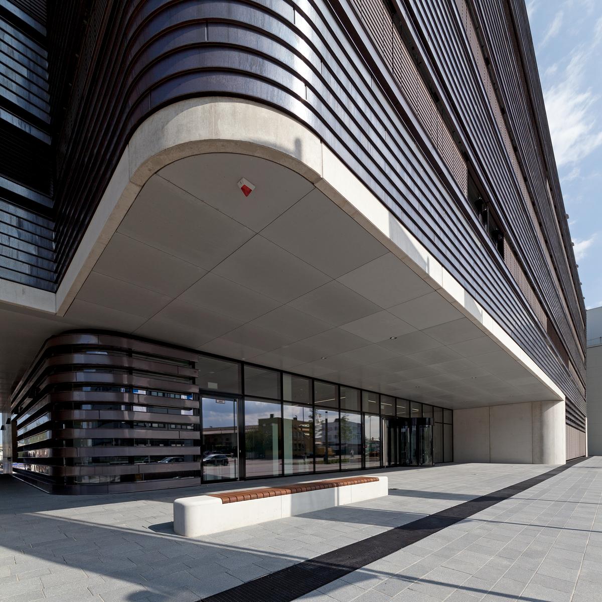Schlüsselfertiger Neubau eines 5-geschossigen Büro- und Verwaltungsgebäudes mit Prüfräumen sowie eines Konferenzzentrums inkl. Tiefbauarbeiten. Durch die teilweise gerundete und zudem sehr detailreiche Fassade aus gerundeten Scheiben und Kupferblech aus voroxydierten, nur 210 mm breiten Kupferscharren stellt die Immobilie eine architektonische Besonderheit dar. Weitere Besonderheiten sind die Technikzentrale im Untergeschoss in einem über 7 Meter hohen Technikraum und der aufwendig gestaltete Innenhof, der über eine zweispurige Gebäudeunterführung zu erreichen ist.