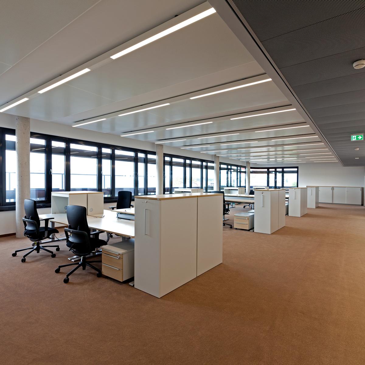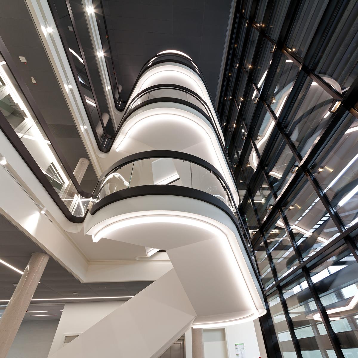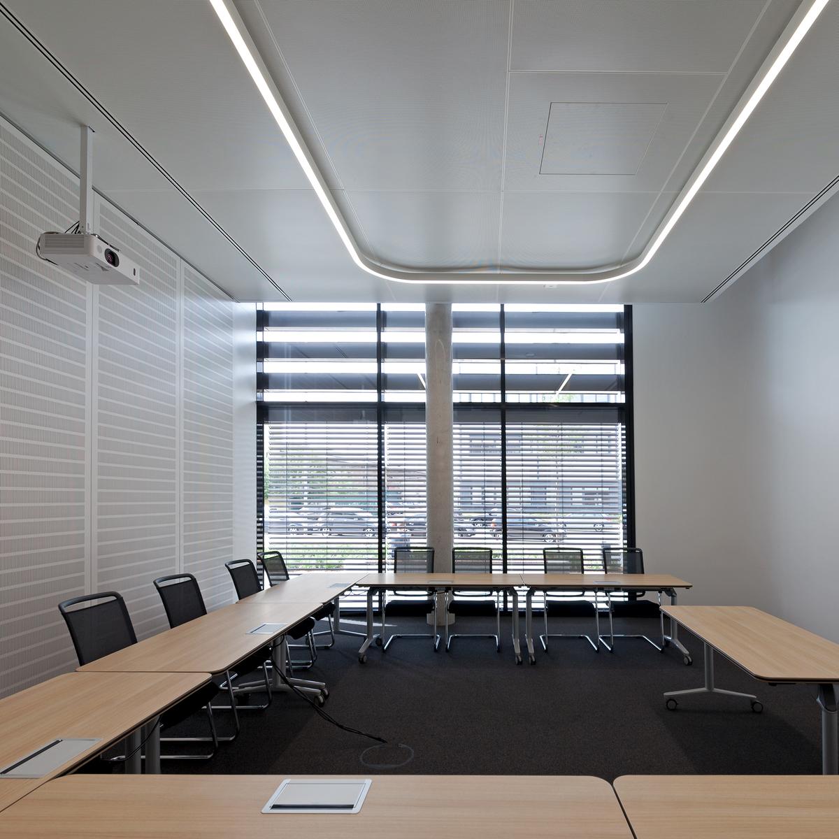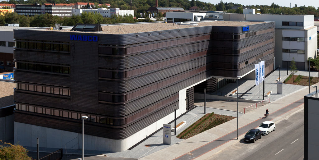Schlüsselfertiger Neubau eines 5-geschossigen Büro- und Verwaltungsgebäudes mit Prüfräumen sowie eines Konferenzzentrums inkl. Tiefbauarbeiten. Durch die teilweise gerundete und zudem sehr detailreiche Fassade aus gerundeten Scheiben und Kupferblech aus voroxydierten, nur 210 mm breiten Kupferscharren stellt die Immobilie eine architektonische Besonderheit dar. Weitere Besonderheiten sind die Technikzentrale im Untergeschoss in einem über 7 Meter hohen Technikraum und der aufwendig gestaltete Innenhof, der über eine zweispurige Gebäudeunterführung zu erreichen ist.