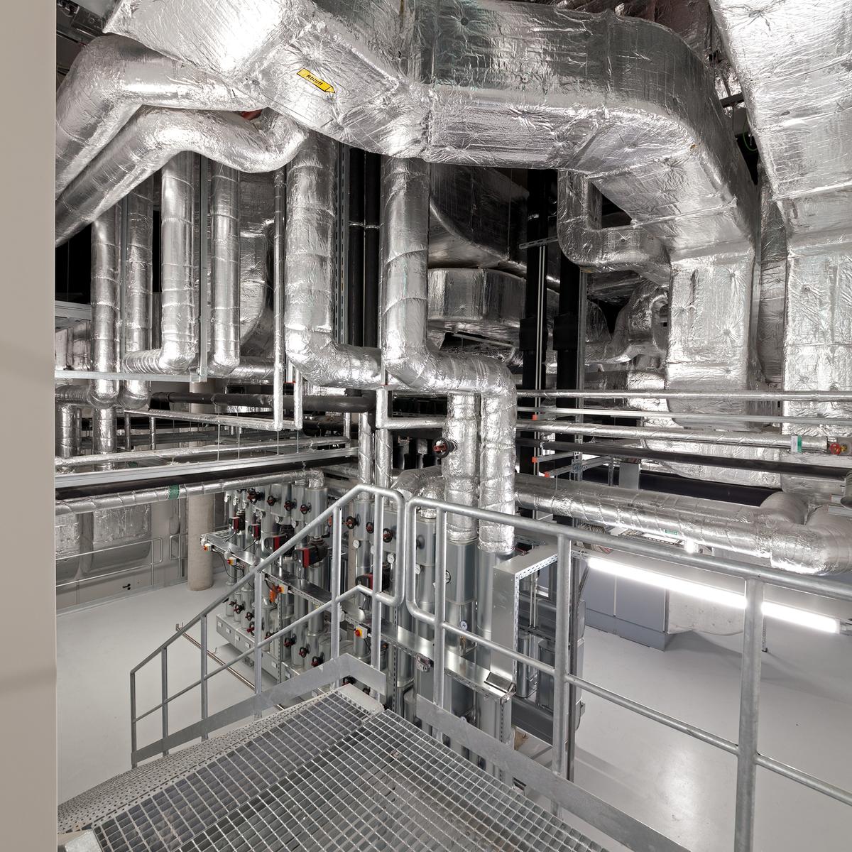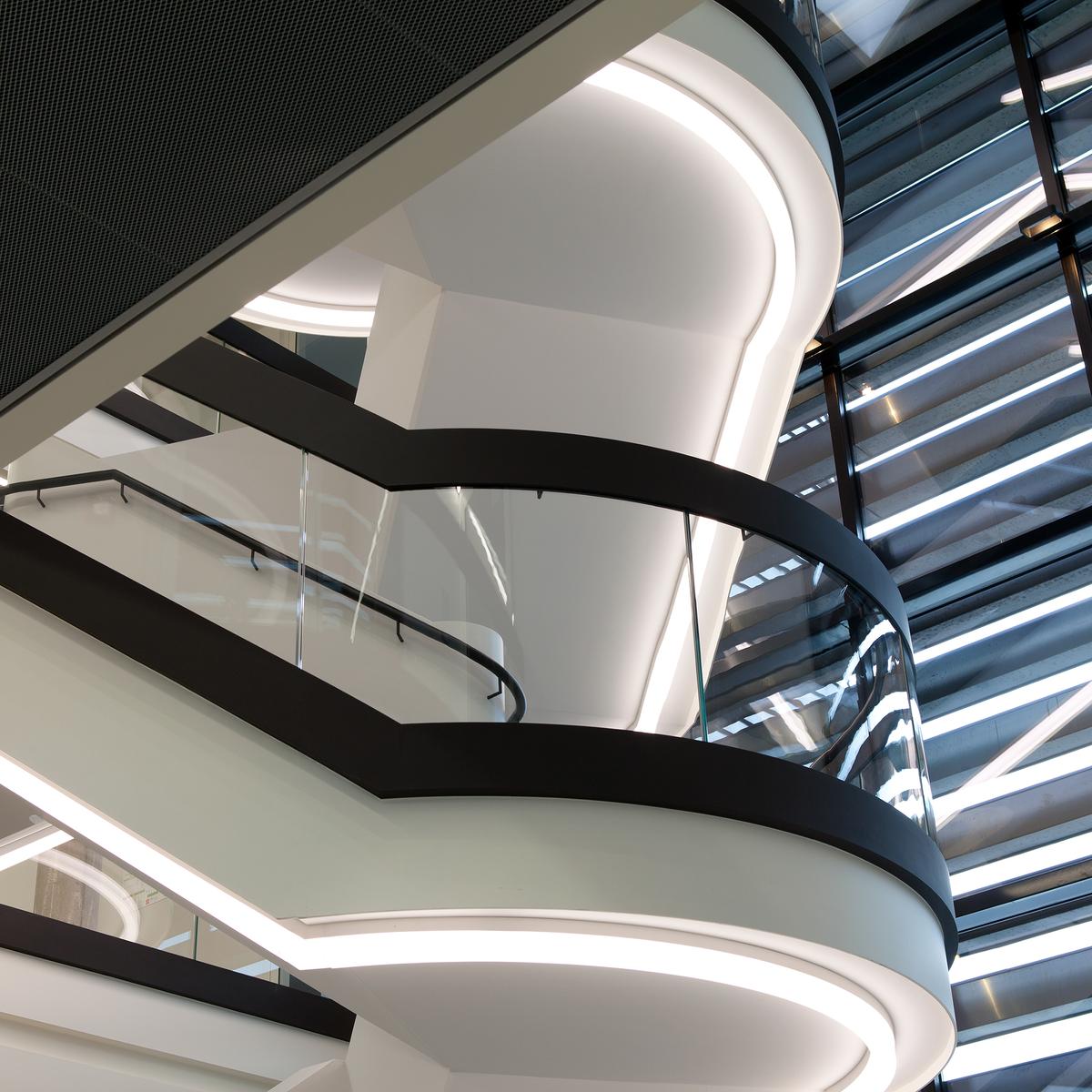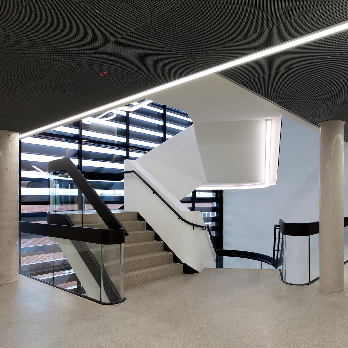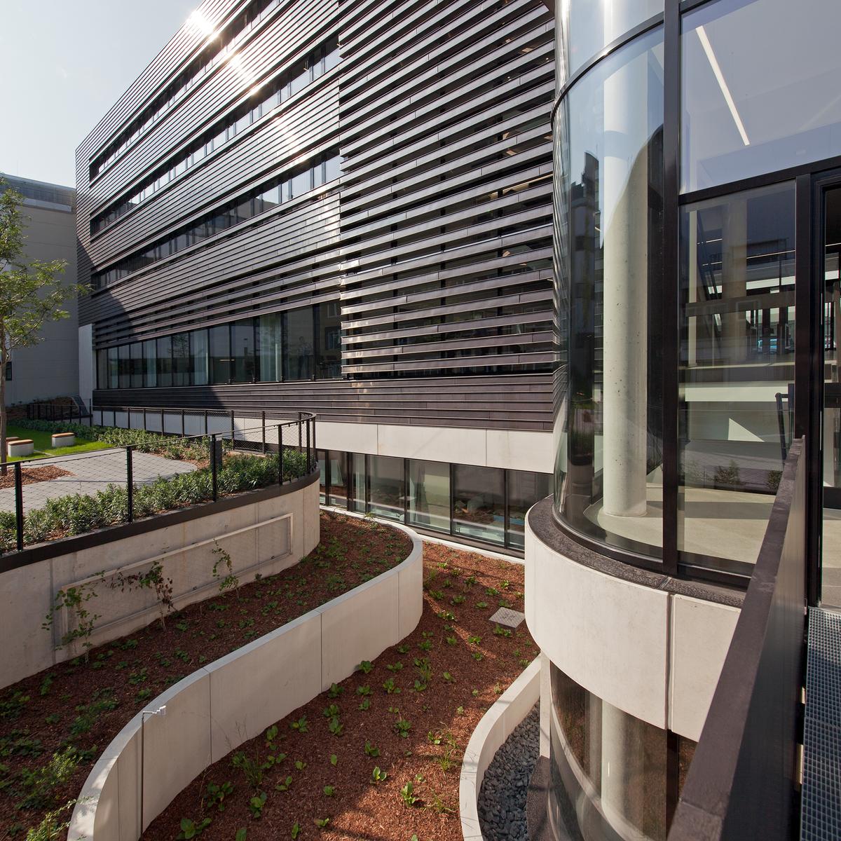 Schlüsselfertiger Neubau eines 5-geschossigen Büro- und Verwaltungsgebäudes mit Prüfräumen sowie eines Konferenzzentrums inkl. Tiefbauarbeiten. Durch die teilweise gerundete und zudem sehr detailreiche Fassade aus gerundeten Scheiben und Kupferblech aus voroxydierten, nur 210 mm breiten Kupferscharren stellt die Immobilie eine architektonische Besonderheit dar. Weitere Besonderheiten sind die Technikzentrale im Untergeschoss in einem über 7 Meter hohen Technikraum und der aufwendig gestaltete Innenhof, der über eine zweispurige Gebäudeunterführung zu erreichen ist.