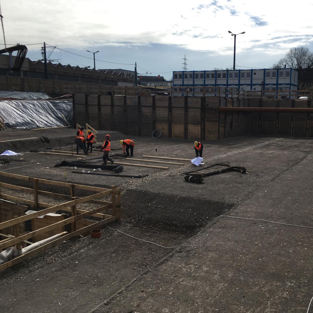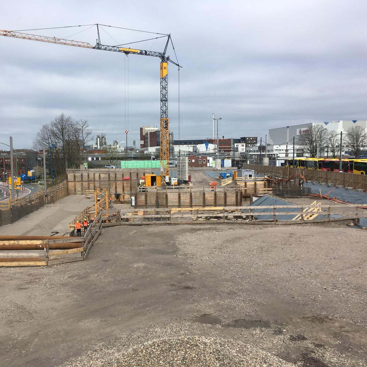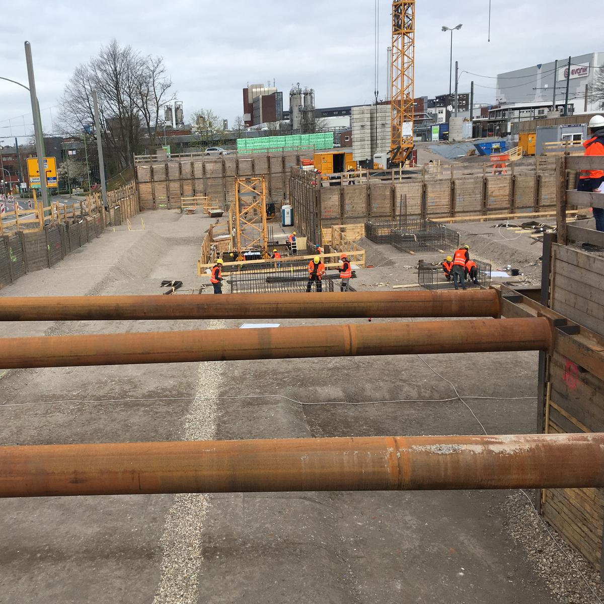 Termingerechte Erstellung einer Baugrube inkl. Aufbereitung der Aushubmaterialien zum Wiedereinbau und Entsorgung der Überschussmassen. Ein aktiver Betrieb des Bauhofs und eine beengte Bau- und Bewegungsfläche waren große Herausforderungen für die Kompetenz-Center Spezialtiefbau und Umwelttechnik. Die Erstellung der äußeren und inneren Baugrubenumschließung erfolgte mittels einer rückverankerten Trägerbohlwand mit Holzbohlenausfachung. Vor Ort anfallende Erdaushubarbeiten wurden seitens Köster durch Sieb- und Brechtechniken aufbereitet, wodurch Entsorgungsmassen reduziert und der Untergrund verbessert werden konnte. Die Anforderungen des Kunden, z.B. eine Untersuchung der Bodenbeschaffenheiten auf mögliche Kampfmittel, konnten durch Köster realisiert werden.