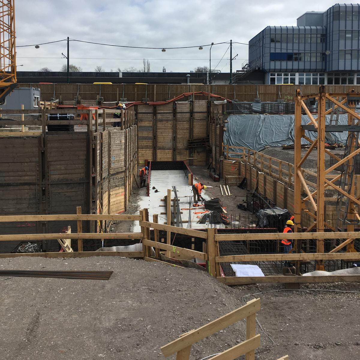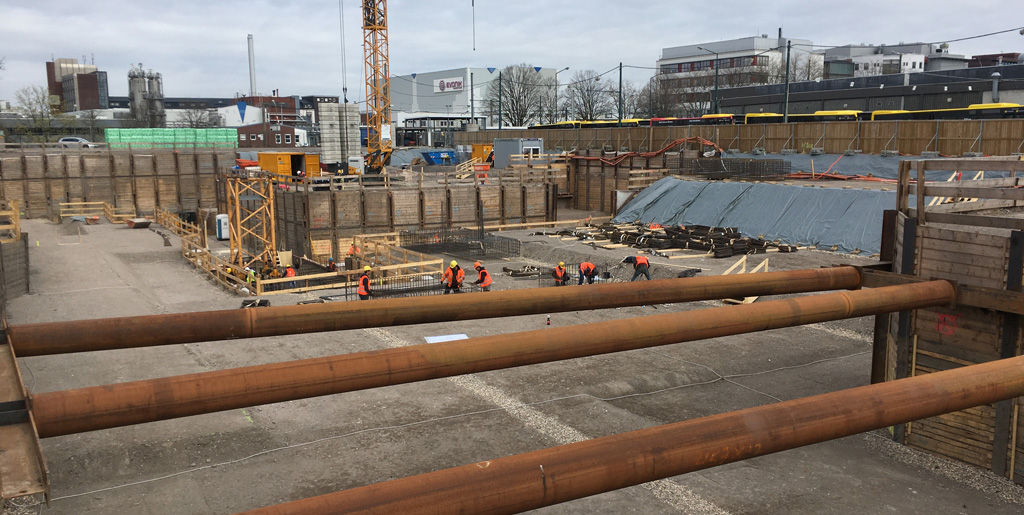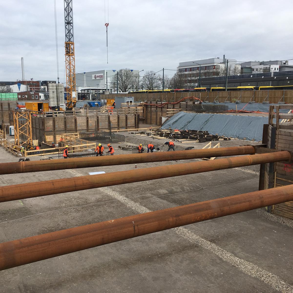 Termingerechte Erstellung einer Baugrube inkl. Aufbereitung der Aushubmaterialien zum Wiedereinbau und Entsorgung der Überschussmassen. Ein aktiver Betrieb des Bauhofs und eine beengte Bau- und Bewegungsfläche waren große Herausforderungen für die Kompetenz-Center Spezialtiefbau und Umwelttechnik. Die Erstellung der äußeren und inneren Baugrubenumschließung erfolgte mittels einer rückverankerten Trägerbohlwand mit Holzbohlenausfachung. Vor Ort anfallende Erdaushubarbeiten wurden seitens Köster durch Sieb- und Brechtechniken aufbereitet, wodurch Entsorgungsmassen reduziert und der Untergrund verbessert werden konnte. Die Anforderungen des Kunden, z.B. eine Untersuchung der Bodenbeschaffenheiten auf mögliche Kampfmittel, konnten durch Köster realisiert werden.