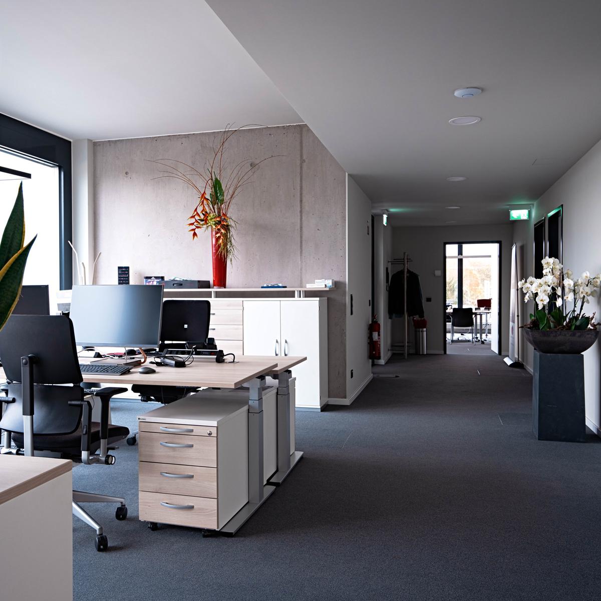 Schlüsselfertiger Neubau eines fünfgeschossigen Bürogebäudes inkl. anspruchsvoller Bebauung der Außenanlage in einem Gewerbepark bei Stuttgart. Köster realisierte einen lichtdurchfluteten Bürokomplex, der auf 4.000 qm Fläche ein modernes und zukunftsorientiertes Arbeiten möglich macht. Bedingt durch die Hanglage des Grundstücks, mussten die Einzel- und Streifen-Fundamente des Gebäudes in einer Tiefe von bis zu 6 m errichtet werden. Selbsttragende Fassadenteile wurden fertig auf die Baustelle geliefert und dann am Gebäude befestigt. So ließen sich die Kosten des Projekts senken und allem voran die Bauzeit verkürzen. Sonder- und Änderungswünsche des Kunden konnten seitens Köster termingerecht und problemlos umgesetzt werden.