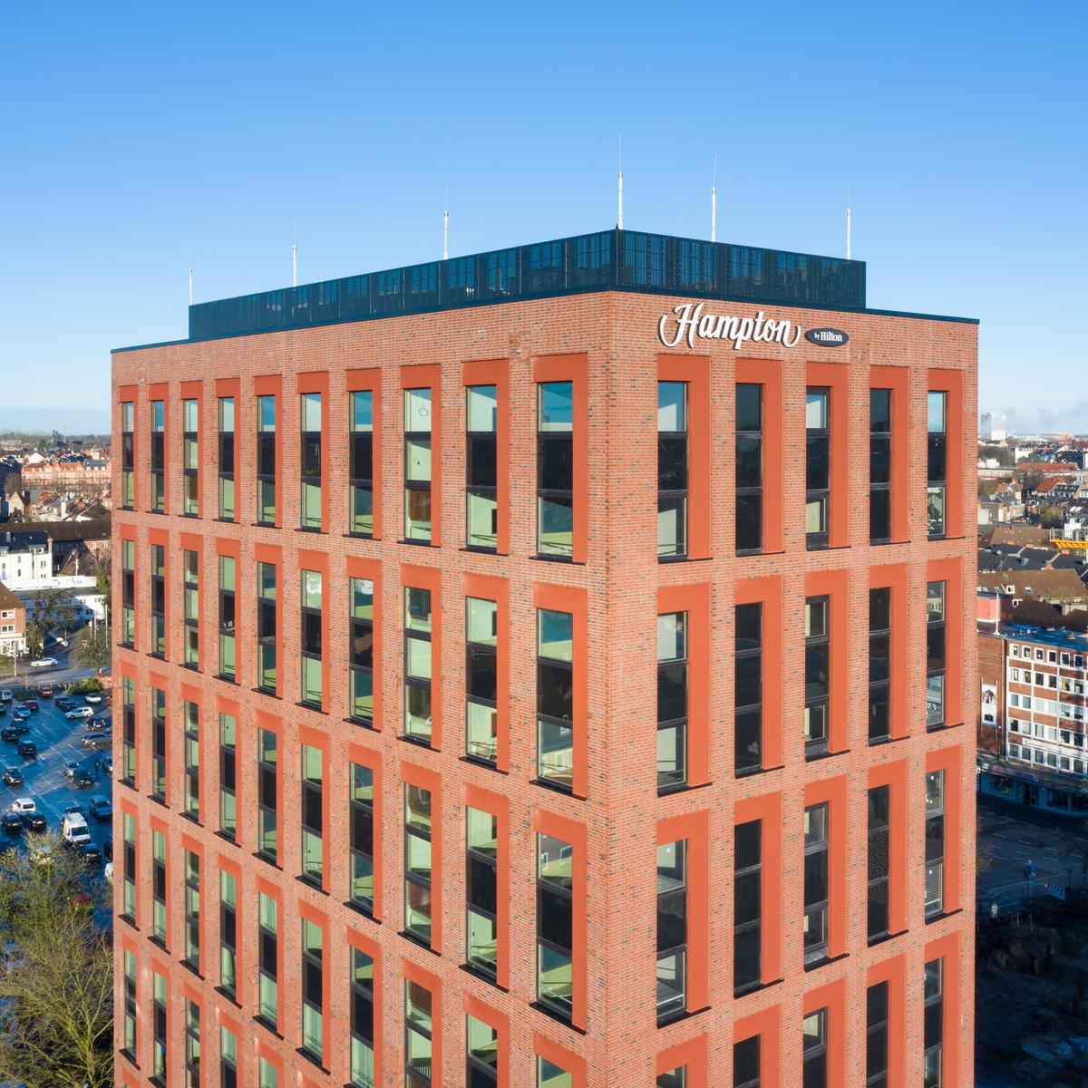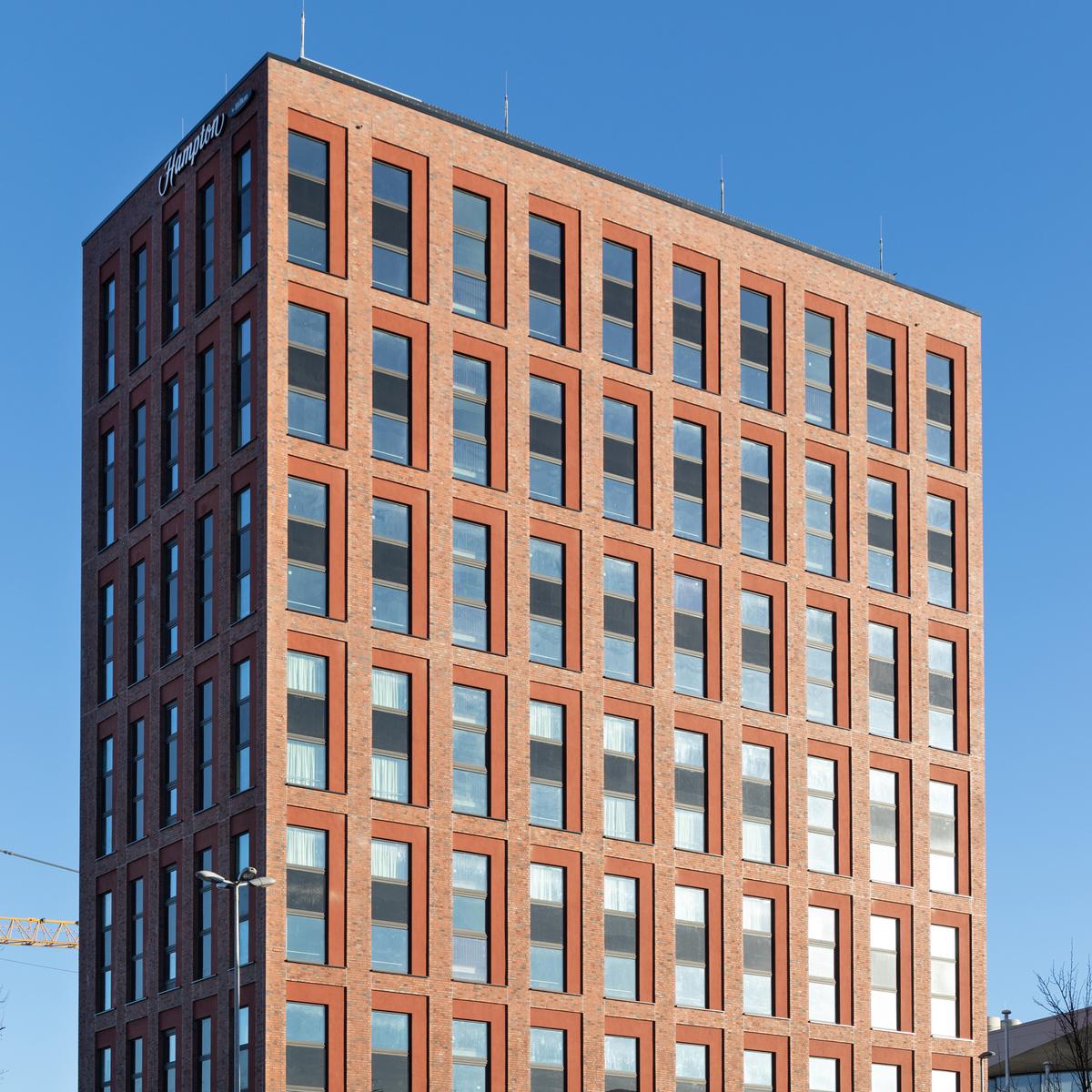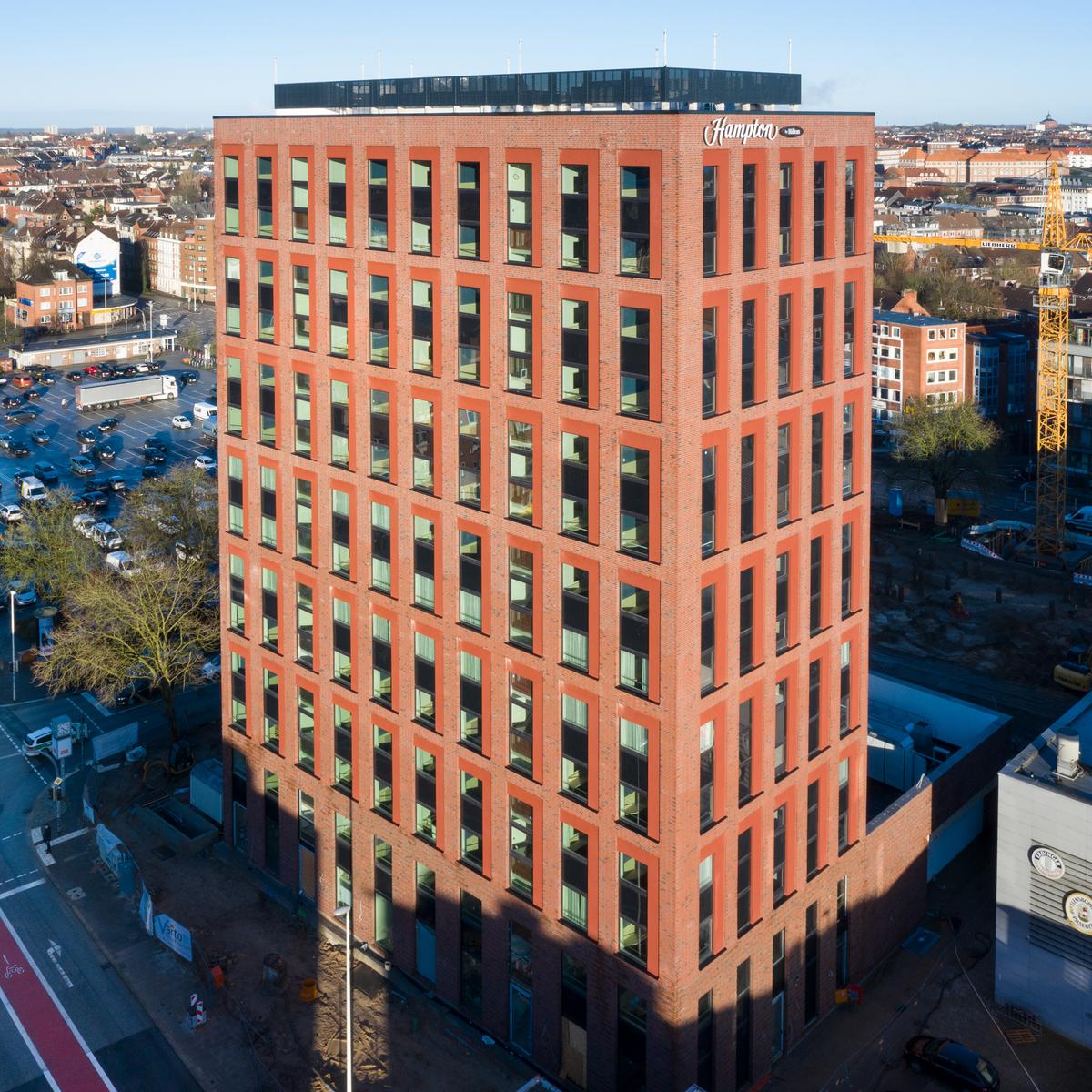Im Auftrag der Revitalis Real Estate realisierte Köster den Rohbau des 45 m hohen Hotel-Neubaus der Hampton by Hilton Kette in Kiel. Mit einem Sondervorschlag zur Bauweise konnte Köster bereits in der Angebotsphase die Voraussetzung für die besonders schnelle Errichtung des Rohbaus schaffen und das Budgetziel des Kunden einhalten. Die Kombination aus ein- und zweigeschossigen Betonfertigteilen, die just-in-time auf der Baustelle angeliefert wurden, führte zu der deutlichen Kosten- und Zeitersparnis.