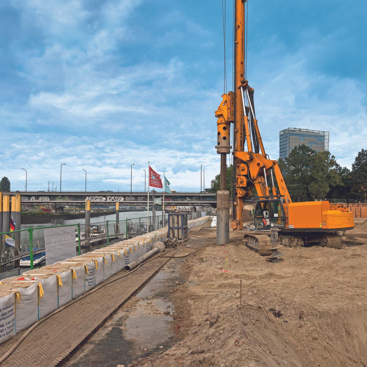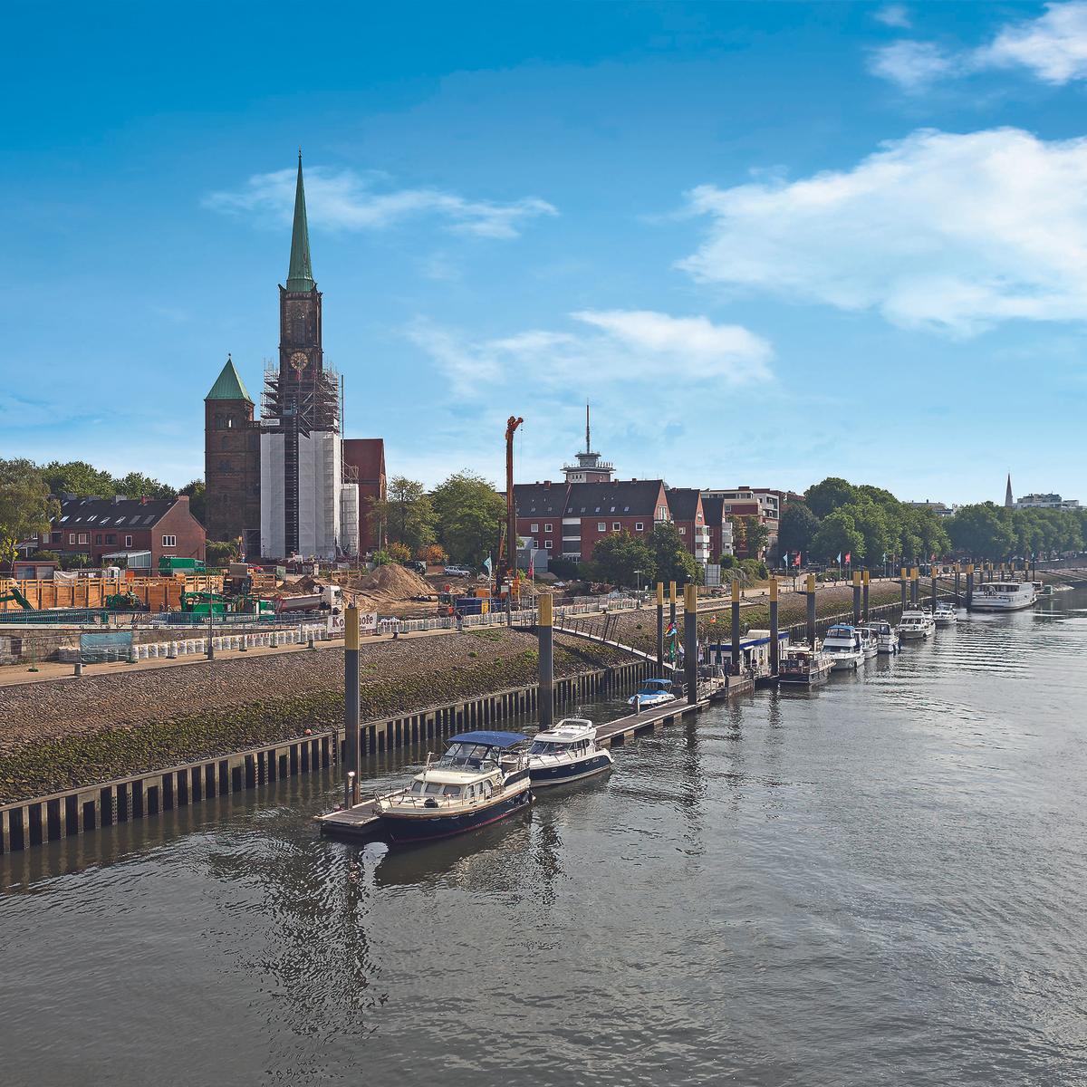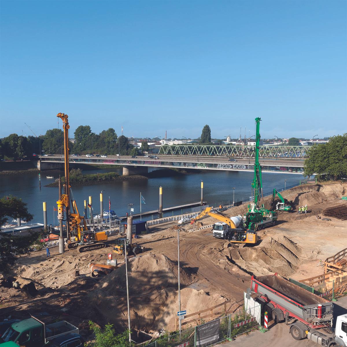 Ersatzneubau der bestehenden Hochwasserschutzanlage durch eine überschnittene Bohrpfahlwand mit aufgesetzter Stahlbetonwand. Die Maßnahme wurde von archäologischen Grabungen begleitet. Verfahrenstechnische Optimierungen der Pfahlwand verkürzten die Bauzeit. Industriell erzeugte Halbfertigteile sicherten die ambitionierte Produktionszeit der Stahlbetonwand.