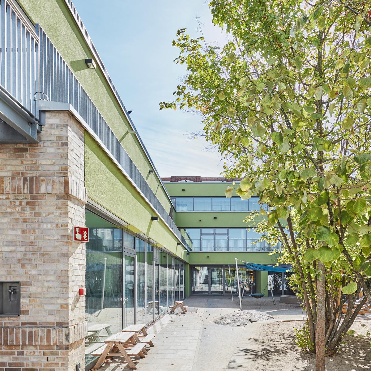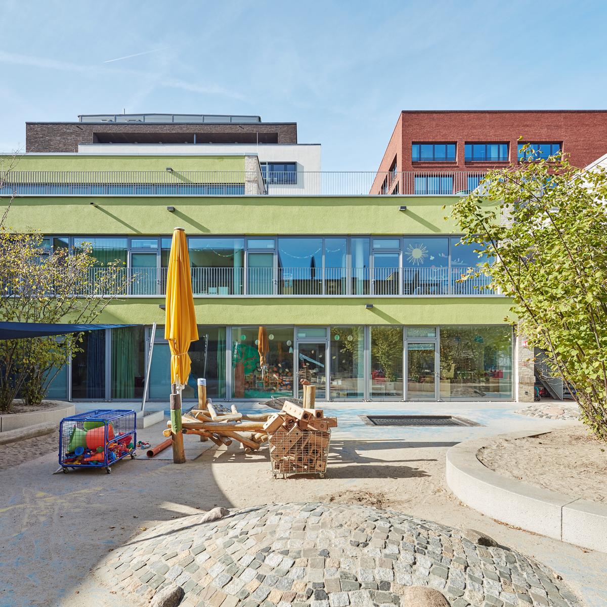 Schlüsselfertiger Neubau einer Kindertagesstätte mit Platz für 14 Kitagruppen auf drei Etagen inkl. Tiefgarage und Außenanlagen. Dank vorangegangener umfangreicher Klinkerbemusterung konnte der Kundenwunsch nach einer anspruchsvollen „abgetreppten“ Fassade erfüllt werden. Ein detailliertes Logistikkonzept und eine gute Zusammenarbeit führten zu einem reibungslosen Bauablauf.