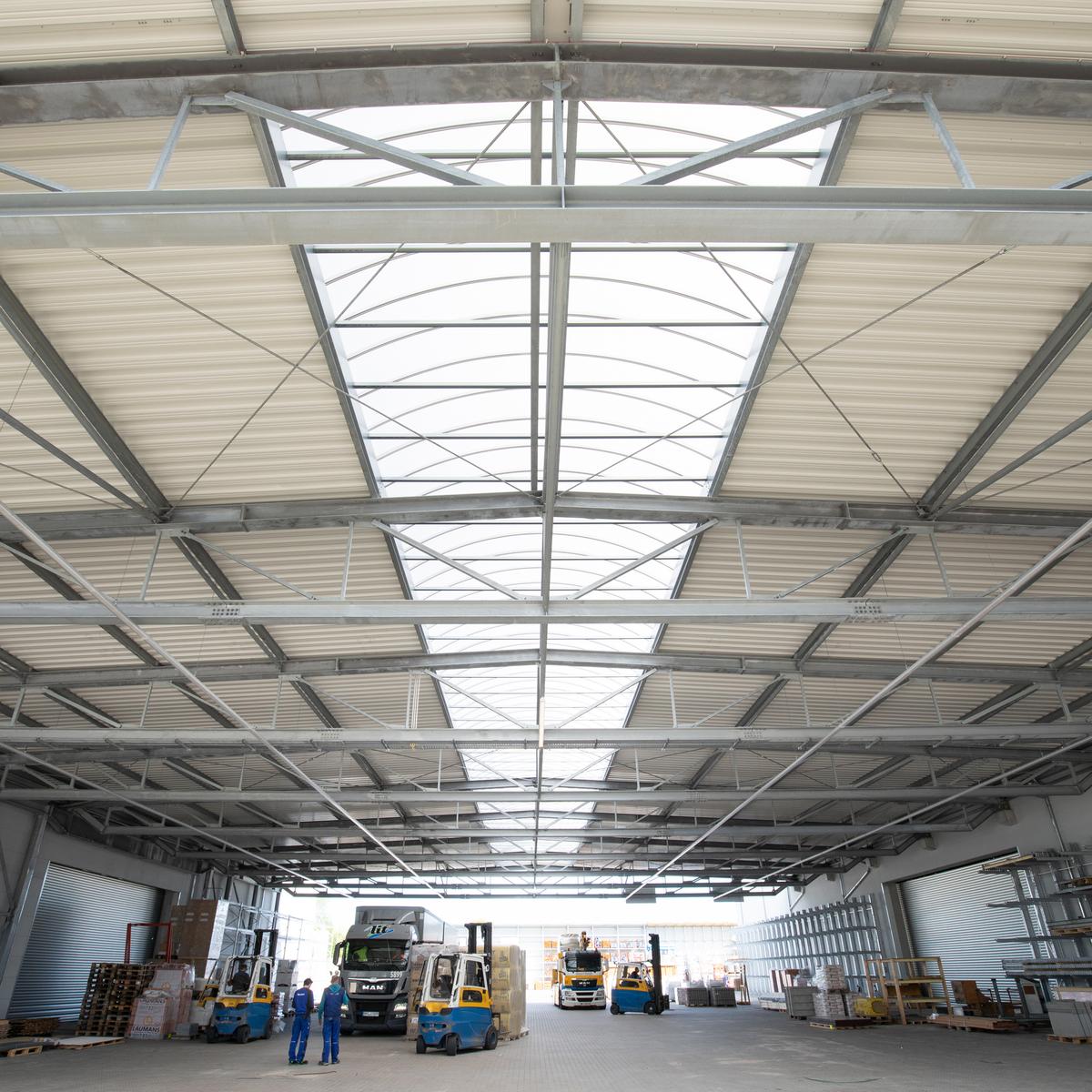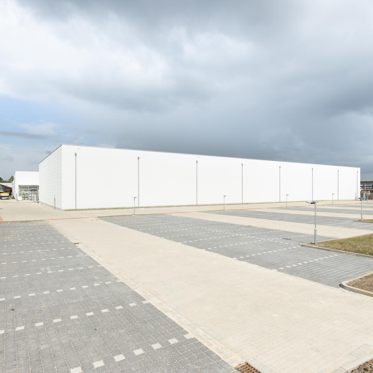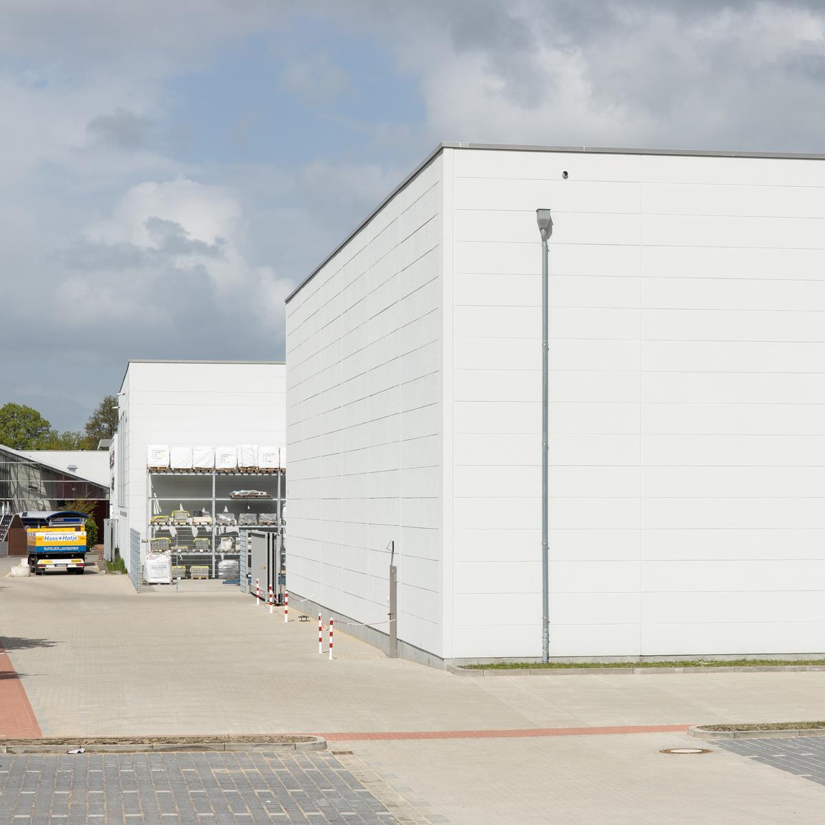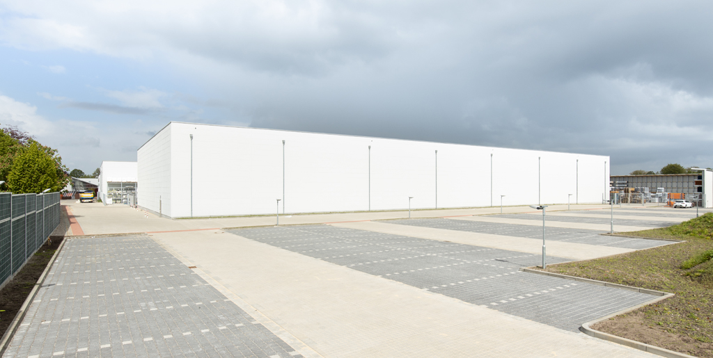 Schlüsselfertiger Neubau einer Lagerhalle mit Porenbetonfassade, Trapezblech, Gründach Vordach mit Lichtband sowie Ausführungsplanung in der Objektplanung und Tragwerksplanung. Dank vorangegangener Besichtigung einer Referenzfläche konnte der Kundenwunsch nach einer fugenlosen Industriesohle erfüllt werden. Der Einsatz des Steuerungsinstruments Köster-Masterplan sorgte für einen reibungslosen Bauablauf.