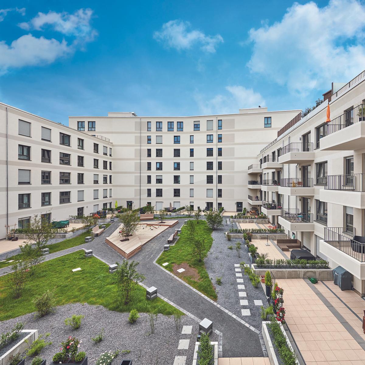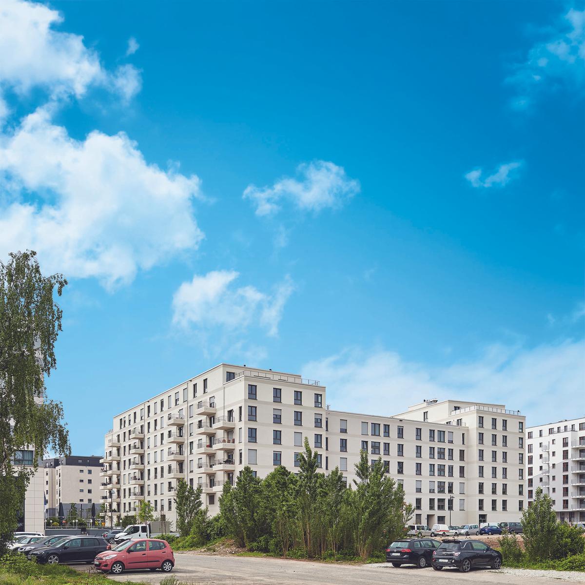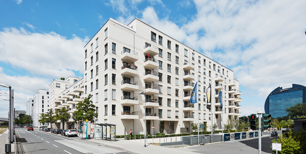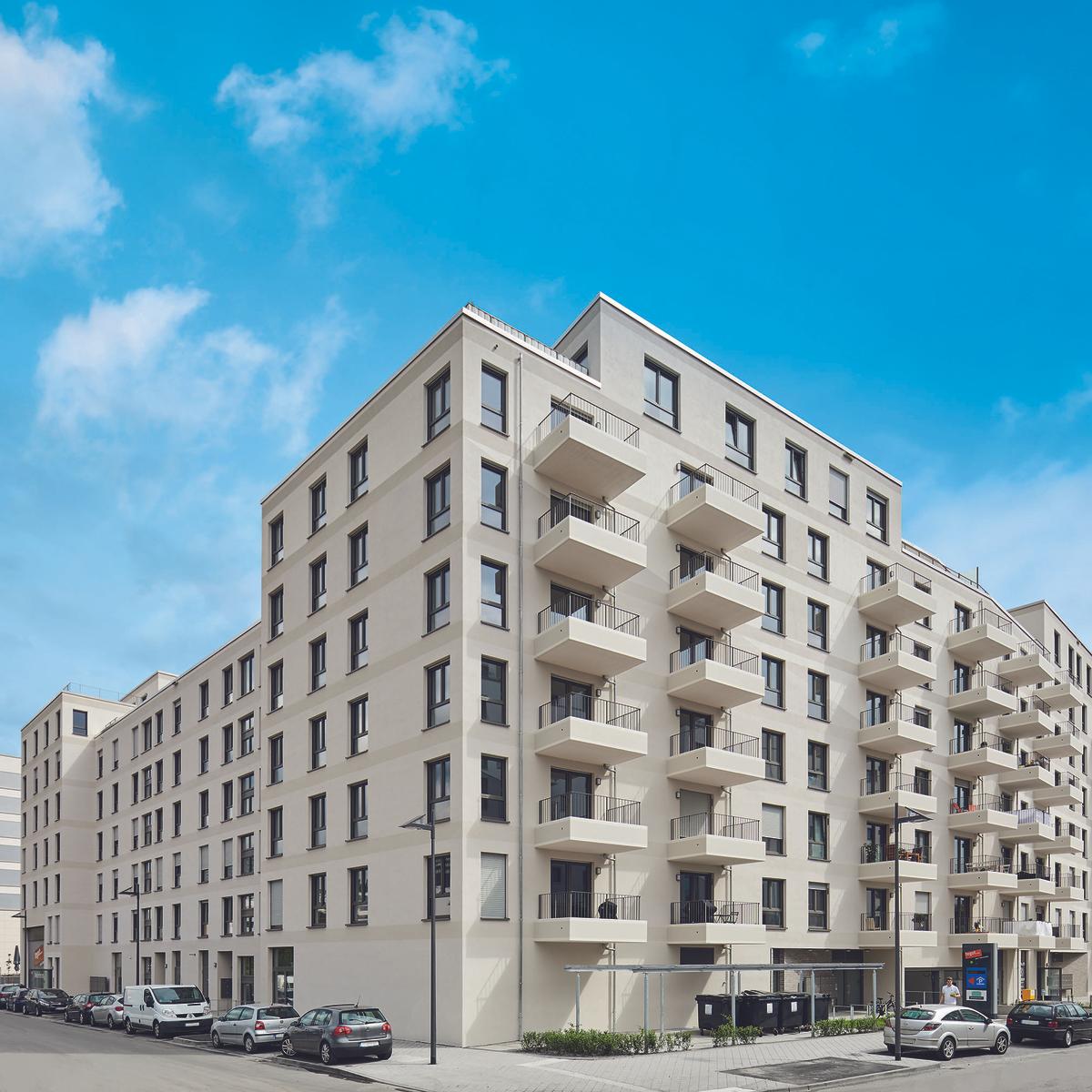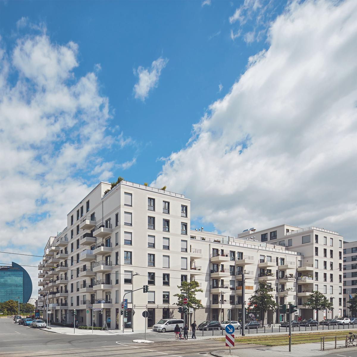Schlüsselfertiger Neubau eines Geschäfts- und Wohngebäudes mit 147 Wohnungen und Gewerbeflächen im Erdgeschoss sowie Tiefgarage mit 222 Pkw-Stellplätzen inkl. Planung. Mit einem detaillierten Logistikkonzept konnte die innerstädtische Immobilie in der geplanten Bauzeit nach den DGNB-Standards in Silber realisiert werden.
