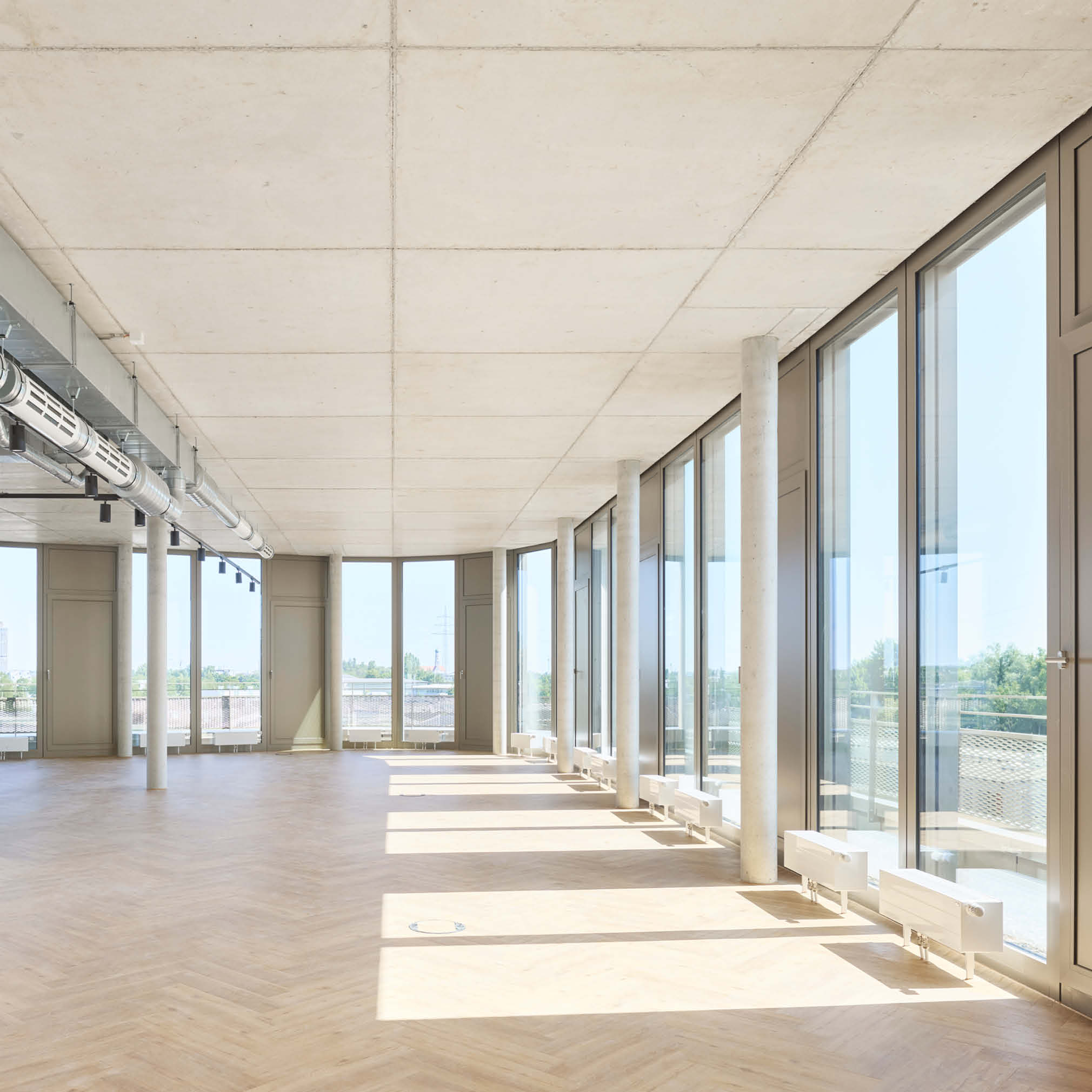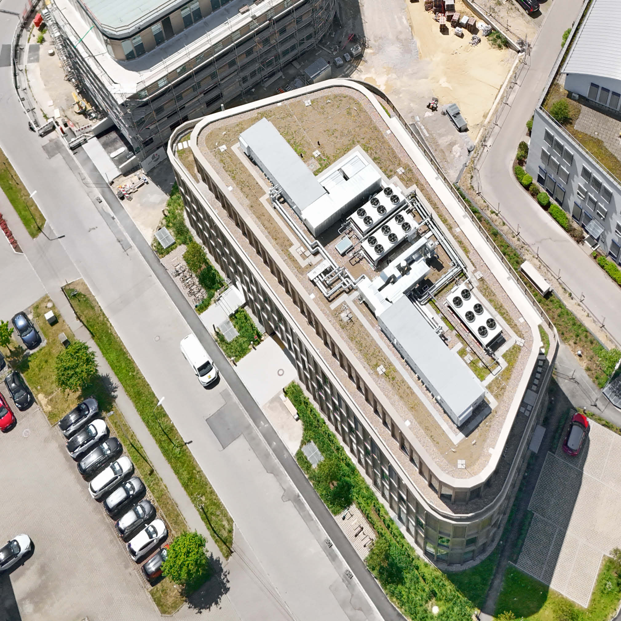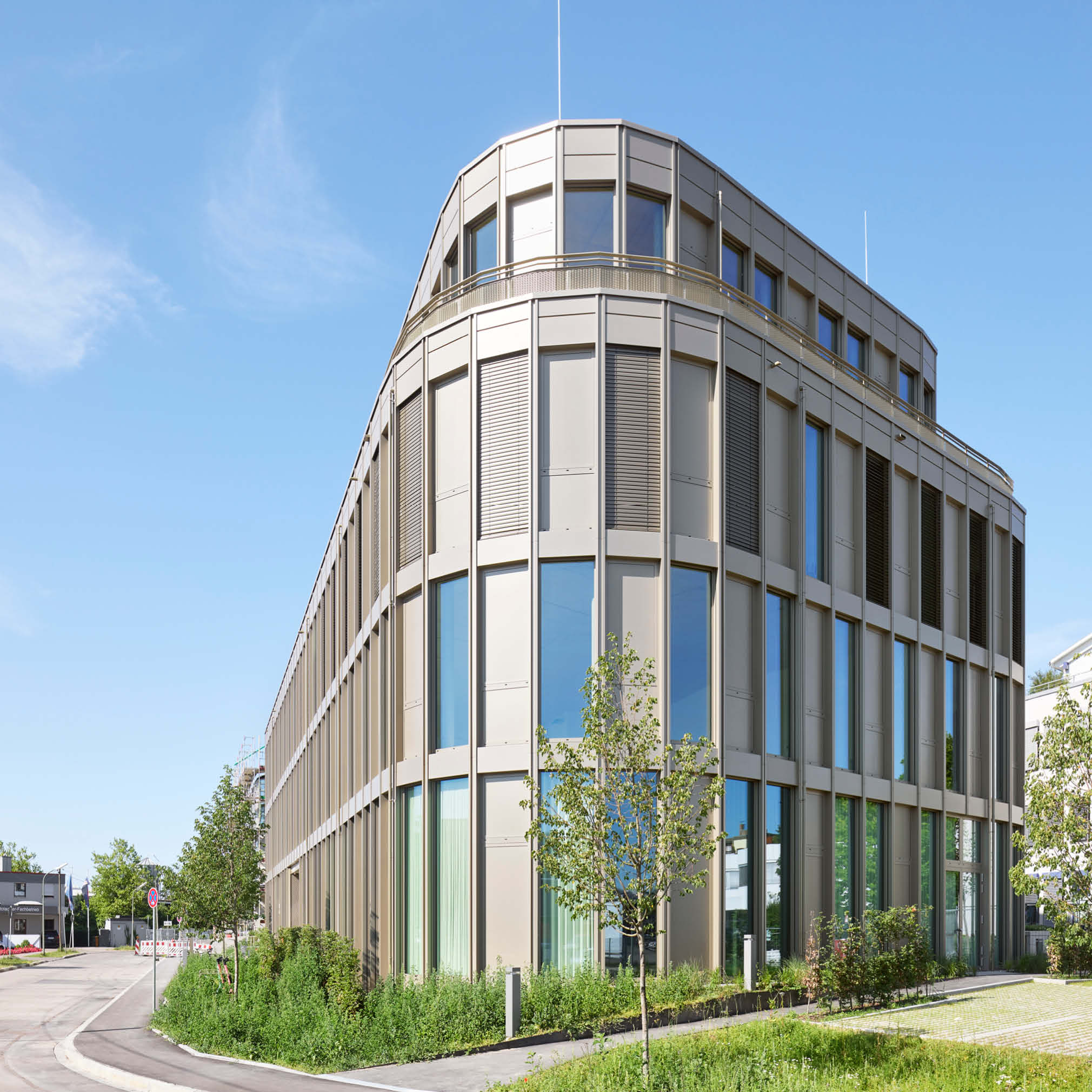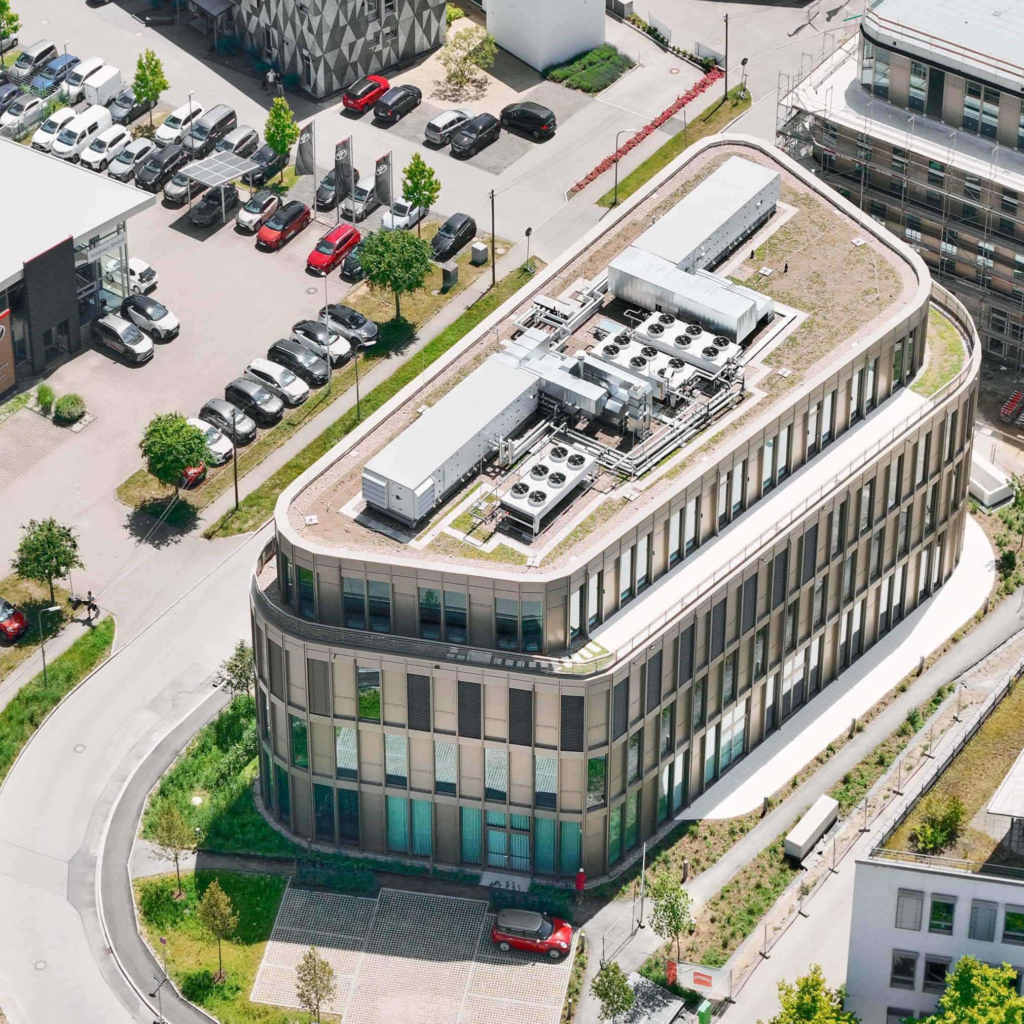 In Augsburg entsteht ein dreiteiliges Gebäude-Ensemble mit insgesamt 11.780 m² Bürofläche. Die stufenweise Realisierung erfolgt abhängig vom Vermietungsstand, Haus 1 ist fertiggestellt, Haus 2 befindet sich im erweiterten Rohbau. Die Architektur im Light Industrial Style sieht offene Grundrisse vor. Das Energiekonzept umfasst einen Eisspeicher, Wärmepumpen sowie eine Photovoltaikanlage zur Reduzierung der Betriebskosten und zur Sicherstellung der Nachhaltigkeit. Nach 12 Monaten Bauzeit wurde das Gebäude schlüsselfertig übergeben.