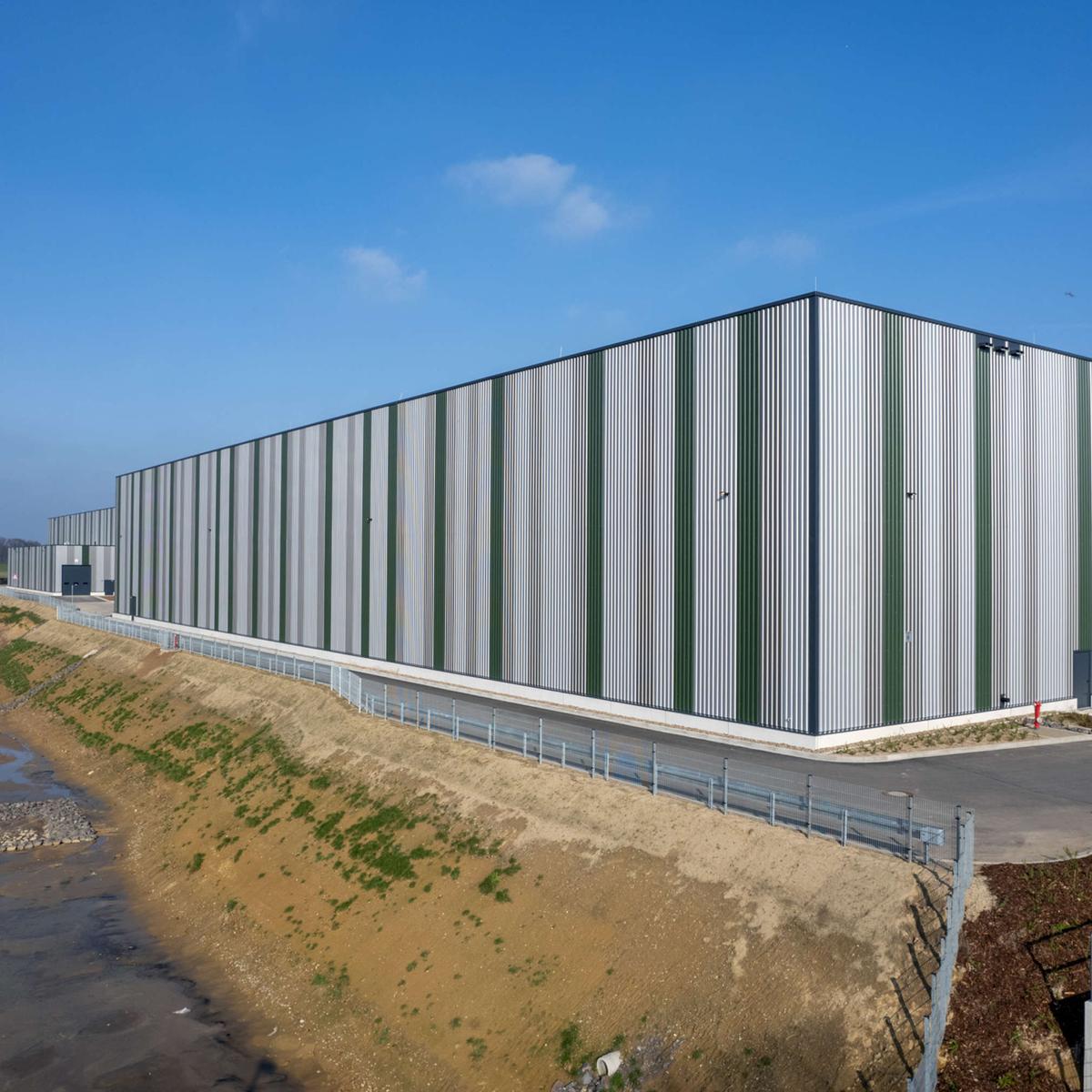 Köster errichtete für einen Stammkunden in nur einem Jahr zwei schlüsselfertige Logistikimmobilien, die aufgrund ihrer baulichen Ausstattung für die Lagerung von Lithium-Ionen-Batterien geeignet sind. Dabei wurden die besonderen Abnahme- und Genehmigungsverfahren erfolgreich durchgeführt. Köster unterstütze bei den Tief- und Hochbauleistungen sowie der Erstellung der Außenanlagen. Technik: Abdichtungsbahn für WGK III Stoffe, je 10.000 m² Parzelle wurde ein Sektionaltor mit Brandschutzrampe und Container installiert. Diese werden über eine separate Feuerlöschringleitung über die Sprinkleranlage mit zus. Sprinklerpumpe versorgt. Dämmung am Gebäude entspricht der Brandschutzklasse A1.