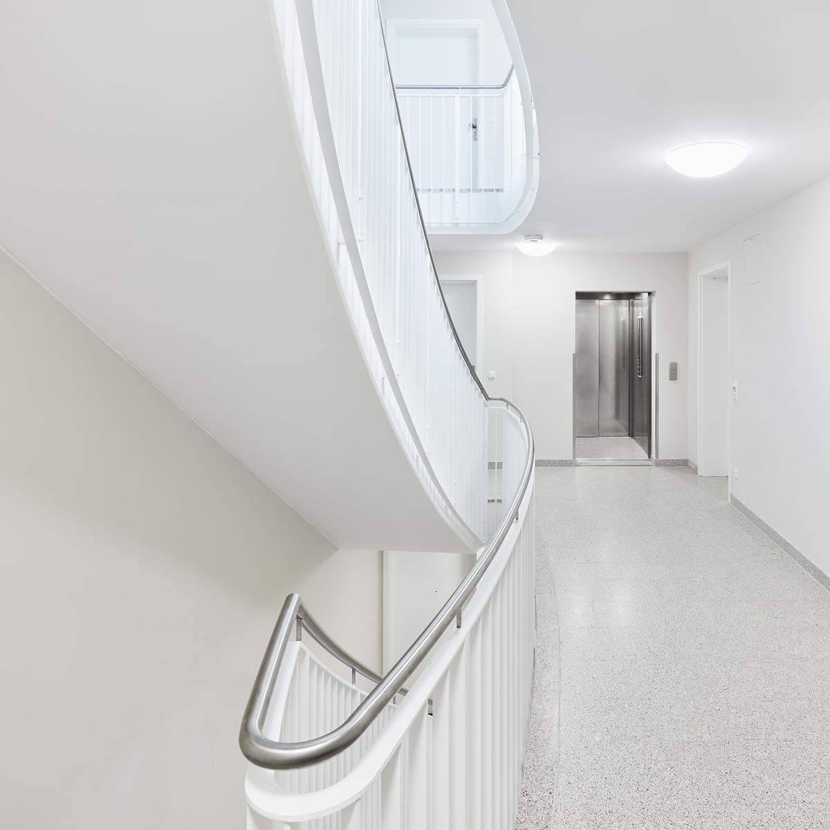 Der schlüsselfertige Neubau der Wohnanlage umfasst acht Gebäude mit 126 Mietwohnungen auf 9.380 qm. Hinzu kommen weitere Mischnutzungen auf 1.800 qm mit einer Kita, 22 Seniorenwohnungen, einem Pflegestützpunkt und einer Praxis. Die Tiefgarage des Gebäudekomplexes bietet 176 Stellplätze. Nach Abriss der vorherigen Bebauung übernahm Köster die schlüsselfertige Erstellung, dabei galt es zwei Gebäude an den Bestand anzuschließen und einen Vorgängerbau zur Tiefgarage umzubauen. Da der Grundwasserspiegel recht hoch lag, erfolgte für die Häuser 1-4 ein Bodenaustausch und mit Planungsunterstützung des Bereichs Bautechnik + Innovation wurden die Aufzugsschächte als Senkkästen ausgeführt.