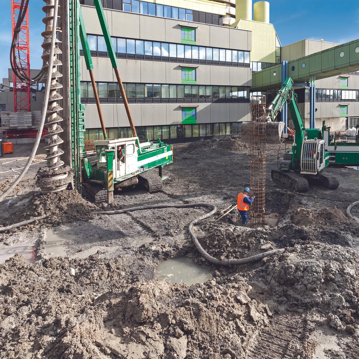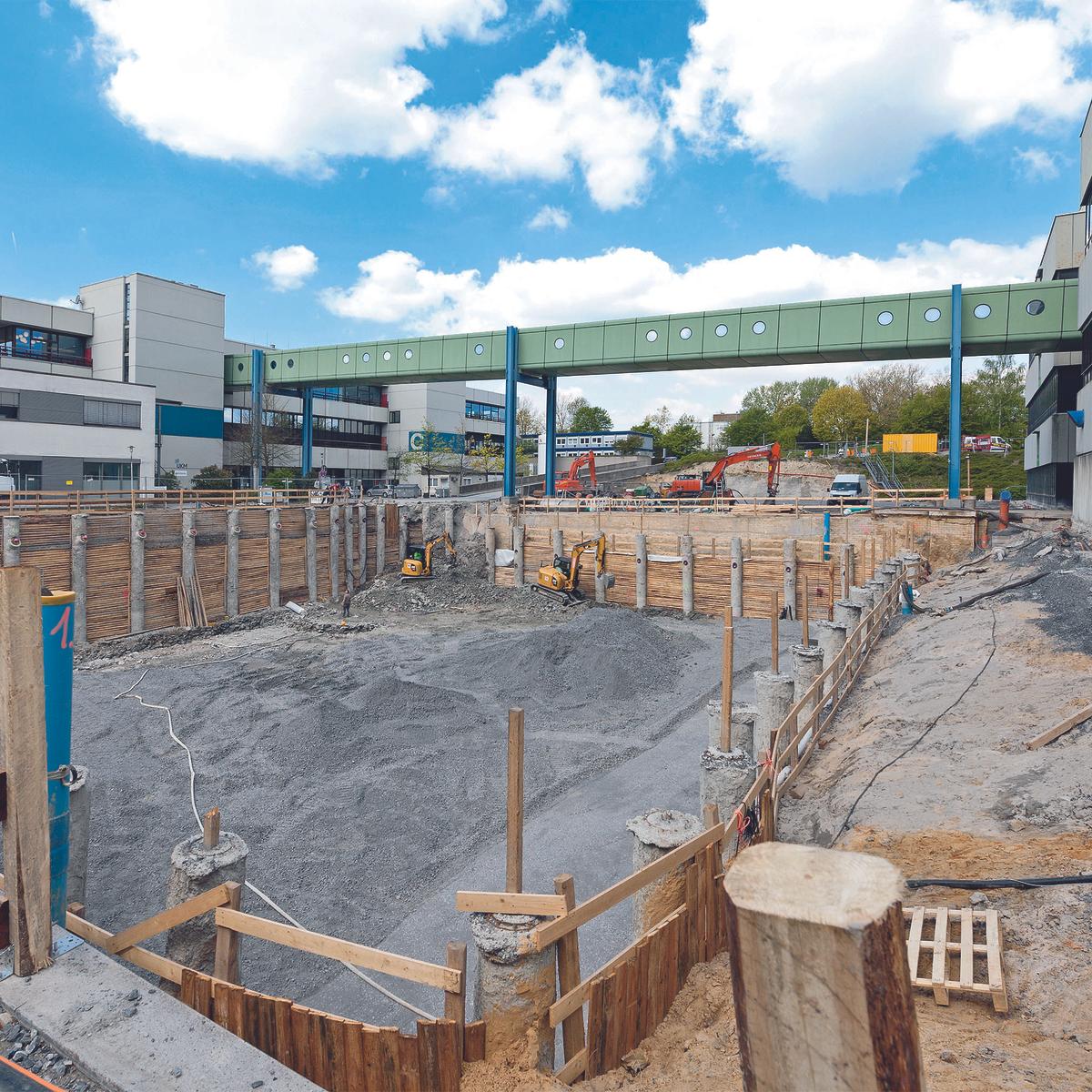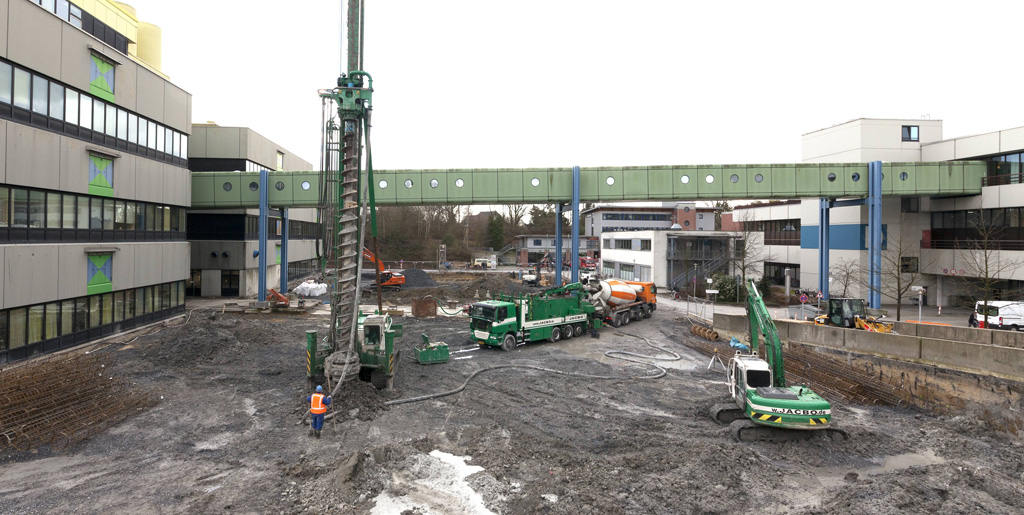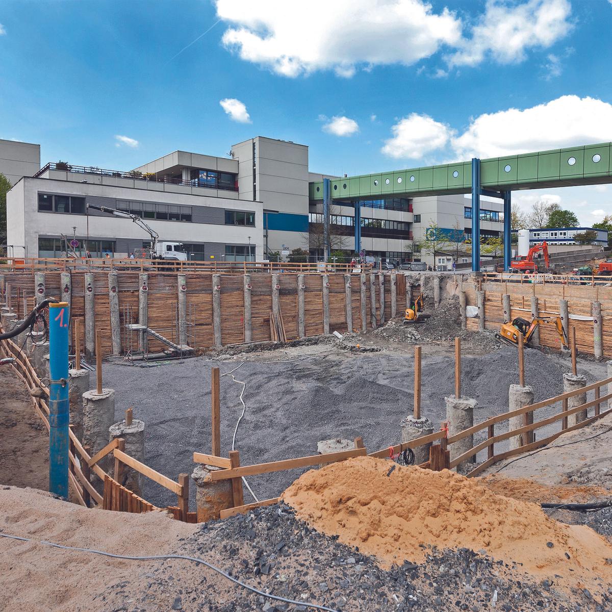 Ausführung der Spezialtief- und Erdbauarbeiten für die Erstellung eines Erweiterungsgebäudes. Die Arbeiten in der beengten Baugrube erforderten nicht nur eine akribische Baulogistik, sondern auch eine besondere Rücksichtnahme auf den laufenden Klinikbetrieb. Die Bauspezialisten wählten deshalb besonders geräuscharme Bauverfahren. Ein Sondervorschlag verkürzte die Bauzeit und senkte die Kosten für den Kunden.