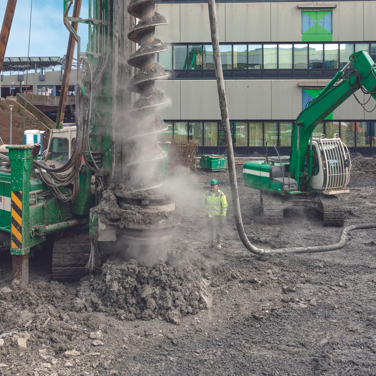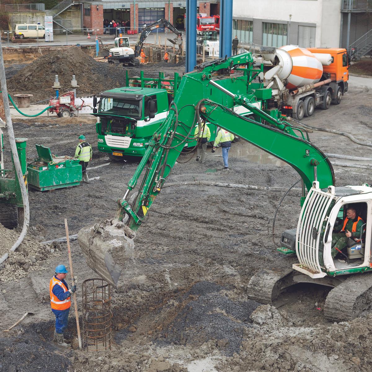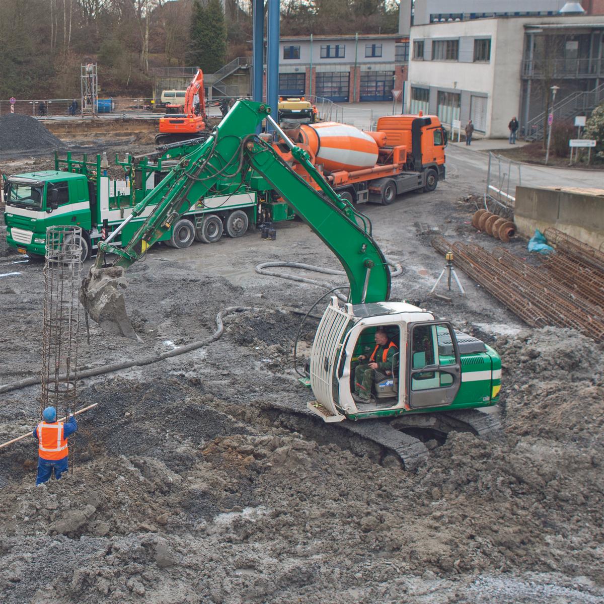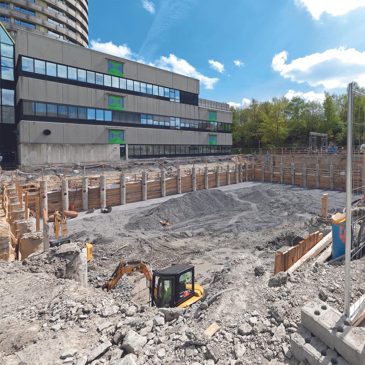 Ausführung der Spezialtief- und Erdbauarbeiten für die Erstellung eines Erweiterungsgebäudes. Die Arbeiten in der beengten Baugrube erforderten nicht nur eine akribische Baulogistik, sondern auch eine besondere Rücksichtnahme auf den laufenden Klinikbetrieb. Die Bauspezialisten wählten deshalb besonders geräuscharme Bauverfahren. Ein Sondervorschlag verkürzte die Bauzeit und senkte die Kosten für den Kunden.