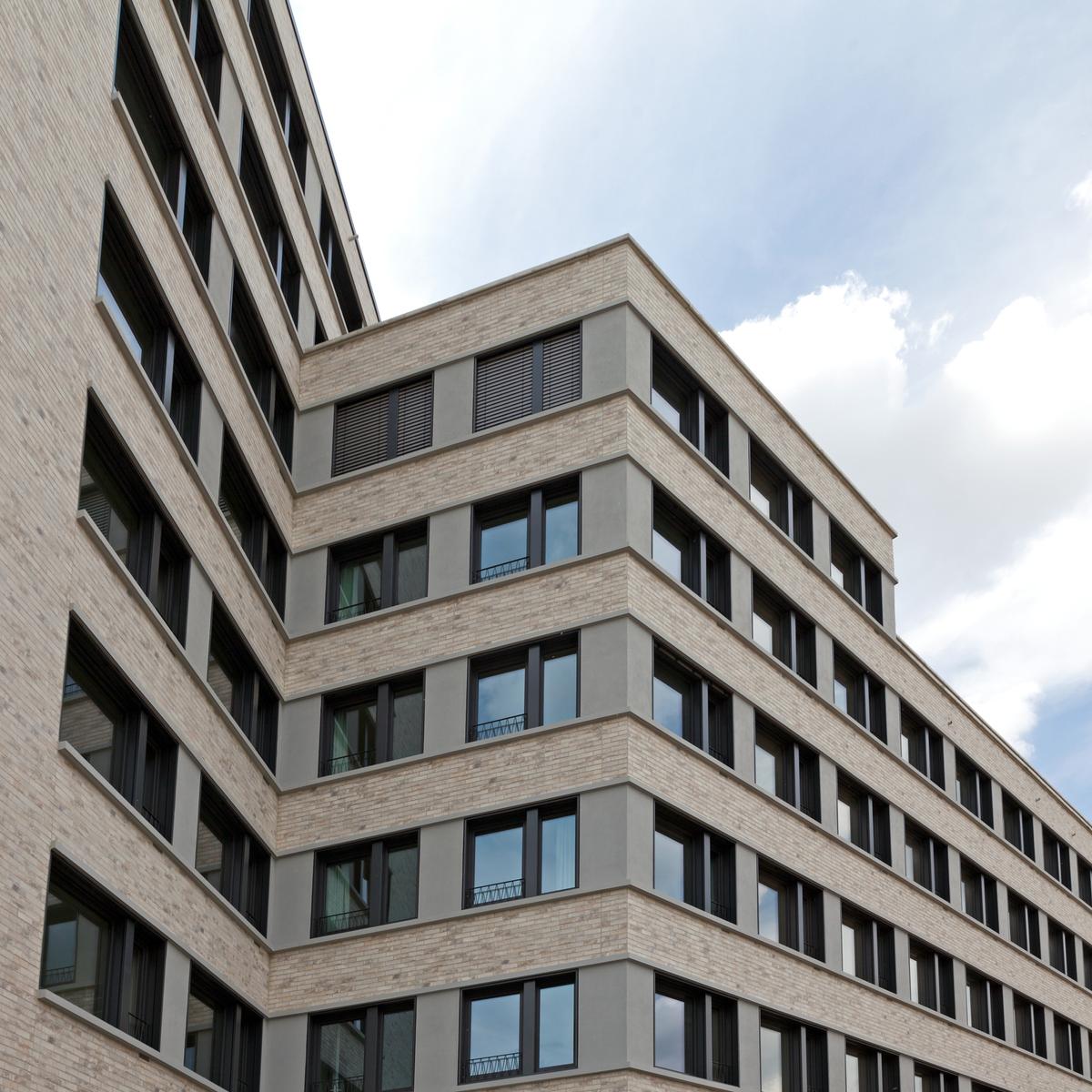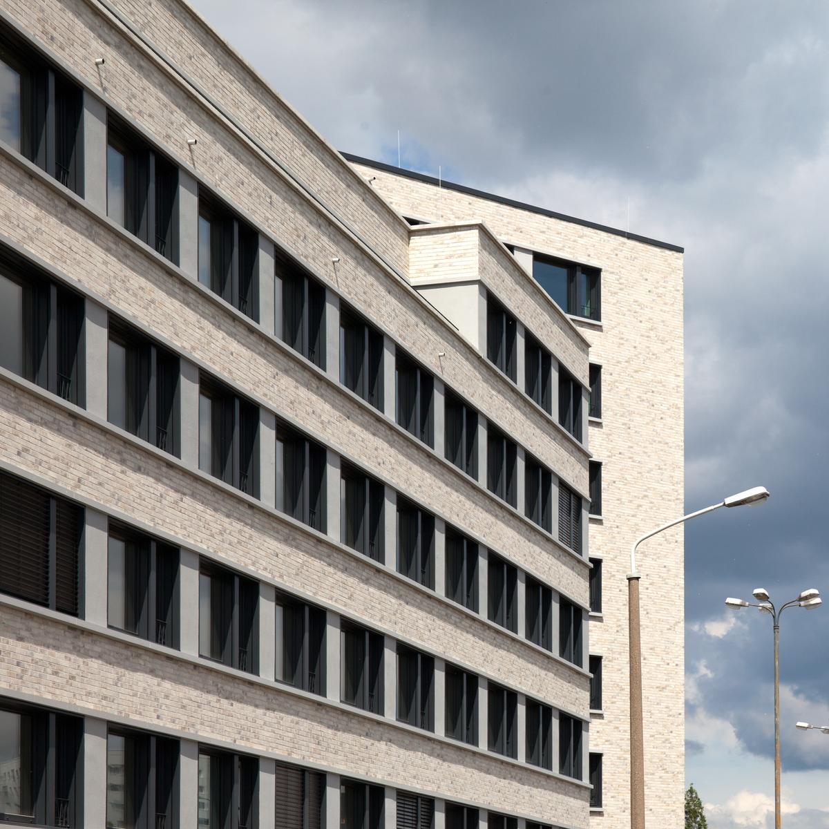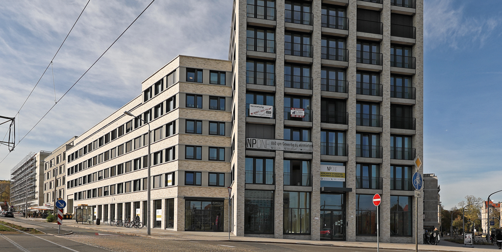 Schlüsselfertiger Neubau eines Studentenwohnheims mit 228 Wohnungen und Gewerbefläche inkl. Tiefgarage. Die Immobilie besteht aus einem Turmgebäude mit sieben Etagen sowie zwei Flügeln mit je fünf Etagen. Im Erdgeschoss befindet sich ein dm-Markt, im Hof die Zufahrt zur Tiefgarage.