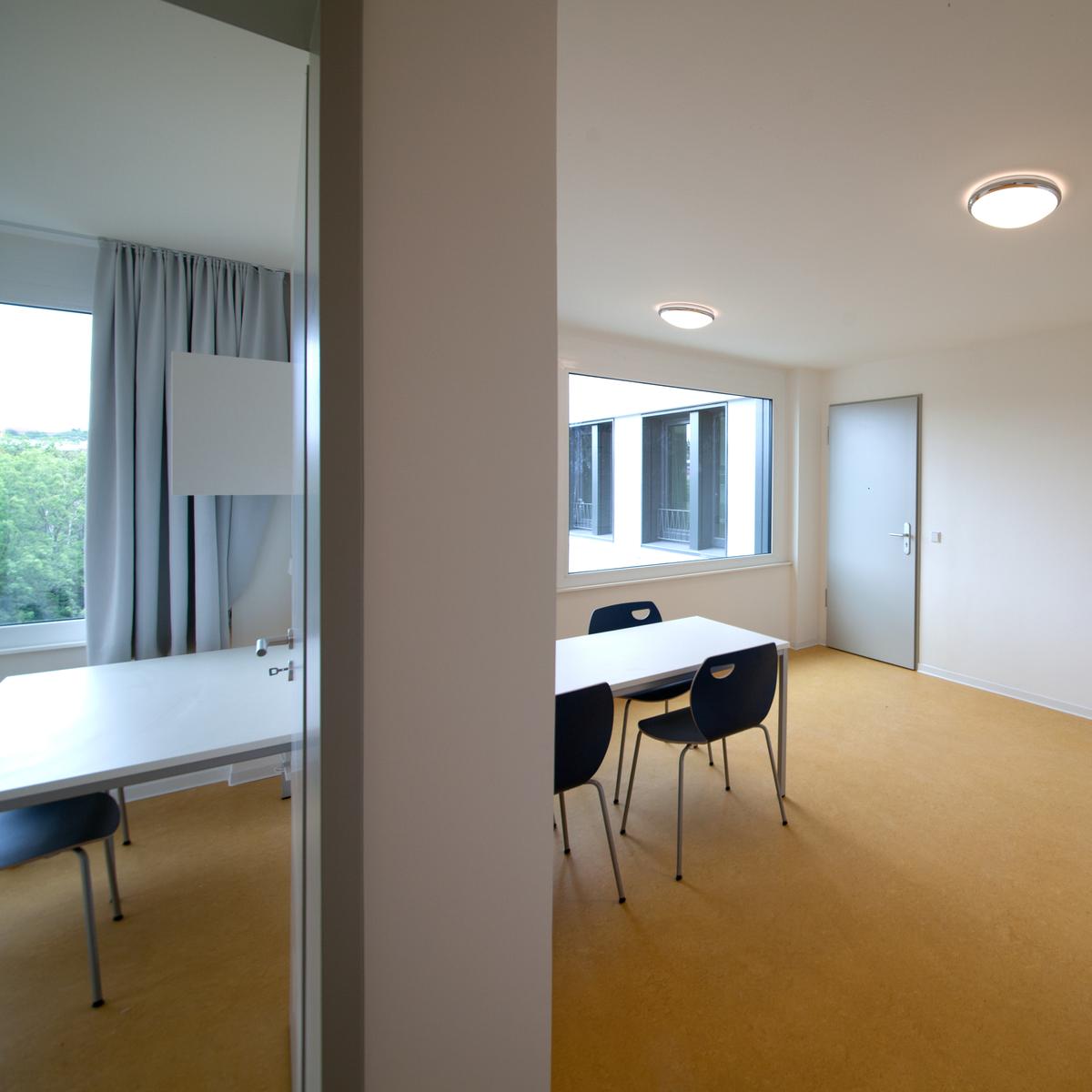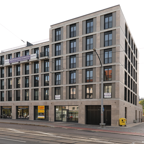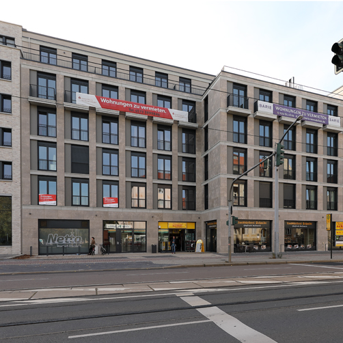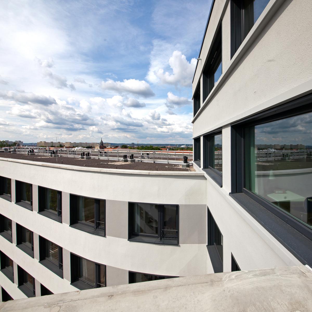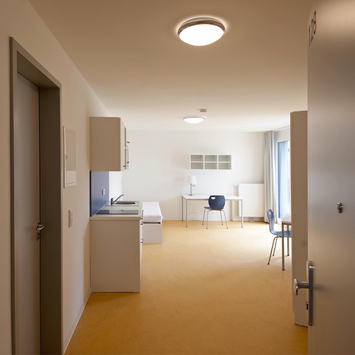 Schlüsselfertiger Neubau eines Studentenwohnheims mit 228 Wohnungen und Gewerbefläche inkl. Tiefgarage. Die Immobilie besteht aus einem Turmgebäude mit sieben Etagen sowie zwei Flügeln mit je fünf Etagen. Im Erdgeschoss befindet sich ein dm-Markt, im Hof die Zufahrt zur Tiefgarage.