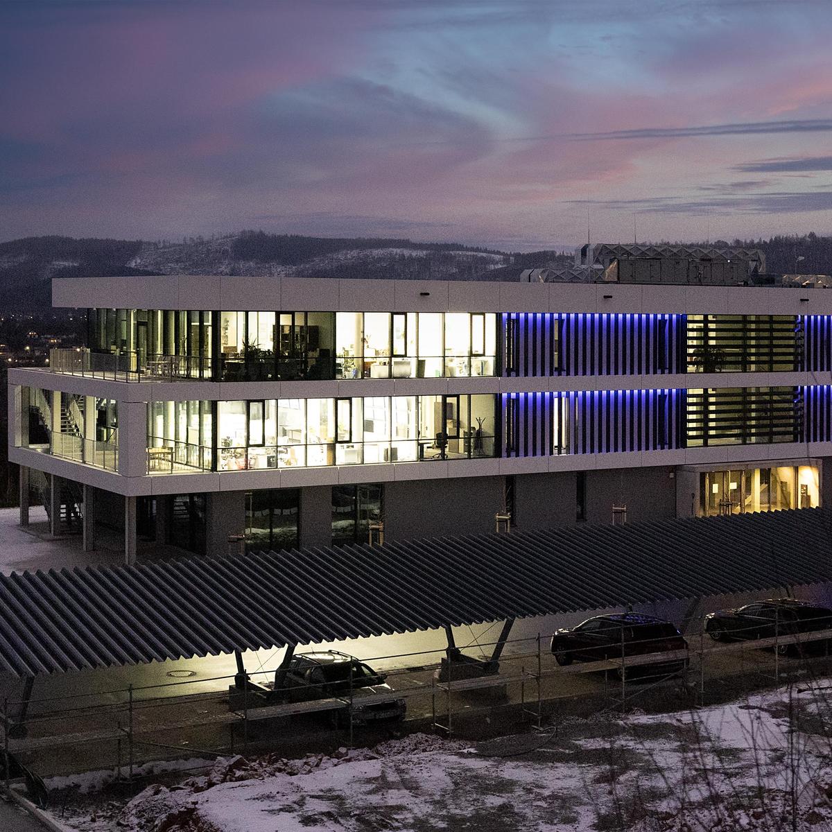 Neubau eines Bürogebäudes mit einer Fläche von 3.000 m2. Trotz der steilen Zufahrtsstraße, welche in den Wintermonaten eine Herausforderung für die LKW-Anlieferungen darstellte, konnte das Projekt fristgerecht fertiggestellt werden. Besonders an der Fassade konnten die Wünsche des Kunden individuell umgesetzt werden.