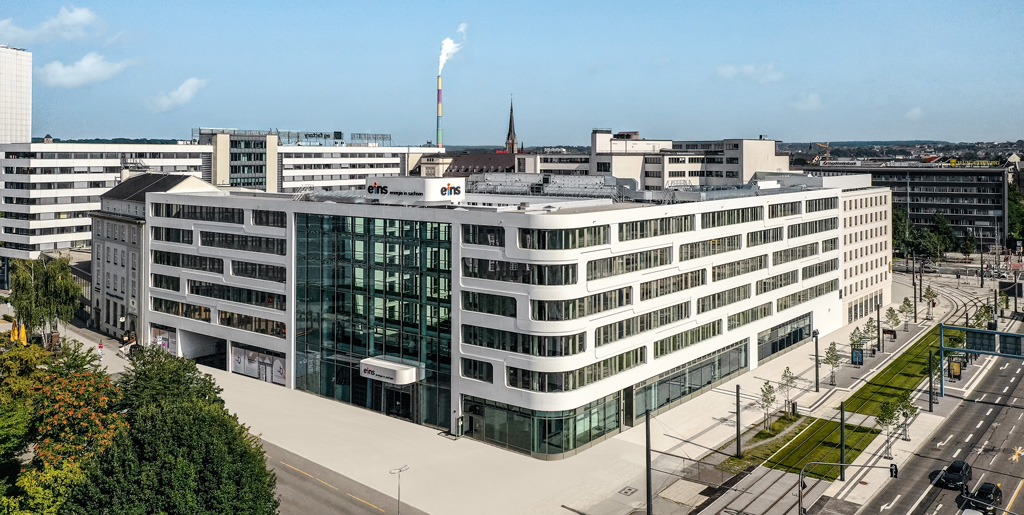 Im Rahmen eines Investorenwettbewerbs konnten die Projektpartner FAY Projects GmbH, Tchoban Voss Architekten, C&E Consulting und Engineering GmbH und die Köster GmbH die „eins energie in Sachsen“ von ihrem Konzept und ihren Entwürfen überzeugen. Der Hochbau Chemnitz realisierte den schlüsselfertigen Neubau, der auf sechs Geschossen eine moderne Kundenzentrale sowie Platz für über 500 Mitarbeiter bietet. In der Gebäudetechnik wurde auf klimaneutrale Standards zur Wärmeversorgung und Klimatisierung gesetzt. Die bandartig geprägte Fassade fügt sich harmonisch in die Nachbarbebauung ein. Eine zweigeschossige Tiefgarage und ein Parkhaus bieten insgesamt 350 Stellplätze.
