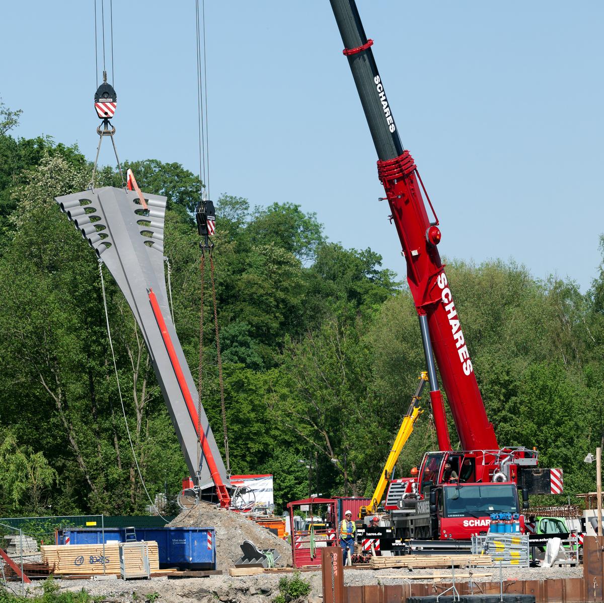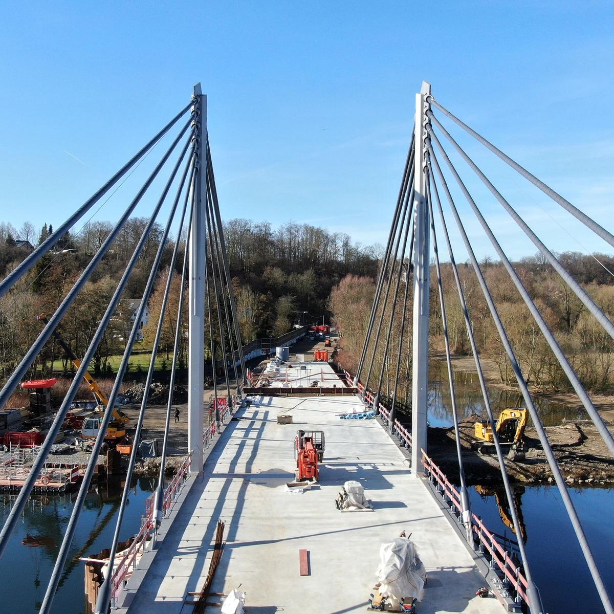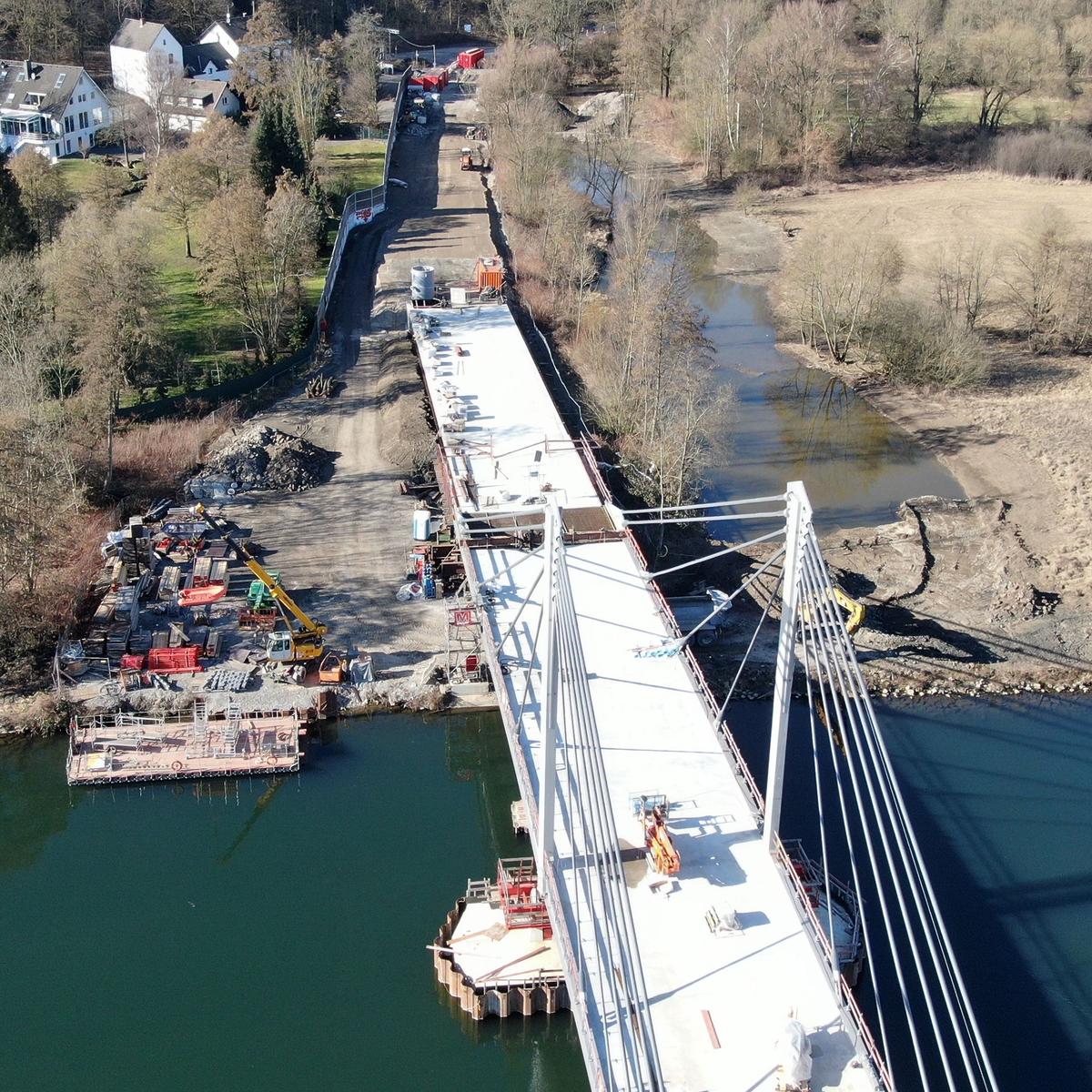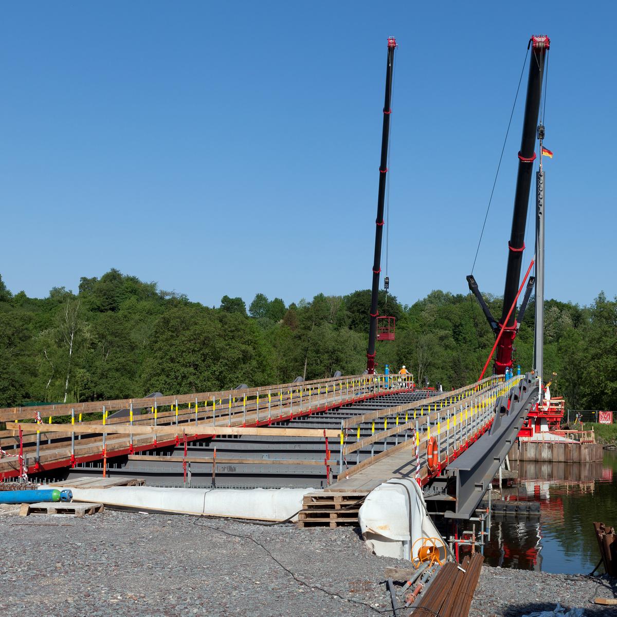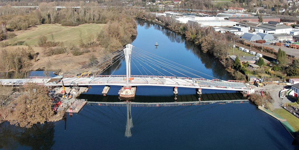 Rückbau der Altbrücke und anschließende Ausführung sämtlicher Erdarbeiten zur Gründung sowie Erneuerung von 1 km Straßenkörper mit Entwässerung und Versorgungsleitungen für den Neubau der 113 m langen Schrägseilbrücke über die Ruhr zwischen Essen-Heisingen und Essen-Kupferdreh in Arge.