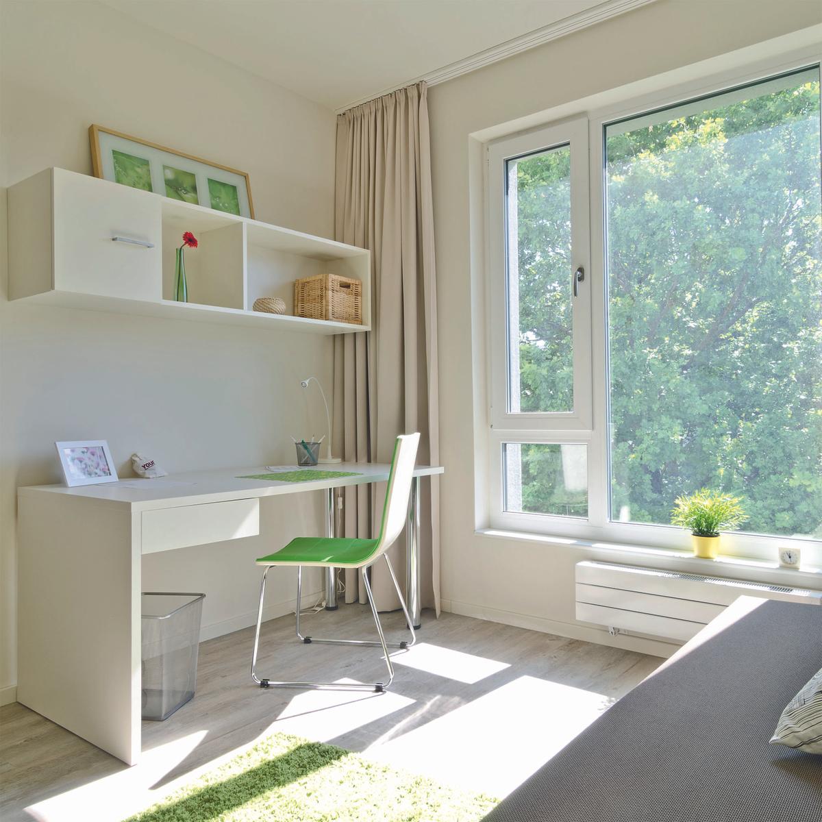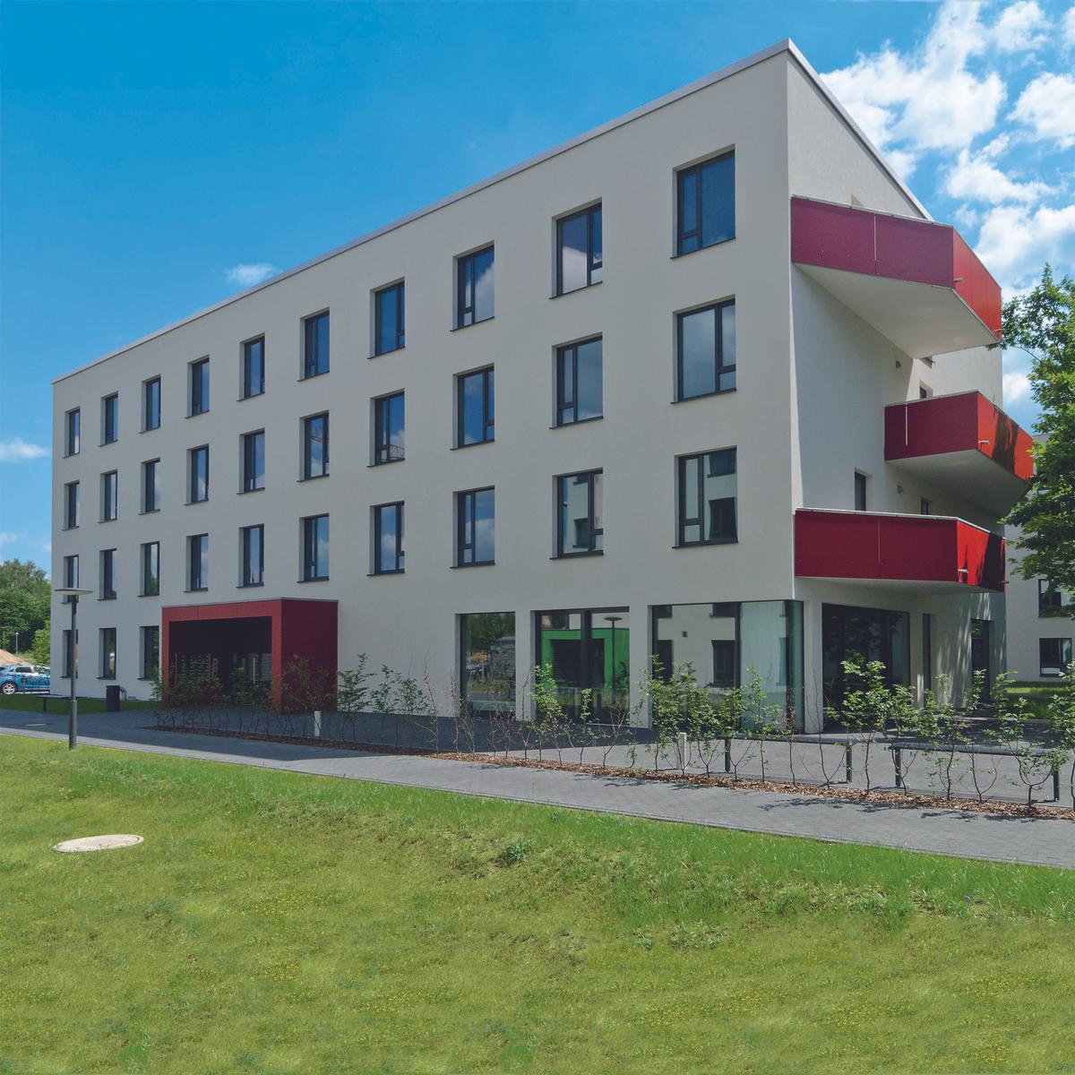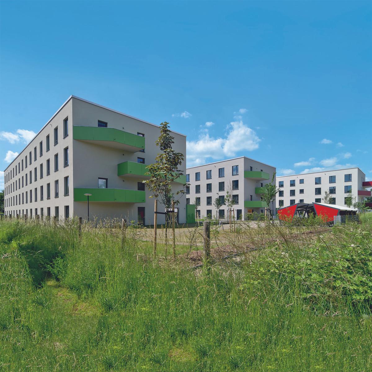 In Potsdam entstand in Auftrag der Frankfurter Youniq AG der schlüsselfertige Neubau der Studenten-Appartementanlage Green Dorms mit 390 Wohnungen und Gemeinschaftsbereichen. Die moderne und funktionale Architektur der Appartementanlage mit 7.200 qm Wohnfläche zeigt sich in großen Fenstern mit einer geringen Brüstungshöhe und den großzügigen Gemeinschaftsbalkonen an den Giebelseiten der vier Wohnkomplexe. Alle Balkone sind auskragend und wurden als Fertigteile montiert. Die Wohnanlage wurde nach den Standards für ein KfW-Effizienzhaus 55 erstellt und erhielt einen Anschluss an das Fernwärmenetz. Die Bauspezialisten realisierten die vier Häuser mittels einer Taktplanung nach dem Köster-Prozess-System.