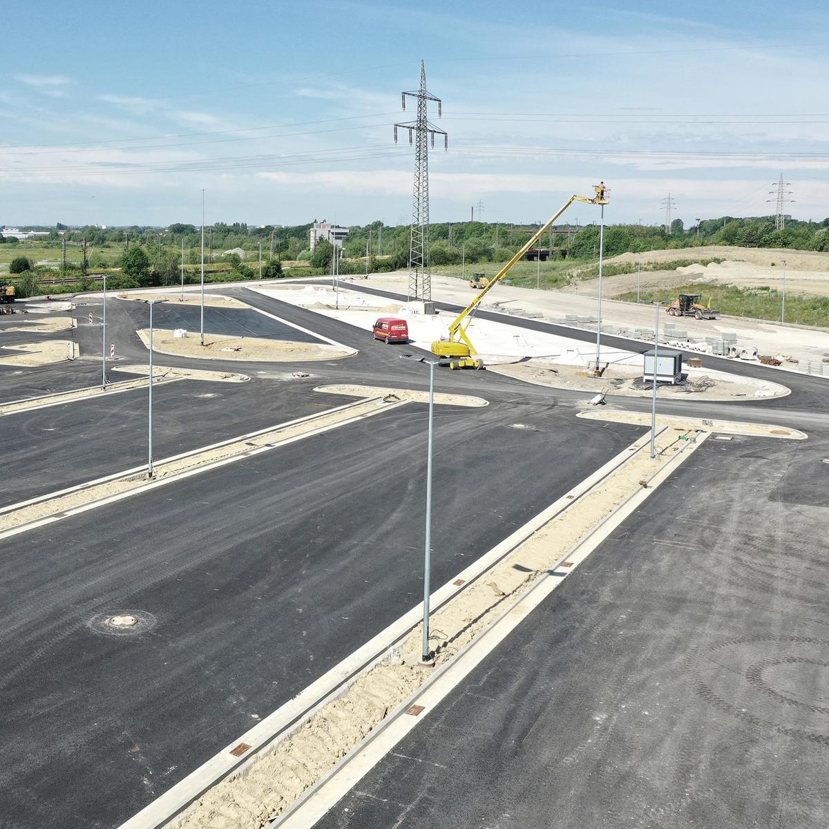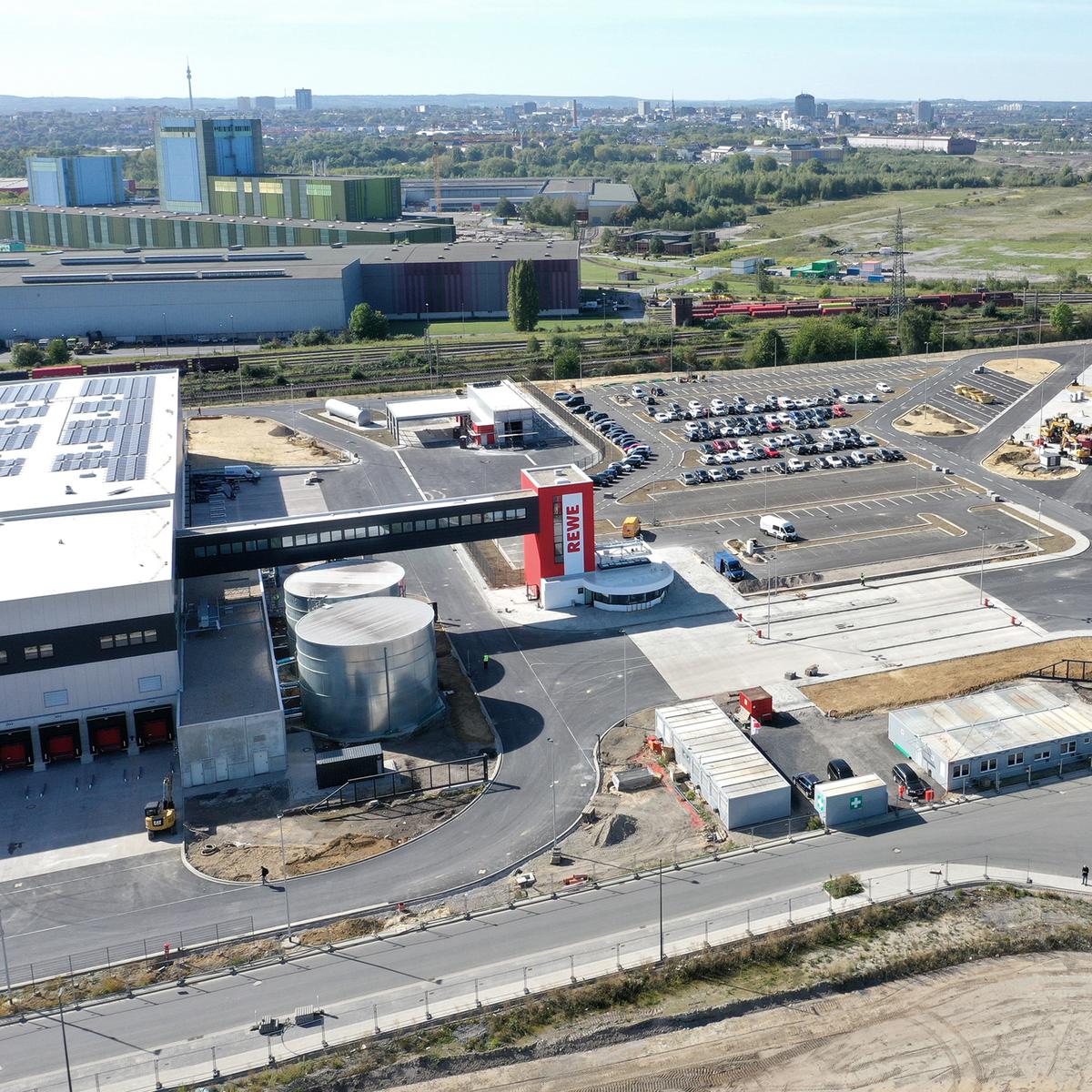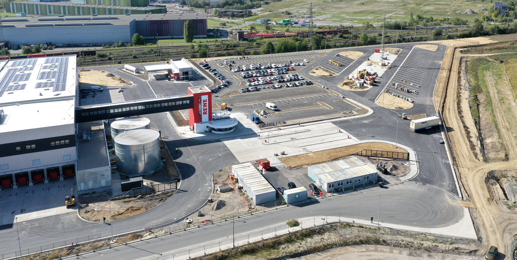 Errichtung der Frei- und Verkehrsanlagen für den Neubau eines Logistik- und Frischezentrums REWE inkl. Erdbauarbeiten. Ein alternatives Köster-Konzept für die bis zu acht Meter hohe Lärmschutzwand konnte den Kunden überzeugen. Die methodische Terminplanung führte zu einem reibungslosen Bauablauf.