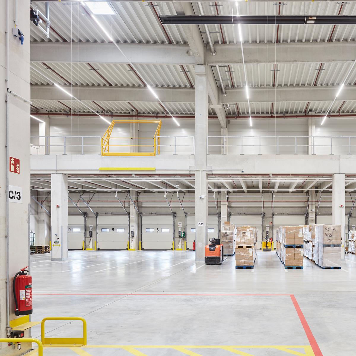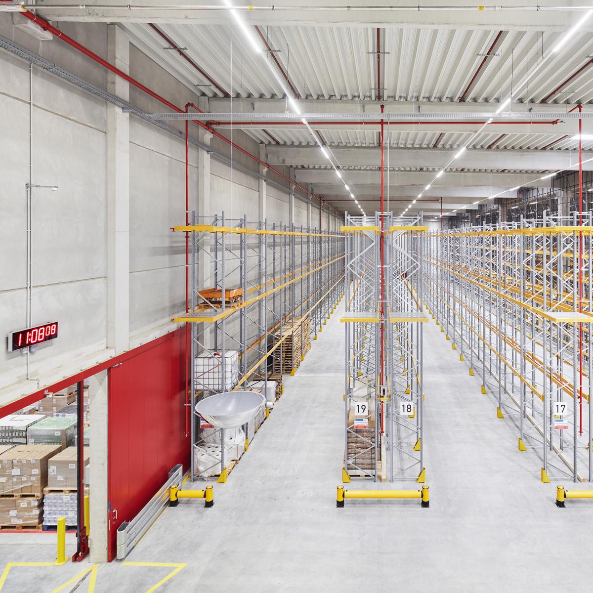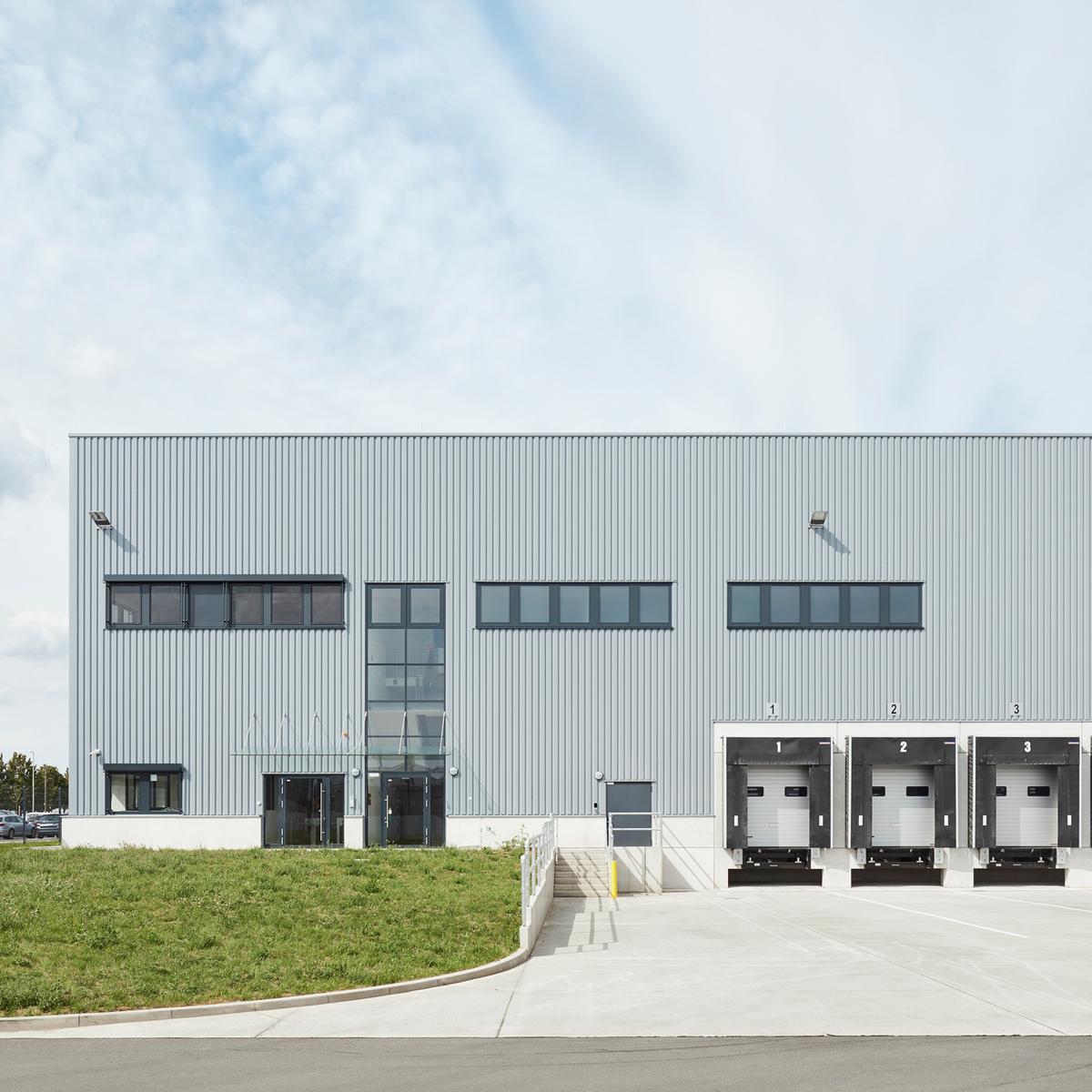 Schlüsselfertiger Neubau einer Logistikimmobilie mit Wareneingang, Kommisionierung, Palettenlagerfläche, Warenausgang sowie Verwaltungs- und Sozialräumen im Obergeschoss. Das Gefahrstofflager ist in zwei Brandabschnitte unterteilt.