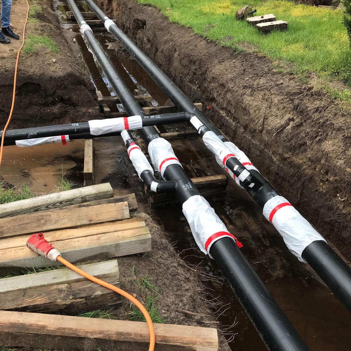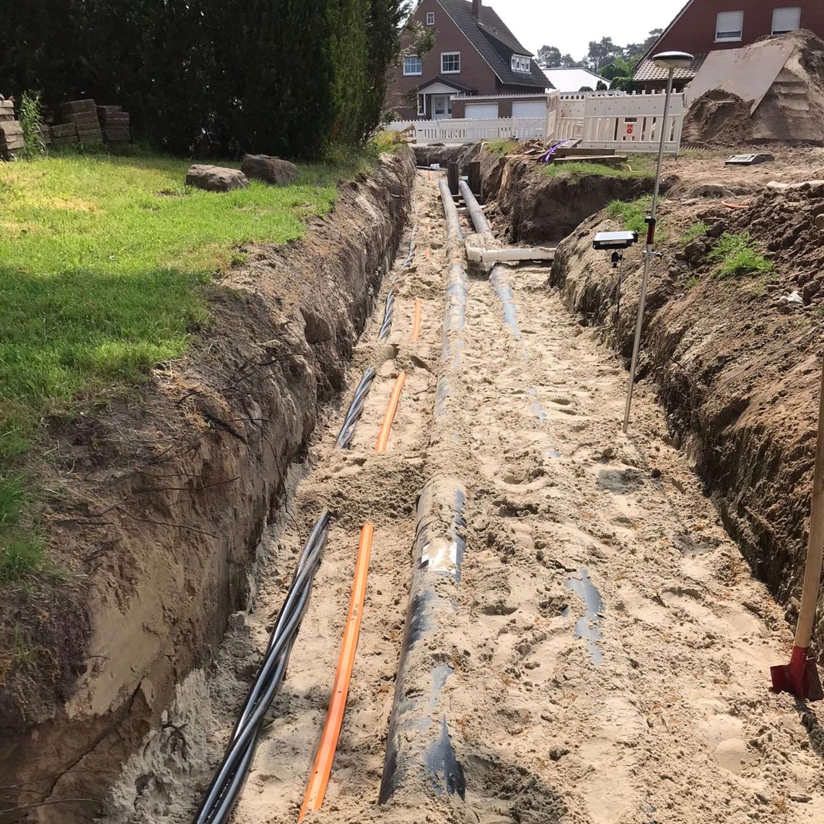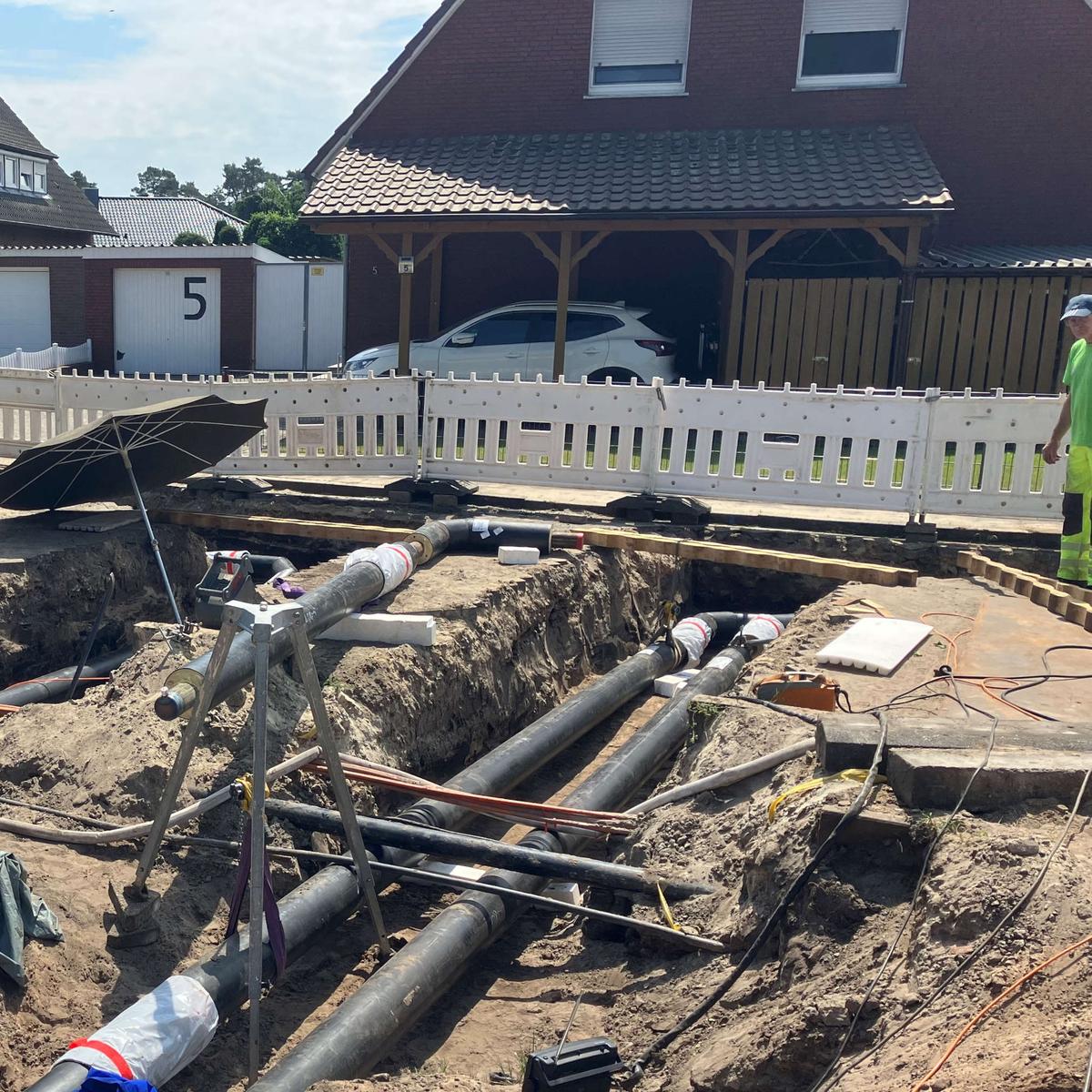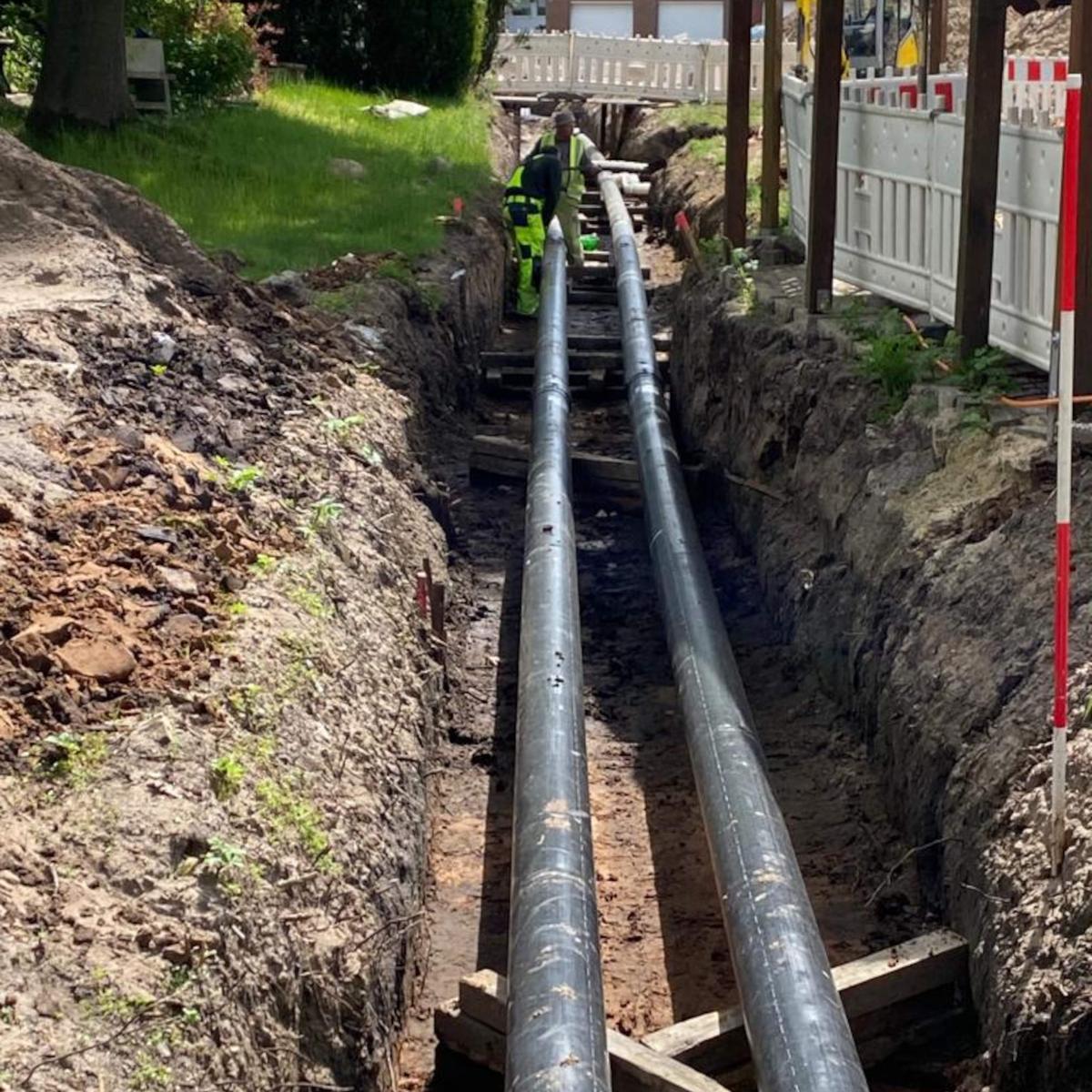 Der Bereich Energieinfrastruktur der Köster GmbH erneuert eine Fernwärmeleitung DN100 mit einer Länge von 130 m inklusive der Hausanschlüsse sowie der Verlegung von NSP- und MSP-Kabeln für die Stromnetzerweiterung am Waldessaum.
