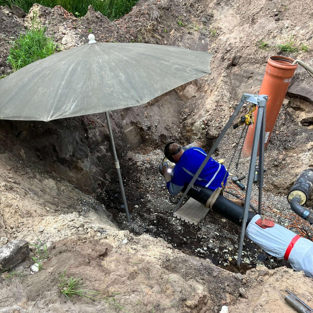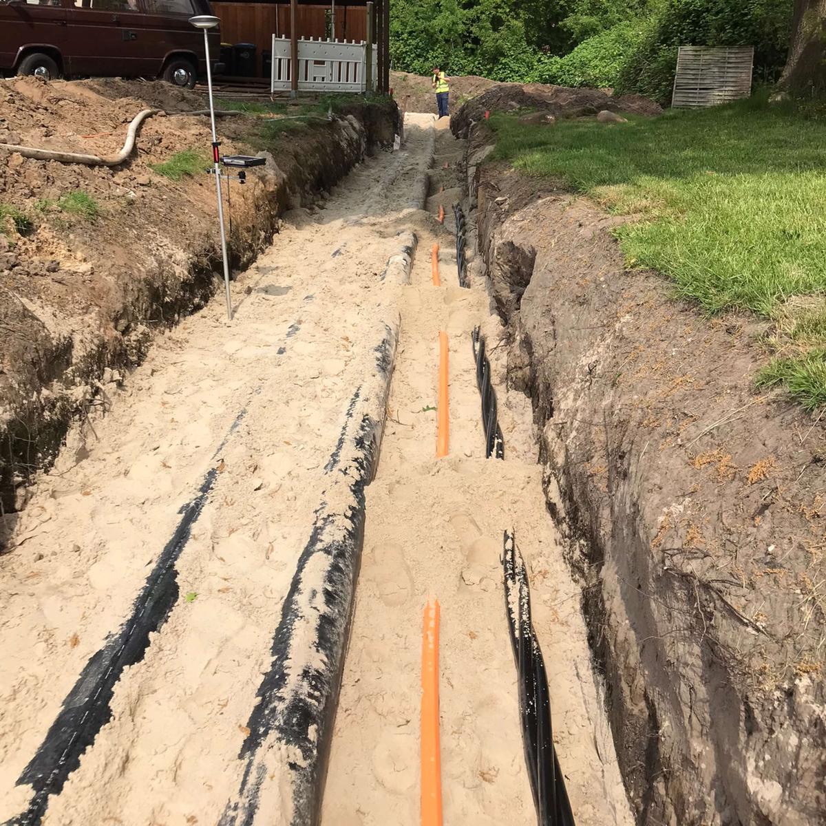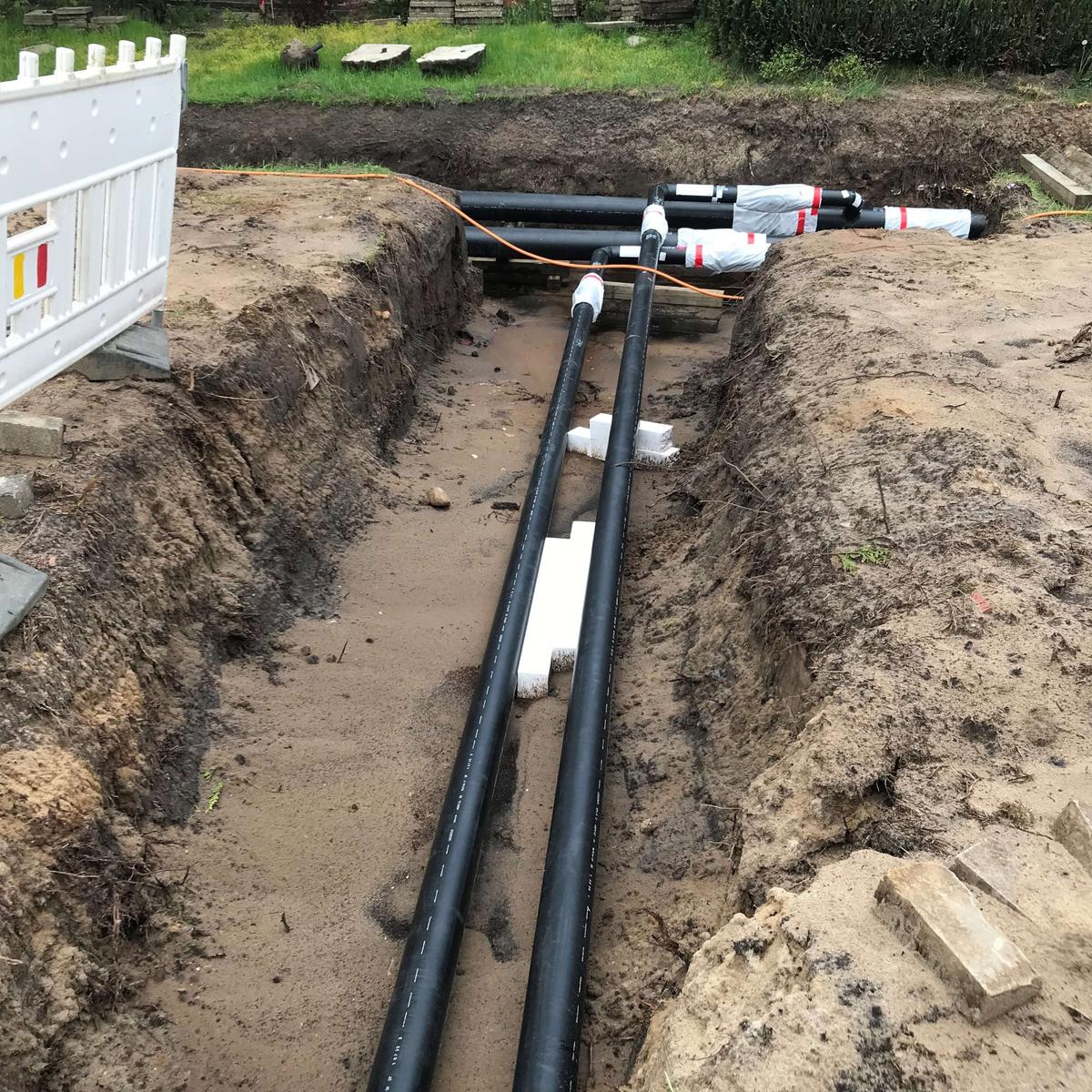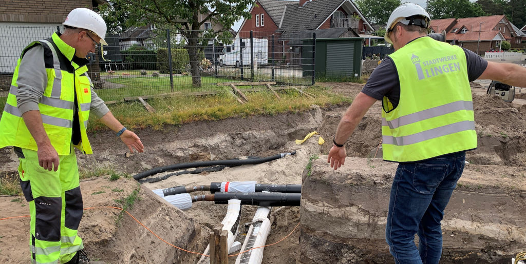 Der Bereich Energieinfrastruktur der Köster GmbH erneuert eine Fernwärmeleitung DN100 mit einer Länge von 130 m inklusive der Hausanschlüsse sowie der Verlegung von NSP- und MSP-Kabeln für die Stromnetzerweiterung am Waldessaum.