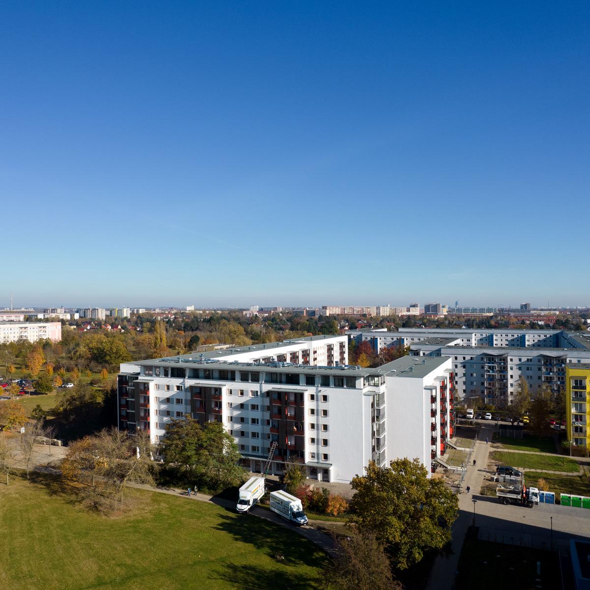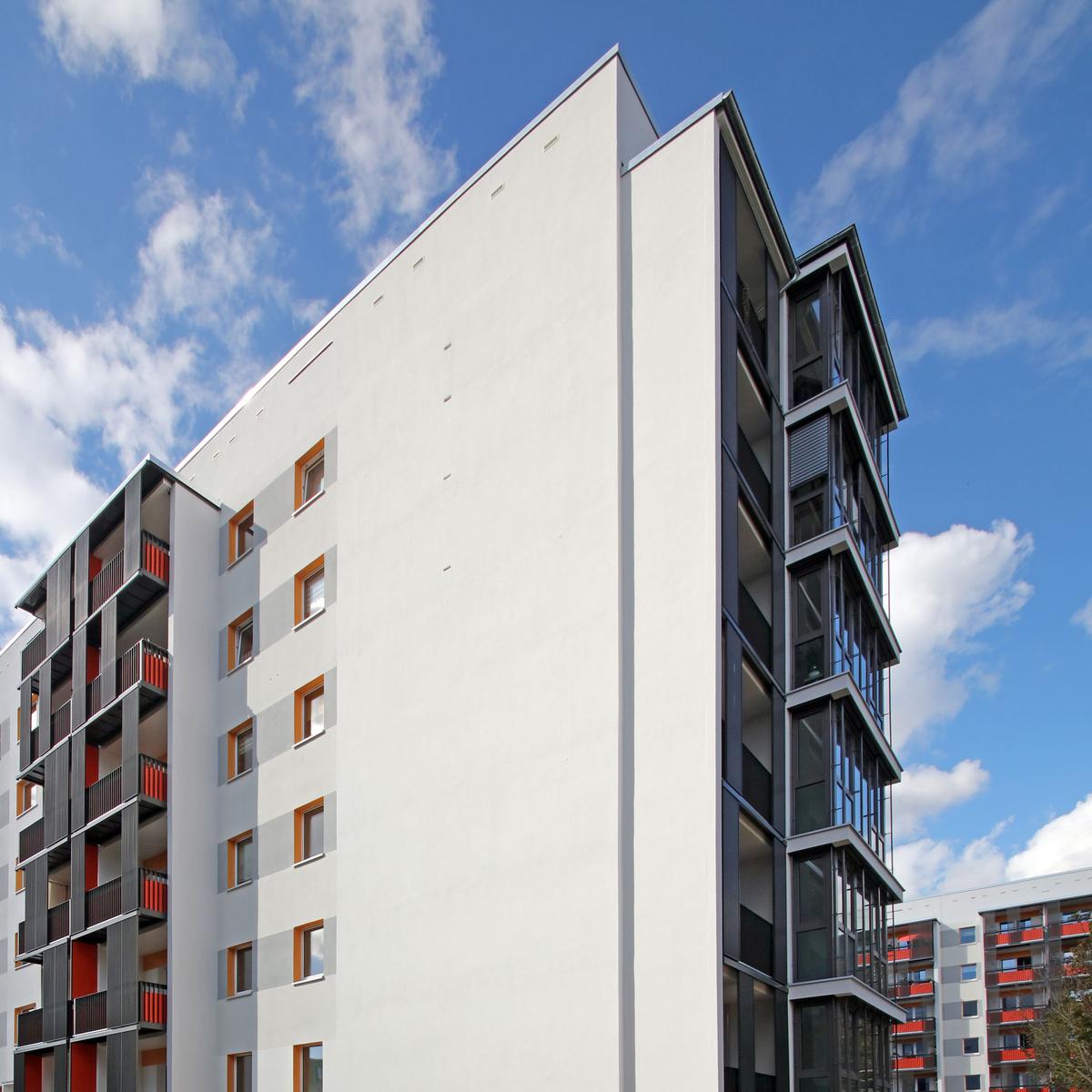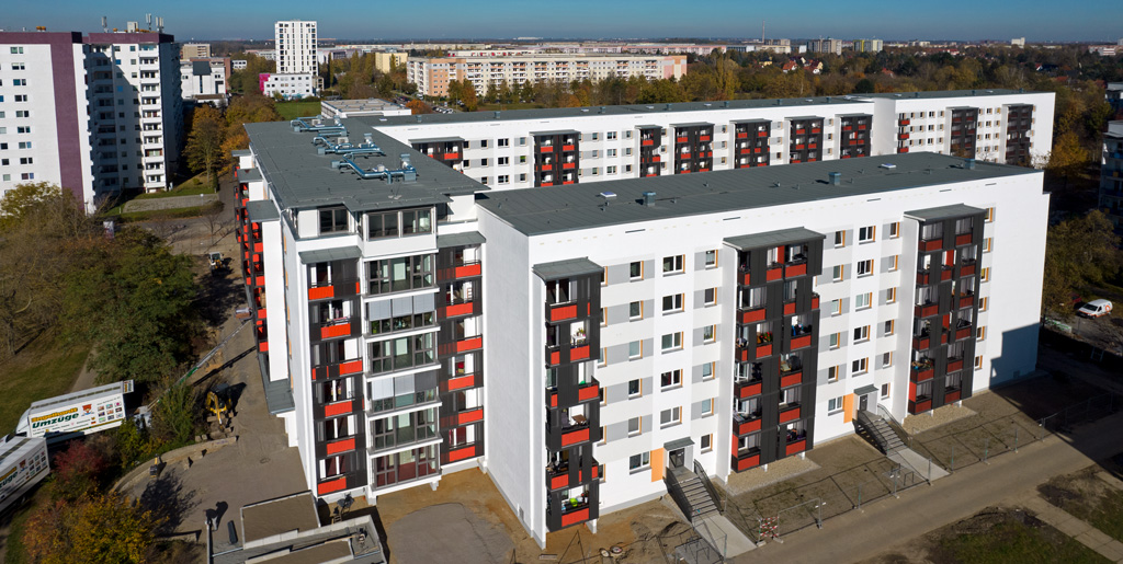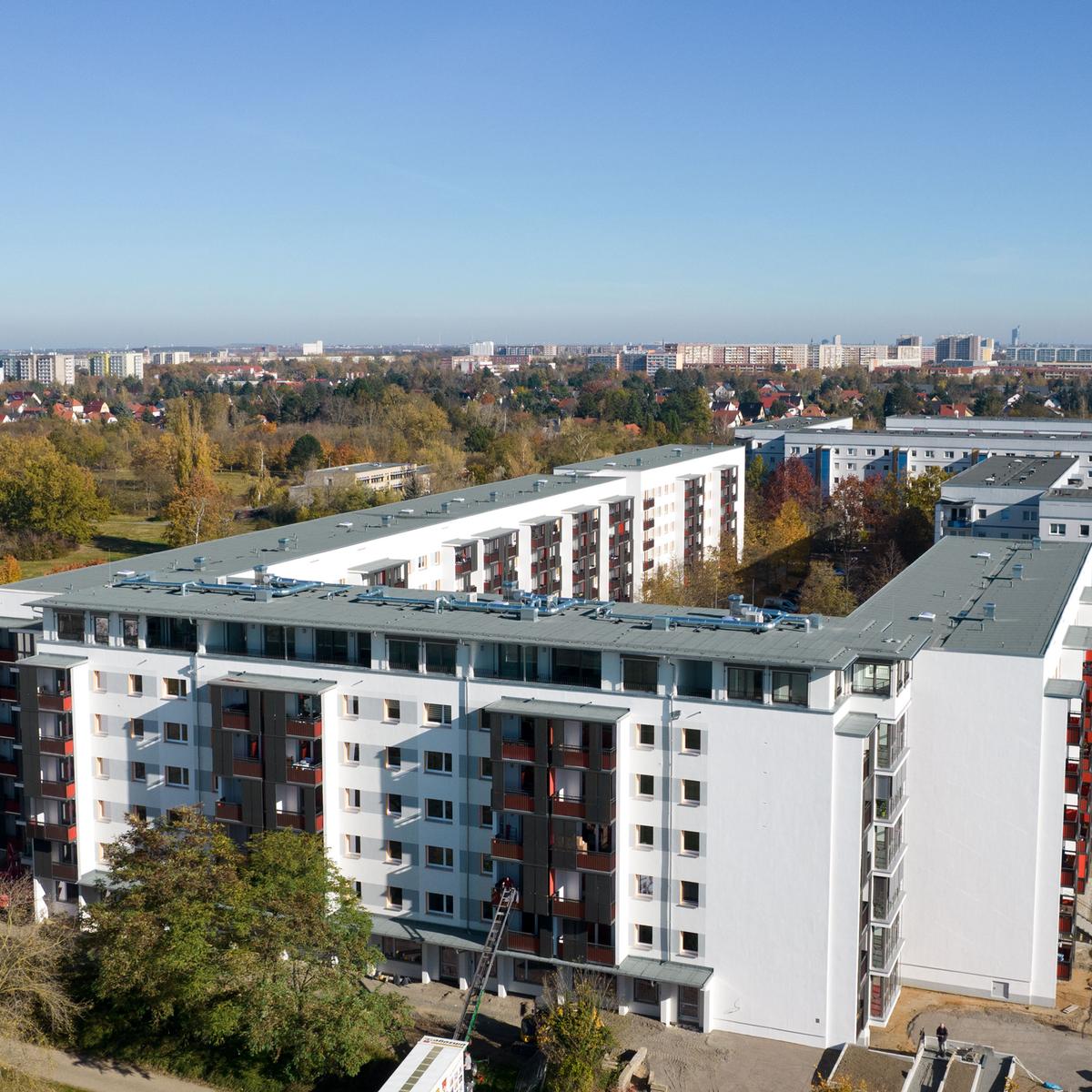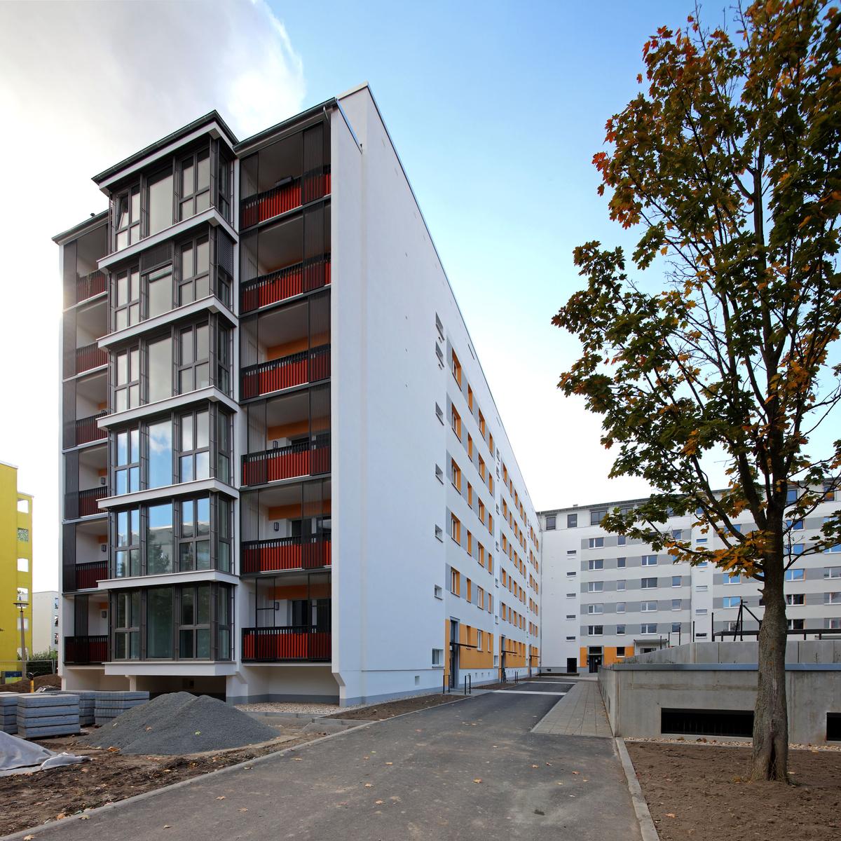 Kernsanierung von fünf Mehrfamilienhäusern mit über 200 Wohnungen, in den 70er Jahren in Plattenbauweise errichtet. Köster stieg mit der Ausführungsplanung ins Projekt des Bauherrn, die Wohnbau-Genossenschaft WBG Kontakt, ein und erhielt den Auftrag für die vollständige Sanierung. Zusätzlich wurde ein Staffelgeschoss mit zehn Wohnungen in Holzbauweise errichtet. Die termingerechte Übergabe ermöglichte eine pünktliche Vermietung ohne Ausfälle.