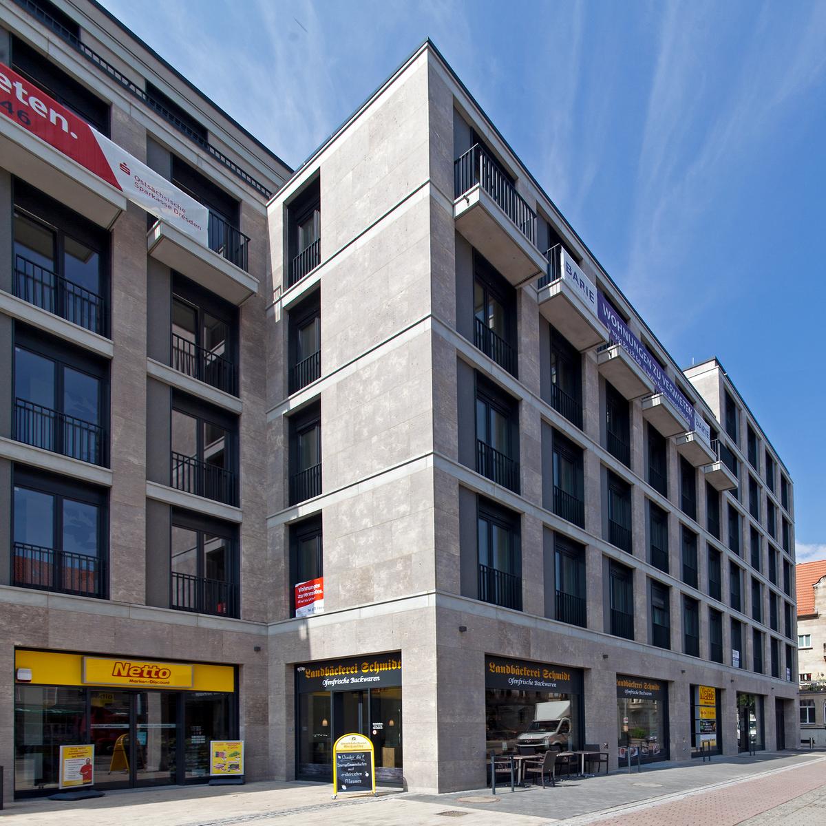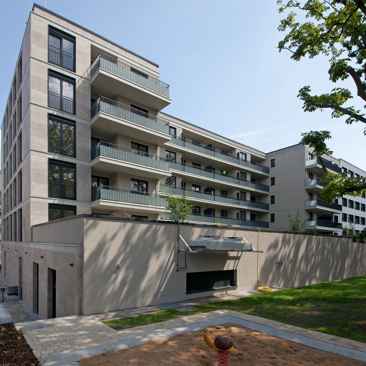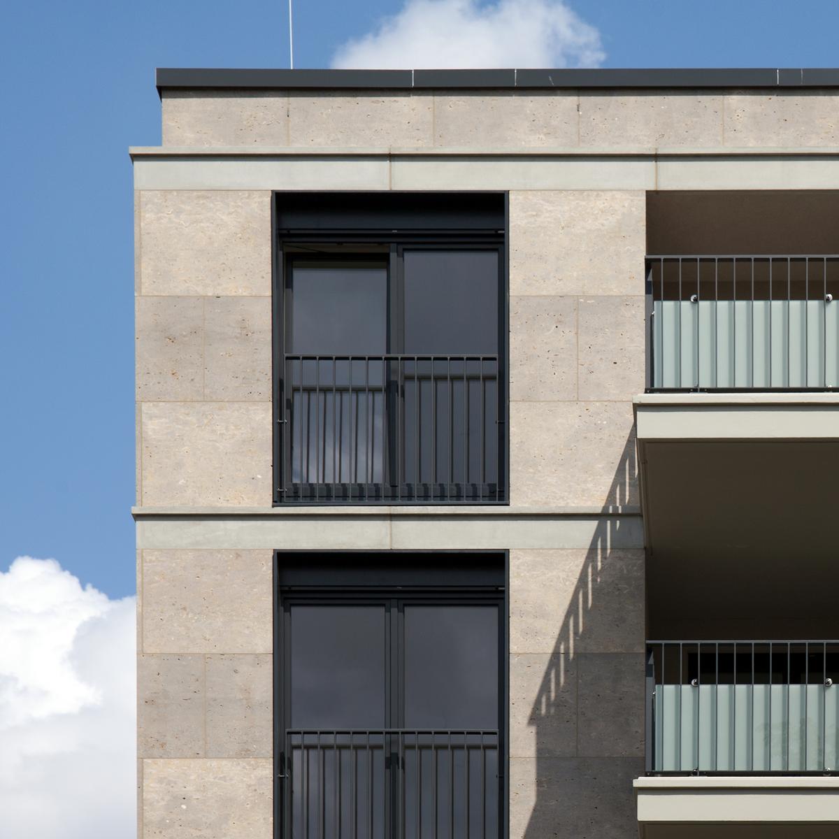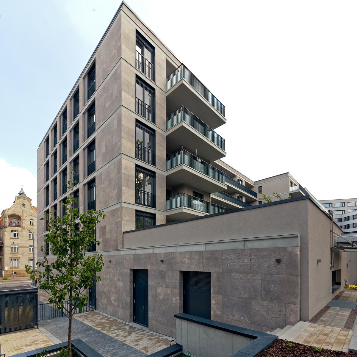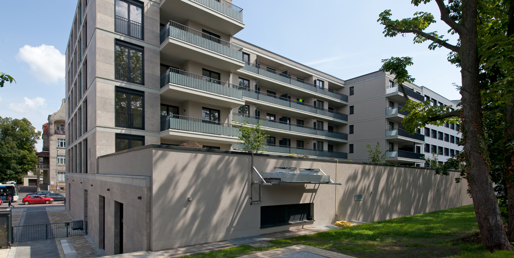 Schlüsselfertiger Neubau eines Wohnhauses bestehend aus 38 Wohnungen in 5 Etagen sowie einer Tiefgarage mit 46 Stellplätzen. Hinter der hochwertigen, hinterlüfteten, rahmenlosen Natursteinfassade verbirgt sich eine besonders hochwertige Ausstattung. Bereits in der Planungsphase wurde diese sehr detailliert bemustert und mit diversen Leitfabrikaten hinterlegt.