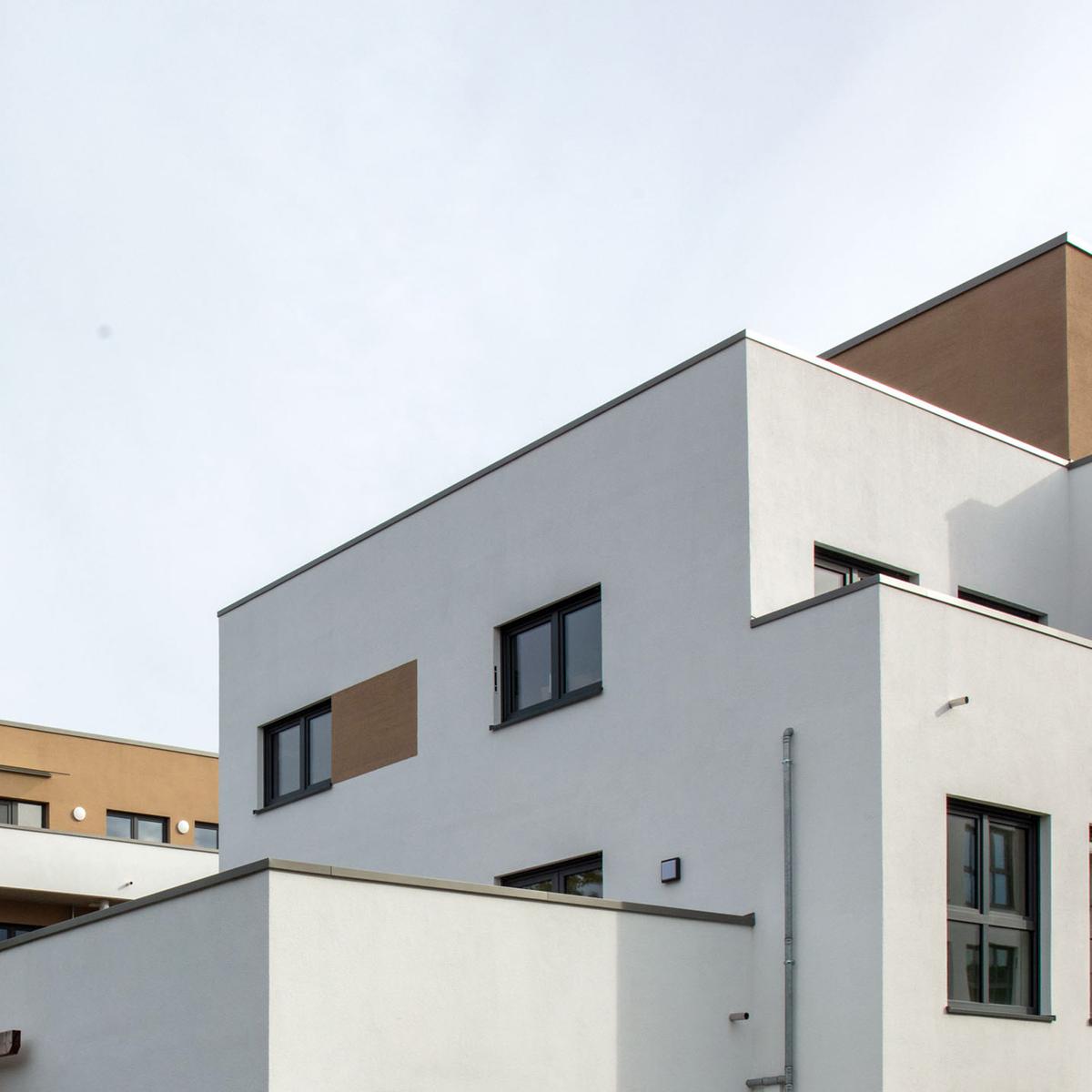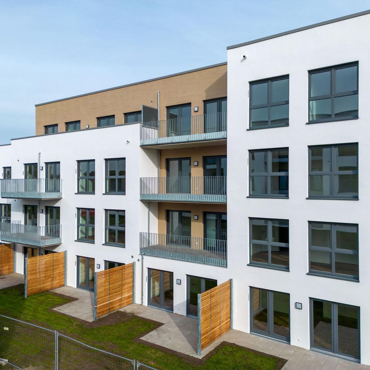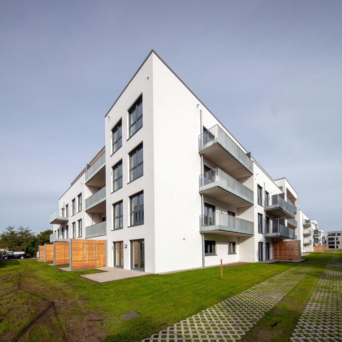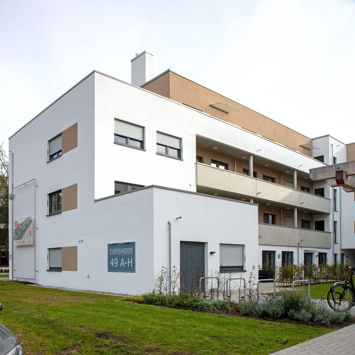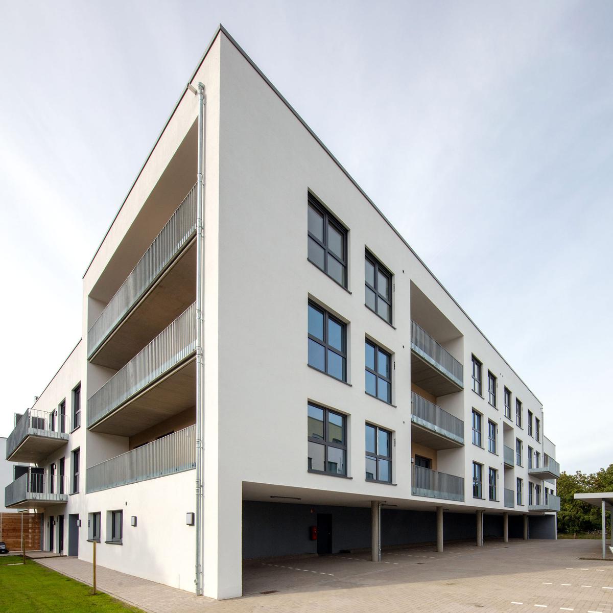 Köster errichtete vier baugleiche Wohngebäude mit je 36 Wohneinheiten und einer Wohngruppe mit Flachgründung. Diese bieten insgesamt eine Wohnfläche von 10.880 m² und wurden als KfW-Effizienzhäuser 55 erstellt. Die Wärmeversorgung wird mithilfe erneuerbarer Energien in Form einer Pelletheizanlage sowie Anschluss ans Nahwärmenetz gewährleistet. Herausfordernd war die Baustellenlogistik aufgrund der engen Zufahrt mitten im Wohngebiet.