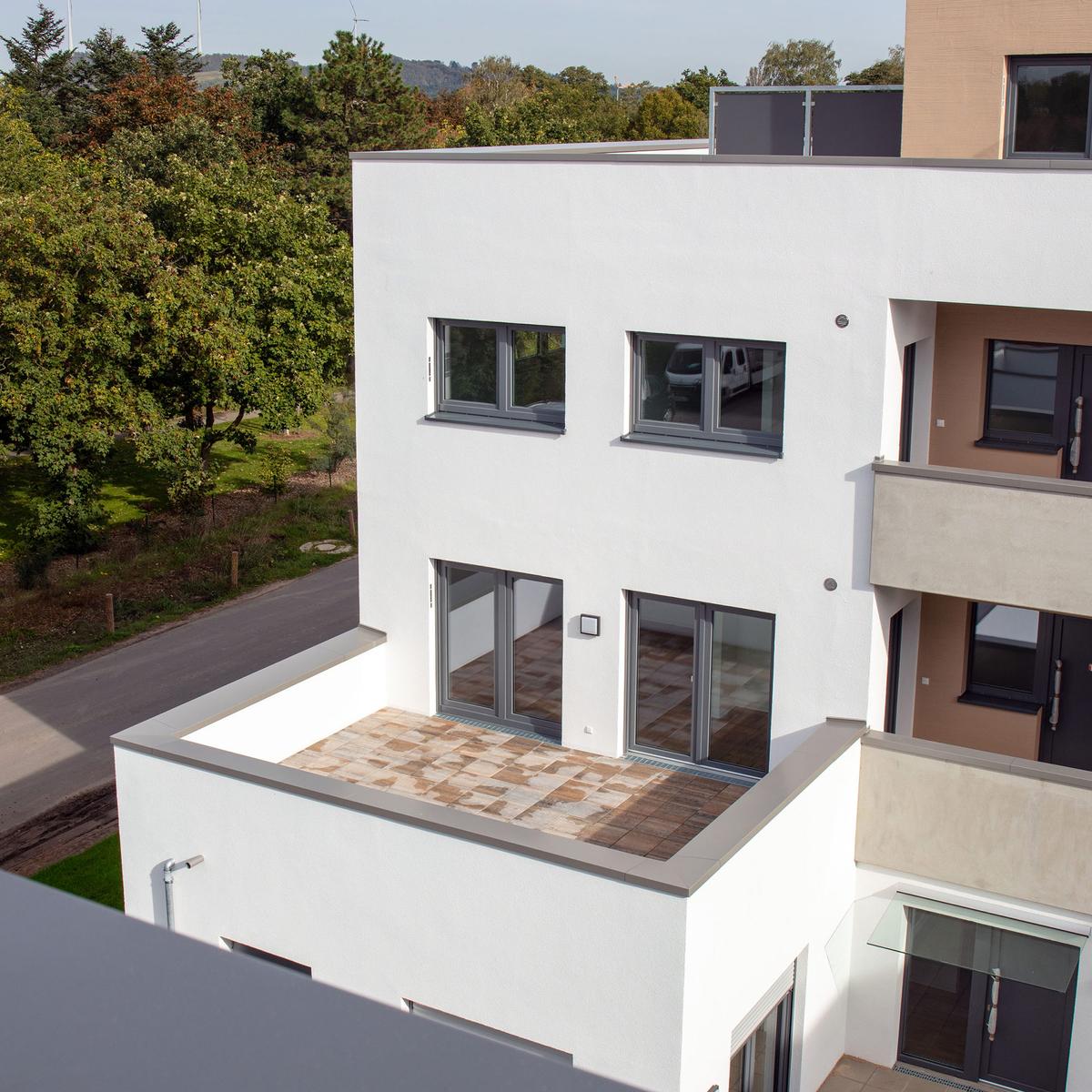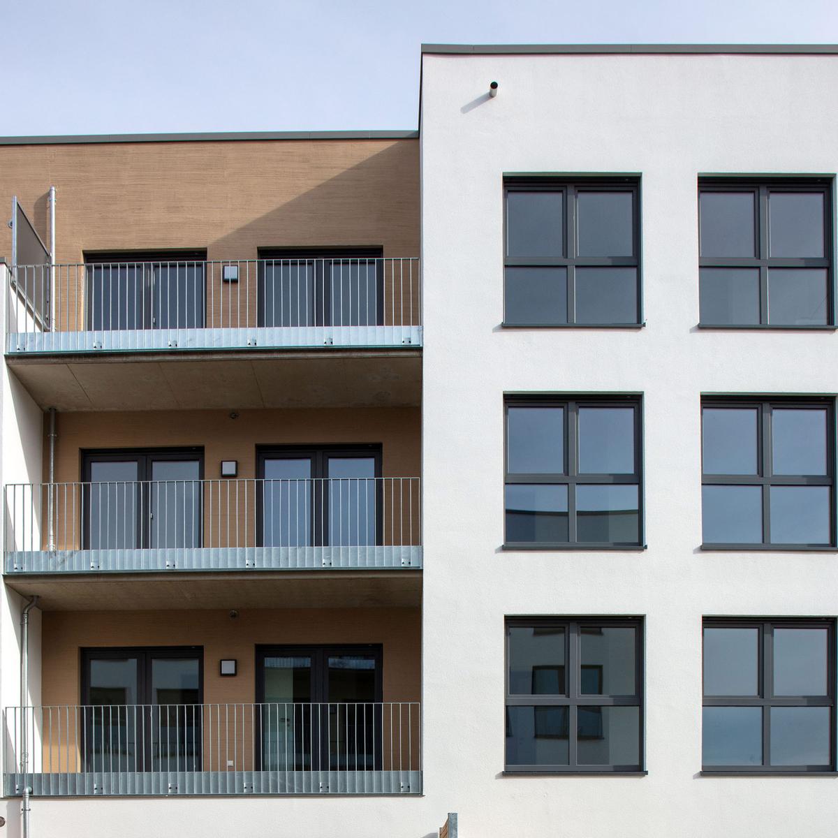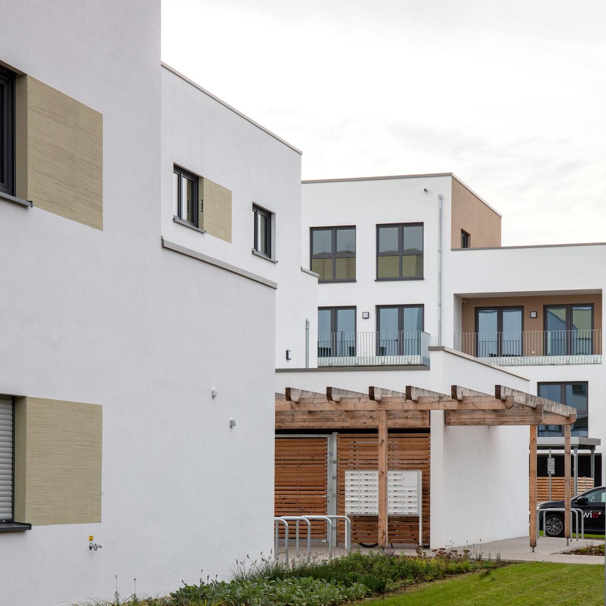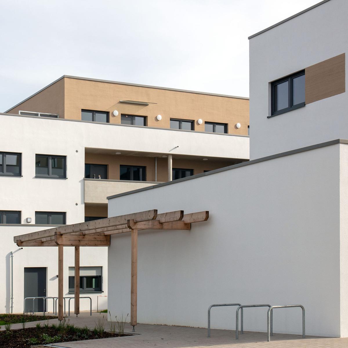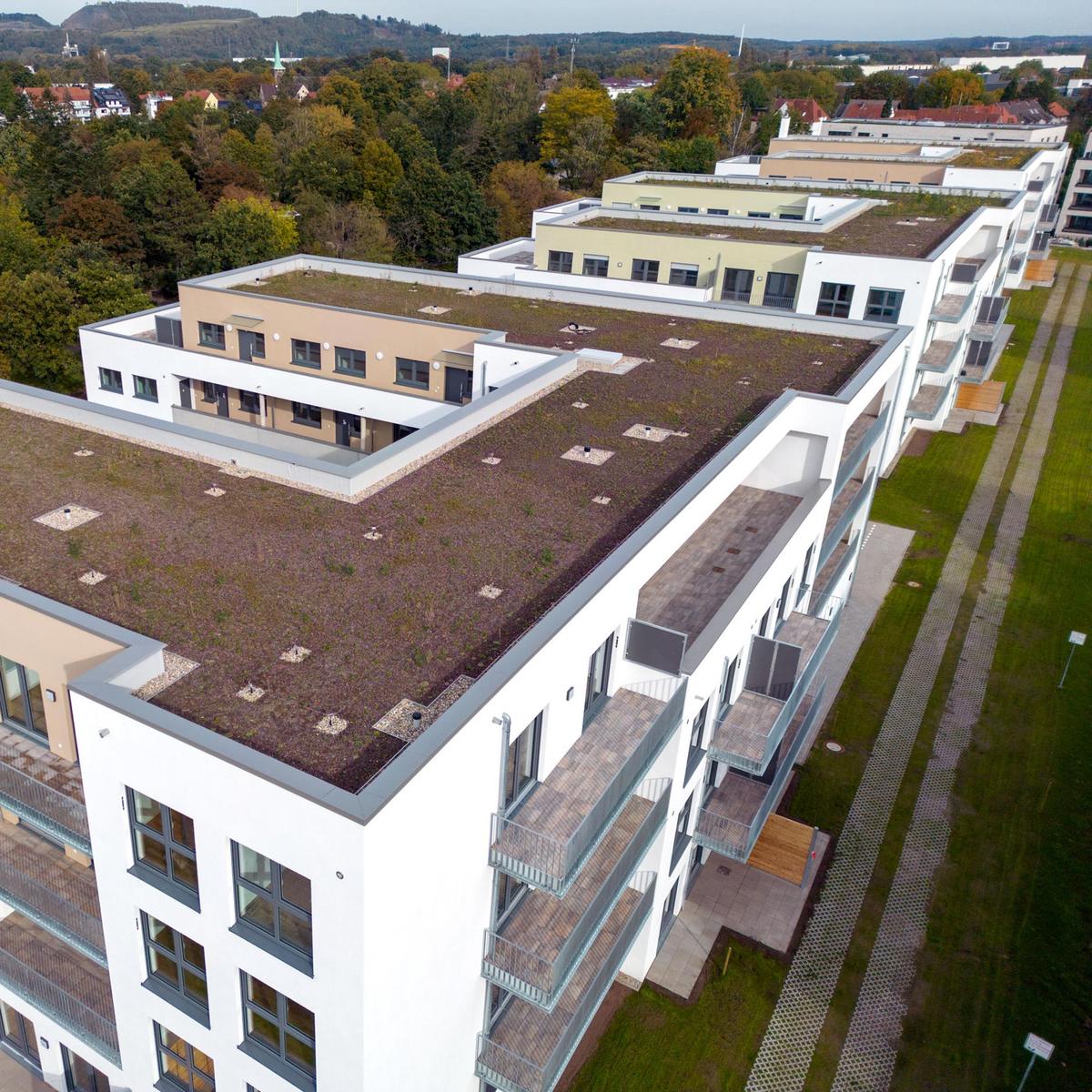Köster errichtete vier baugleiche Wohngebäude mit je 36 Wohneinheiten und einer Wohngruppe mit Flachgründung. Diese bieten insgesamt eine Wohnfläche von 10.880 m² und wurden als KfW-Effizienzhäuser 55 erstellt. Die Wärmeversorgung wird mithilfe erneuerbarer Energien in Form einer Pelletheizanlage sowie Anschluss ans Nahwärmenetz gewährleistet. Herausfordernd war die Baustellenlogistik aufgrund der engen Zufahrt mitten im Wohngebiet.
