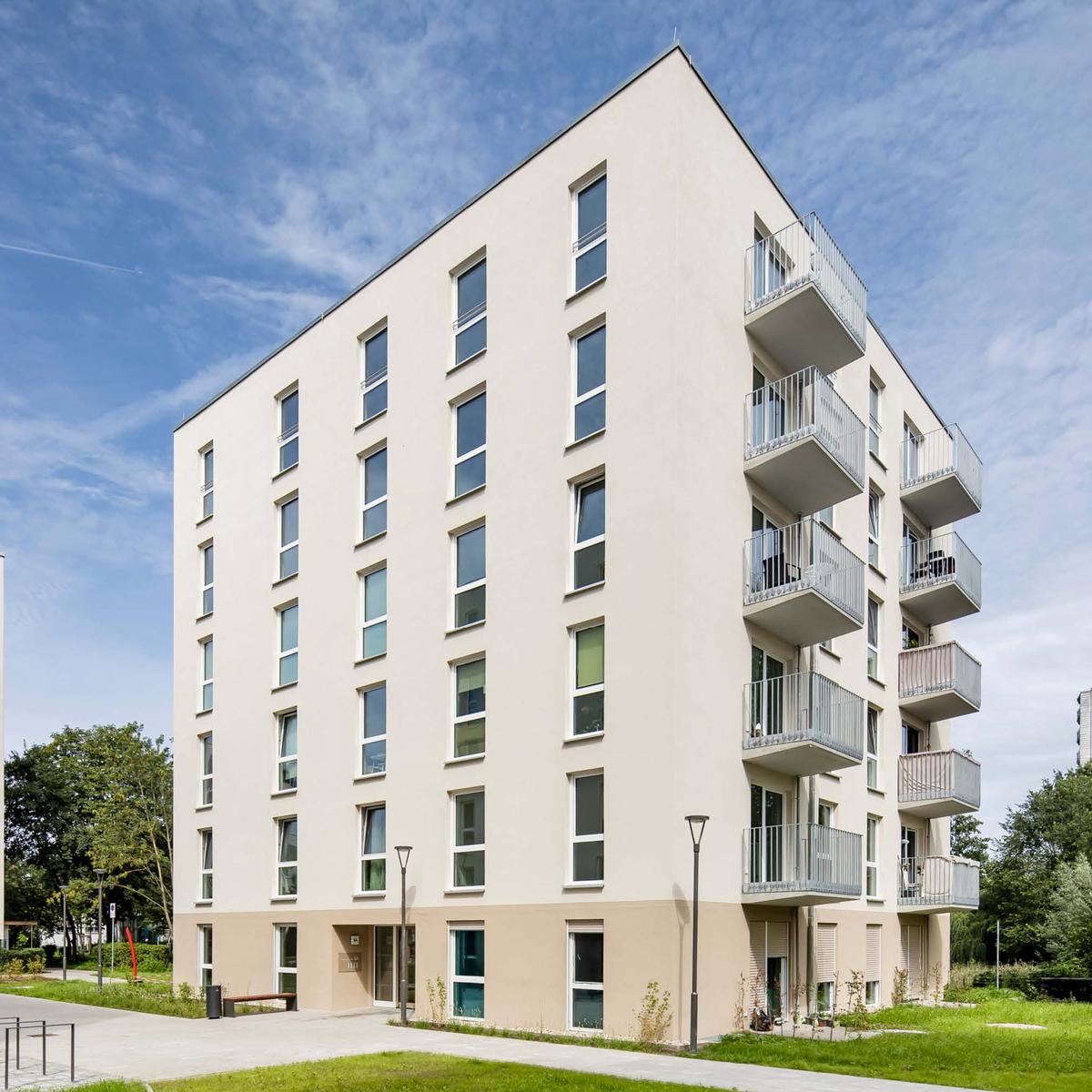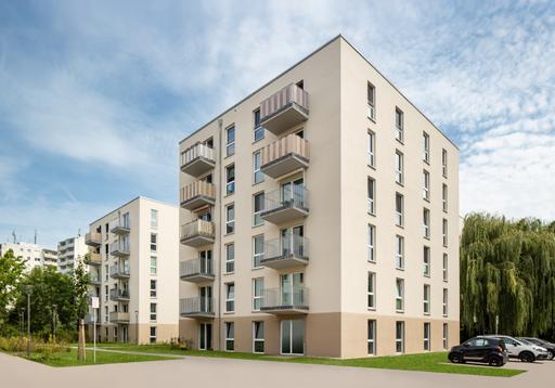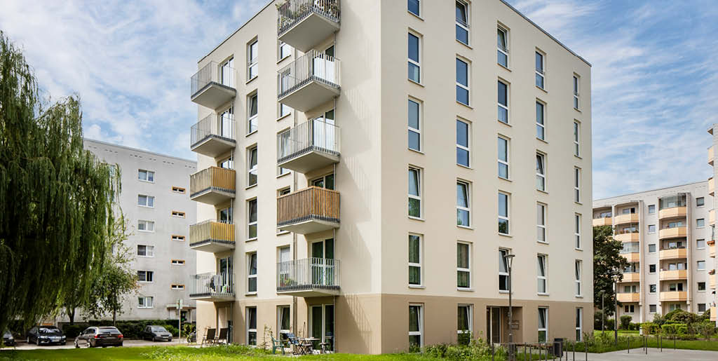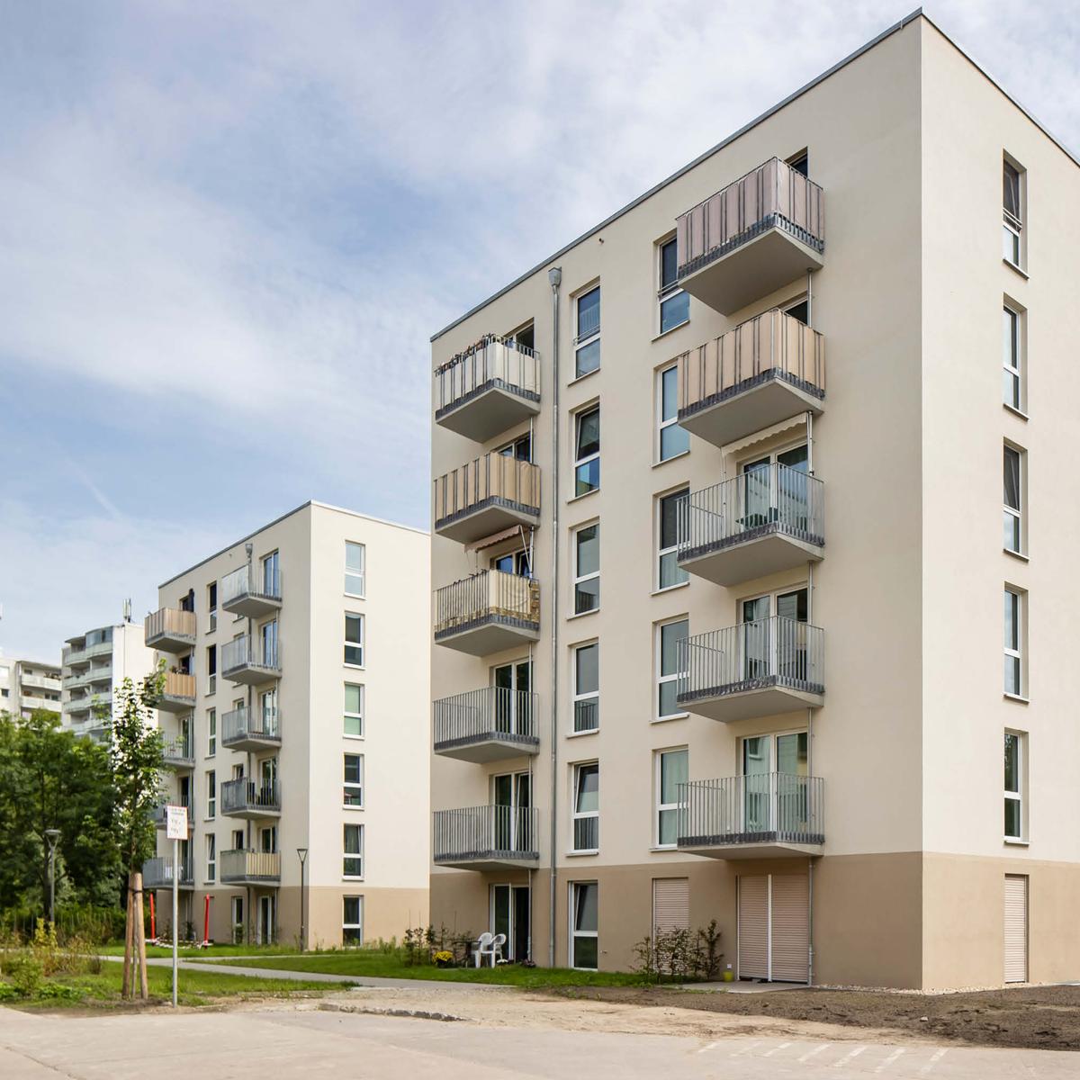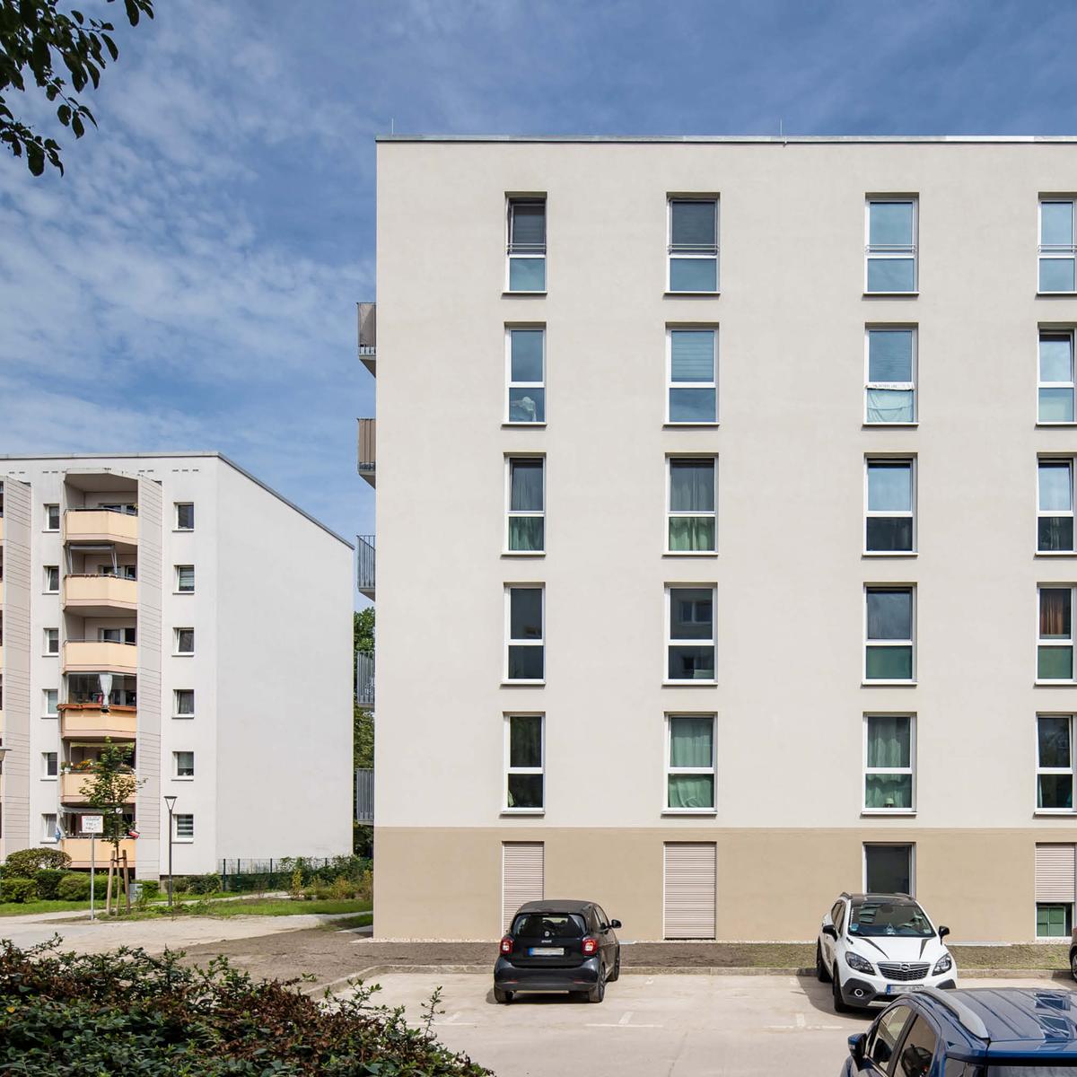In der Woldegker Straße in Berlin wurden zwei unterkellerte Wohngebäude mit insgesamt 48 barrierefreien Wohneinheiten im Effizienzhausstandard GEG EH 55 errichtet. Die versetzte Anordnung der Baukörper sowie die Balkongestaltung orientieren sich an der bestehenden Bebauung. Durch den Einsatz seriell vorgefertigter Bauteile und einer BIM-gestützten Planung konnte eine wirtschaftliche und zeiteffiziente Bauweise umgesetzt werden.