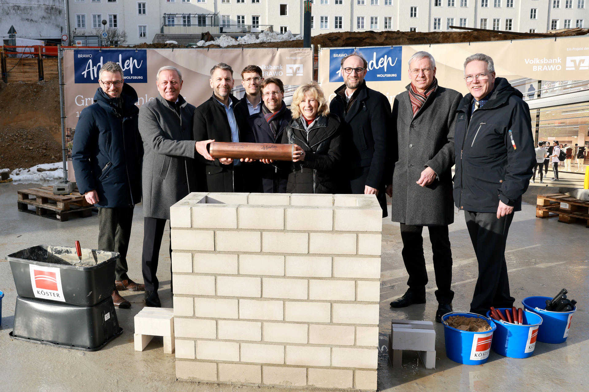 Grundsteinlegung am 15. Januar 2026 mit Zeitkapsel: André Triphaus-Woltermann (Geschäftsführer und technischer Vorstand der Köster Holding SE), Jürgen Brinkmann (Vorstandsvorsitzender der Volksbank BRAWO), Dennis Weilmann (Oberbürgermeister), Benjamin Maspohl (Projektentwickler der BRAWO RE Development Braunschweig), Sebastian Geese (Bereichsleiter Hochbau Braunschweig der Köster GmbH), Claudia Kayser (Leiterin der Direktion Wolfsburg der Volksbank BRAWO), Jens Hofschröer (Stadtrat und Dezernent für Digitales und Wirtschaft), Kai-Uwe Hirschheide (Erster Stadtrat und Stadtbaurat) und Ulf Müller (Geschäftsführer BRAWO RE Building Solutions). In der Zeitkapsel befindet sich eine Tageszeitung, Baupläne der BRAWO Arkaden, Polaroidfotos vom Eventtag sowie Impressionen und ein Poetry-Slam-Text vom 100-jährigen Jubiläum der Volksbank in Wolfsburg vom 6. November 2025 Bildquelle: Matthias Leitzke
