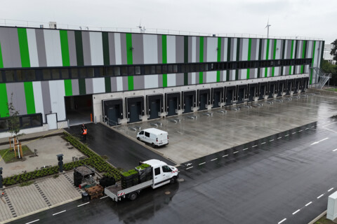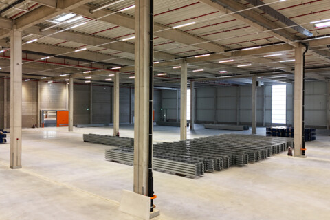 Bei der Konzeption der Halle steht sowohl die individuelle Anpassung an die Anforderungen der WM-Group im Fokus als auch der Aspekt einer eventuellen späteren Nutzung durch andere Mieter. „Das komplette Gebäude verfügt über eine Abdichtung mit einer WHG 3-Folie (Schutz gemäß Wasserhaushaltsgesetz). So kann ein sehr breites Spektrum an Waren hier gelagert und umgeschlagen werden“, nennt Köster-Projektleiter Klaus Häring ein wichtiges Ausstattungsmerkmal für eine flexible Nutzung der Halle. Das Gebäude ist zudem in drei Units aufgeteilt, die durch Brandwände voneinander getrennt werden. Unit 1 mit 8.000 m² und Unit 2 mit 8.900 m² verfügen über insgesamt 26 Verladerampen. Die mit 5.800 m² kleinste Unit 3 hat fünf ebenerdige 6 m x 4,50 m große Zufahrtstore. In der Außenfassade des Logistikbereiches sind zusätzliche Lichtbänder aus Polycarbonat in den Abmessungen ca. 4,00 m x 11,00 m angeordnet, die für ausreichendes Tageslicht sorgen. Der gesamte Logistikbereich wird über Wärmepumpen beheizt. In den Sozial- und Bürobereichen kommt die VRF-Technologie (Variable Refrigerant Flow) zum Einsatz. 2.640 m² Mezzanine bieten zusätzlichen Lagerraum. „Diese Flächen können dank der eingebauten Lichtbänder gegebenenfalls später auch als Büros ausgebaut werden“, erklärt Klaus Häring. Derzeit gehören 800 m² Büro- und Sozialräume zu der Immobilie.