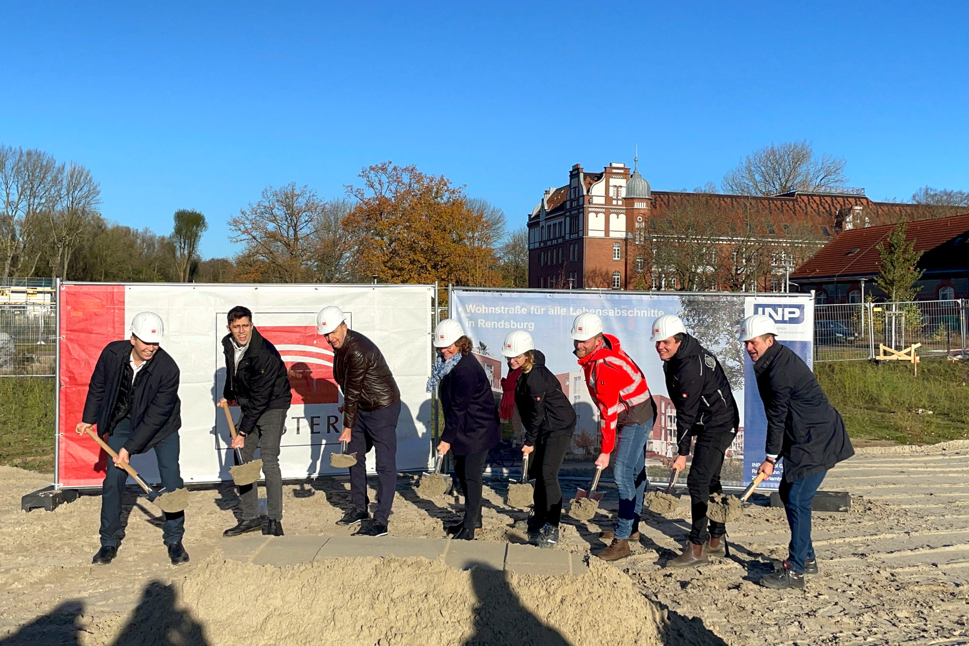 Gestartet sind die Arbeiten mit dem offiziellen Spatenstich am 17. November 2025. In Zukunft werden die Gebäude das östliche Entrée des Baugebiets Neuwerk-West an der Arsenalstraße in Rendsburg bilden. Hier soll bis Ende 2027 ein interessanter Wohnraum-Mix für verschiedene Zielgruppen entstehen – oder wie die INP-Gruppe schreibt: „Eine Wohnstraße für alle Lebensabschnitte“. In sechs der überwiegend viergeschossig angelegten Gebäude befinden sich 71 sozial geförderte Mietwohnungen mit 50 bis 100 m² Wohnfläche. Ergänzt werden diese durch 14 Microappartements mit 25 m² Wohnfläche. Letztere sind insbesondere für Auszubildende, beispielsweise der Schön-Klinik Rendsburg, vorgesehen. In drei weiteren Gebäuden entstehen 54 barrierefreie Seniorenwohnungen. Sie werden durch ein Büro für einen ambulanten Pflegedienst sowie einen Gemeinschaftsraum ergänzt. Tim Cronenberg, Projektverantwortlicher der INP-Gruppe, verzeichnet ein großes Interesse bei „ganzen Gruppen engagierter Jungsenioren“. Schon vor dem Baustart gab es 110 Nachfragen potenzieller Mieter: „Sie möchten eigene Ideen, etwa einen gemeinschaftlichen Gemüse- und Kräutergarten, in das Projekt mit einbringen. Das freut uns ganz besonders, denn es bedeutet, dass sich schon jetzt eine aktive und starke Nachbarschaft abzeichnet.“