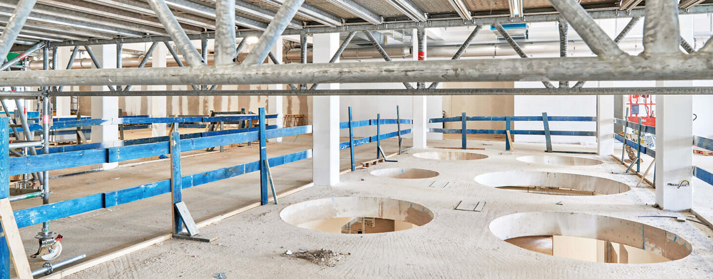 Der errichtete Rohbau mit einer Nutzfläche von 7.200 m² umfasst ein Untergeschoss, zwei Produktionsebenen und ein Dachgeschoss als Lüftungszentrale. Bildquelle: Köster GmbH