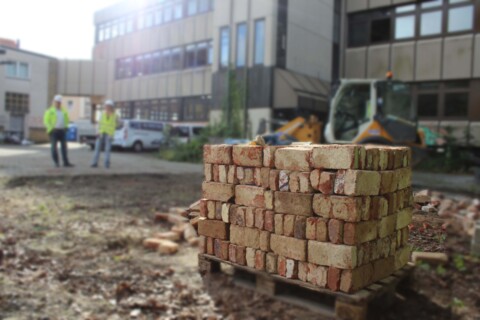 „Ganz konkret werden die alten Ziegelsteine rückgebaut, gesäubert, beprobt und zertifiziert. Bis zum geplanten Wiedereinbau in die Neubauten werden sie zwischengelagert. Dieser Prozess macht den Wert für Umwelt, Klima und Natur deutlich. Denn durch die Wiederverwendung von Ziegeln werden nicht nur Entsorgungskosten vermieden, sondern auch Brennenergiekosten und rund 27,7 kg CO₂ je m² eingespart, da keine neuen Ziegel produziert werden müssen.“