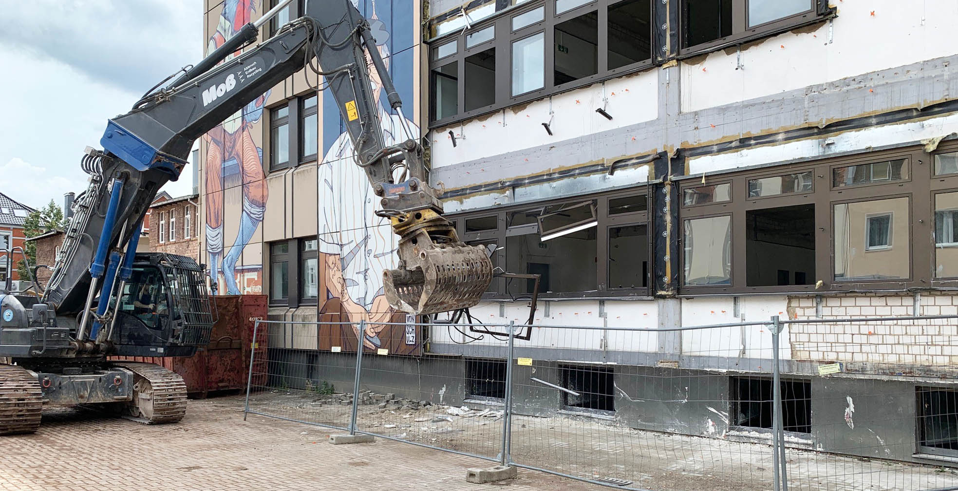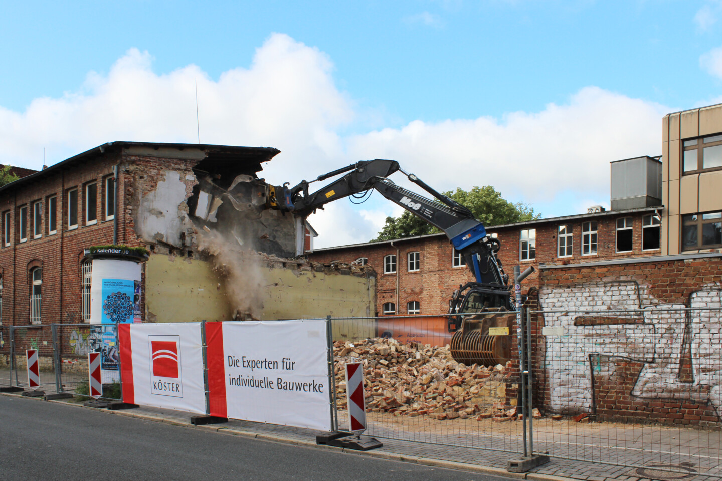 Unter Köster-Regie fand im Sommer 2025 der Rückbau statt. Die Bestandsgebäude stammten aus unterschiedlichen Epochen: Ein Verwaltungsgebäude aus den 80er-Jahren und weitere Gebäude aus den ersten Jahren des 20. Jahrhunderts. Vor allem die älteren Gebäude mit Klinkern und Sandsteinen hatten durchaus Charme und wären gerne erhalten worden. Die Begehung mit Architekten und anderen Bau-Spezialisten machte jedoch schnell deutlich, dass eine Sanierung wirtschaftlich nicht darstellbar ist.