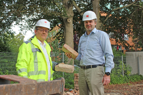 Der derzeit verantwortliche Projektleiter Meik Wibbeler (links) sowie der Architekt und Köster-Berater für Kreislaufwirtschaft Mark Niehüser sind begeistert vom Ergebnis der Ziegel-Ernte bei dem Projekt in Osnabrück. Foto: Köster GmbH