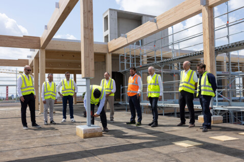 Einige der ungewöhnlichen baulichen Lösungen erwähnte auch Mannheims Oberbürgermeister Christian Specht in seinem Grußwort. So habe man beim Bau der Decken beispielsweise Gehwegplatten in Sand verlegt. Dieser Deckenaufbau gewährleistet einerseits den Brand- und Schallschutz in der Holzkonstruktion und ist außerdem komplett rückbaubar. Hitachi sei eben ein Unternehmen, das sich nicht mit Standardlösungen zufriedengebe, sondern die Herausforderungen des Klimawandels aktiv annehme – ebenso wie Mannheim mit dem „Local Green Deal“, so Christian Specht. Der Oberbürgermeister stellte zufrieden fest, wie weit das Projekt bereits fortgeschritten ist. Er freue sich schon auf die Einweihung, zuvor werde er das innovative Gebäude aber noch bei einem internationalen Großereignis präsentieren: „Ich freue mich, dieses Gebäude auf der Weltausstellung in Osaka vorstellen zu dürfen.“