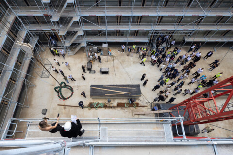 Beim Richtfest mit Bauherr, Handwerkern, Hitachi Energy, Architekturteam und Oberbürgermeister Specht war der Bau der neuen Unternehmenszentrale bereits weit fortgeschritten. Die Gäste bekamen einen Eindruck von den Büroflächen auf 9.000 m². Bildquelle: Felix Krumbholz