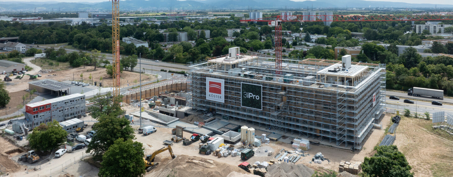 Zum Richtfest, das Köster mit den Handwerkern, dem Bauherrn 3iPro, dem zukünftigen Mieter Hitachi Energy, der AllesWirdGut Architektur ZT GmbH, dem Oberbürgermeister der Stadt Mannheim Christian Specht und vielen weiteren Gästen feierte, ist der Bau der neuen Unternehmenszentrale von Hitachi Energy bereits weit fortgeschritten. So konnten sich die Gäste gut vorstellen, wie auf rund 9.000 m² zukunftsweisende Büroräumlichkeiten entstehen – in ökologisch nachhaltiger Holzbauweise, mit Photovoltaik, Geothermie und unter Einhaltung höchster ESG-Standards. Dafür wurde das Projekt bereits mit dem Platin-Vorzertifikat der Deutschen Gesellschaft für Nachhaltiges Bauen (DGNB) ausgezeichnet und von der Stadt Mannheim mit der Local-Green-Deal-Plakette geehrt. Der Anspruch des Projektentwicklers 3iPro an das erste Gebäude im HCC ist hoch:
