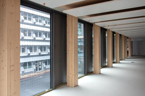 Die Holz-Hybrid-Bauweise zeigte ihre Stärken schon in der Bauphase. Nachdem der Rohbaukern mit Treppenhaus und Aufzugschacht erstellt war, begann die Montage der Holz-Hybrid-Elemente. Deren Oberseite besteht aus Beton, während die später als Decke sichtbare Unterseite aus Holz gefertigt ist. Die Elemente wurden komplett vorgefertigt auf der Baustelle angeliefert und dann auf massive Holzstützen montiert, die ebenfalls die Atmosphäre in den Räumen des Timber Peak prägen. Die Arbeiten schritten gut voran, erinnert sich Diplom-Ingenieur Tilo Bleimann, der das Projekt für Köster leitet: