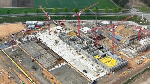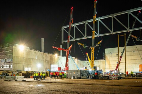 Das erste Hauptfachwerk wiegt 700 t. Es ist 145 m breit und 15 m hoch. Im ersten Schritt werden die vorgefertigten Einzelteile der aufwendigen Konstruktion vor Ort auf der Baustelle miteinander verbunden. Im zweiten Schritt erfolgt der Hub des XXL-Bauteils sowie die Montage an seiner endgültigen Position. Damit das reibungslos gelingt, müssen sechs 650-Tonnen-Spezialkräne die Konstruktion simultan anheben und aufrichten. So geschehen am 10. Dezember 2025. Um diesen Meilenstein innerhalb eines Tages abschließen zu können, begannen die Arbeiten bereits um 3 Uhr in der Nacht.